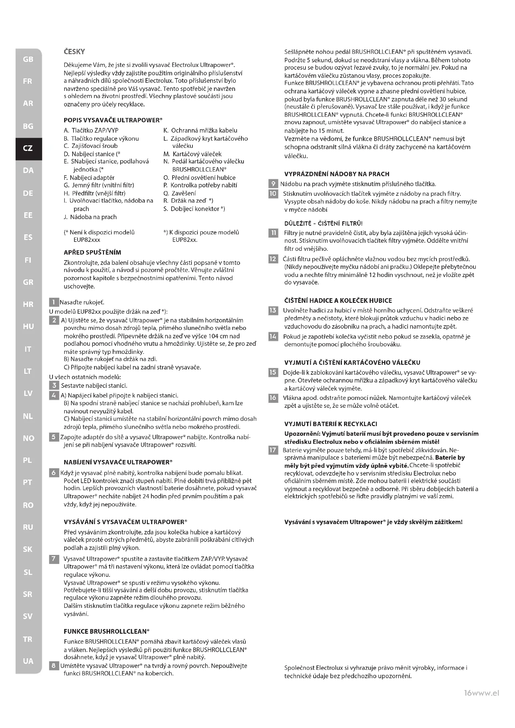 Upozornění: Vyjmutí baterií musí být provedeno pouze v servisním středisku Electrolux nebo v ociálním sběrném místě! 17 Baterie vyjměte pouze tehdy, má-li být spotřebič zlikvidován. Ne- správná manipulace s bateriemi může být nebezpečná. Baterie by měly být před vyjmutím vždy úplně vybité. Chcete-li spotřebič recyklovat, odevzdejte ho v servisním středisku Electrolux nebo ociálním sběrném místě. Zde mohou baterii i elektrické součásti vyjmout a recyklovat bezpečně a odborně. Při sběru dobíjecích baterií a elektrických spotřebičů se řiďte pravidly platnými ve vaší zemi. Vysávání s vysavačem Ultrapower® je vždy skvělým zážitkem!17www.electrolux.com
