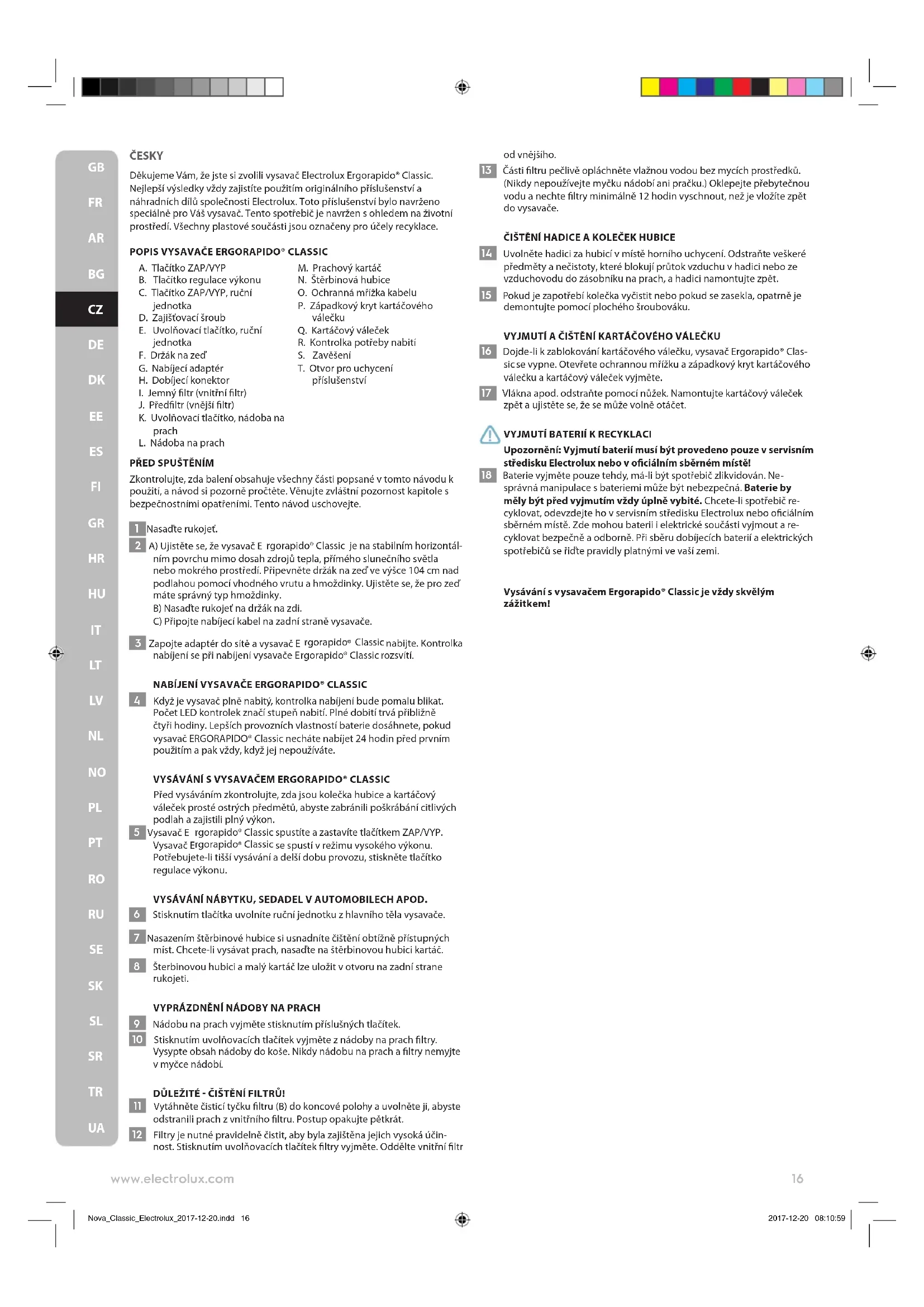 Nova_Classic_Electrolux_2017-12-20.indd 15 2017-12-20 08:10:58ČESKY Děkujeme Vám, že jste si zvolili vysavač Electrolux Ergorapido® Classic. Nejlepší výsledky vždy zajistíte použitím originálního příslušenství a náhradních dílů společnosti Electrolux. Toto příslušenství bylo navrženo speciálně pro Váš vysavač. Tento spotřebič je navržen s ohledem na životní prostředí. Všechny plastové součásti jsou označeny pro účely recyklace.