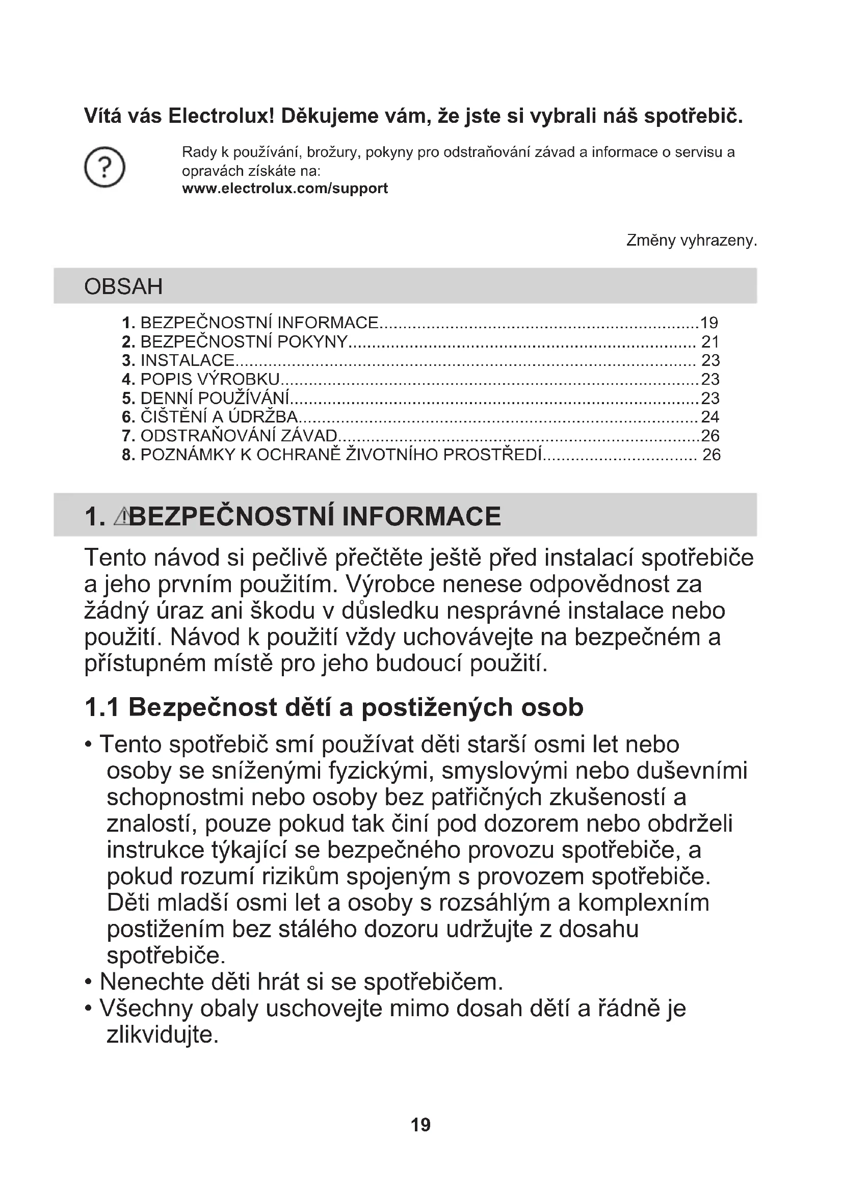 Recyklujte materiály označené symbolem . Obaly vyhoďte do příslušných odpadních kontejnerů k recyklaci. Pomáhejte chránit životní prostředí a lidské zdraví a recyklovat elektrické a elektronické spotřebiče určené k likvidaci. Spotřebiče označené příslušným symbolem nelikvidujte spolu s domovním odpadem. Spotřebič odevzdejte v místním sběrném dvoře nebo kontaktujte místní úřad. 26Velkommen til Electrolux! Tak, fordi du valgte vores produkt. Få råd om brug, brochurer, fejlfinding, service- og reparationsinformation:www.electrolux.com/supportRet til ændringer uden varsel forbeholdes. INDHOLDSFORTEGNELSE