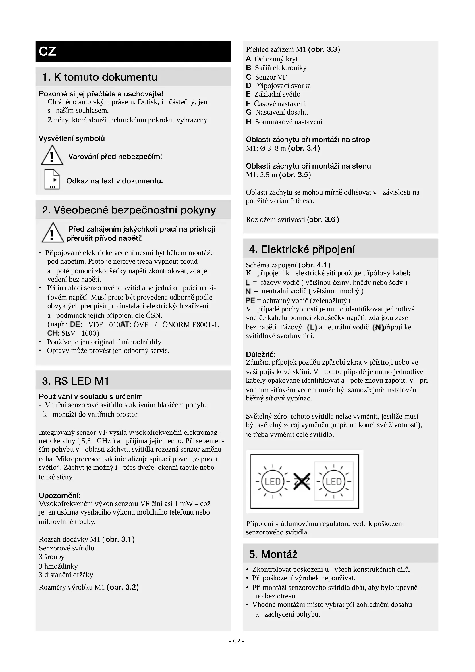 Používání vsouladu surčením - Vnitřní senzorové svítidlo s aktivním hlásičem pohybu kmontáži do vnitřních prostor. Integrovaný senzor VF vysílá vysokofrekvenční elektromag- netické vlny ( 5,8GHz ) apřijímá jejich echo. Při sebemen- ším pohybu voblasti záchytu svítidla rozezná senzor změnu echa. Mikroprocesor pak inicializuje spínací povel „zapnout světlo“. Záchyt je možný ipřes dveře, okenní tabule nebo tenké stěny. Upozornění: Vysokofrekvenční výkon senzoru VF činí asi 1 mW – což je jen tisícina vysílacího výkonu mobilního telefonu nebo mikrovlnné trouby. Rozsah dodávky M1 ( obr.3.1 ) Senzorové svítidlo 3 šrouby 3 hmoždinky 3 distanční držáky Rozměry výrobku M1 ( obr.3.2 ) !- 63 - Postup při montáži
