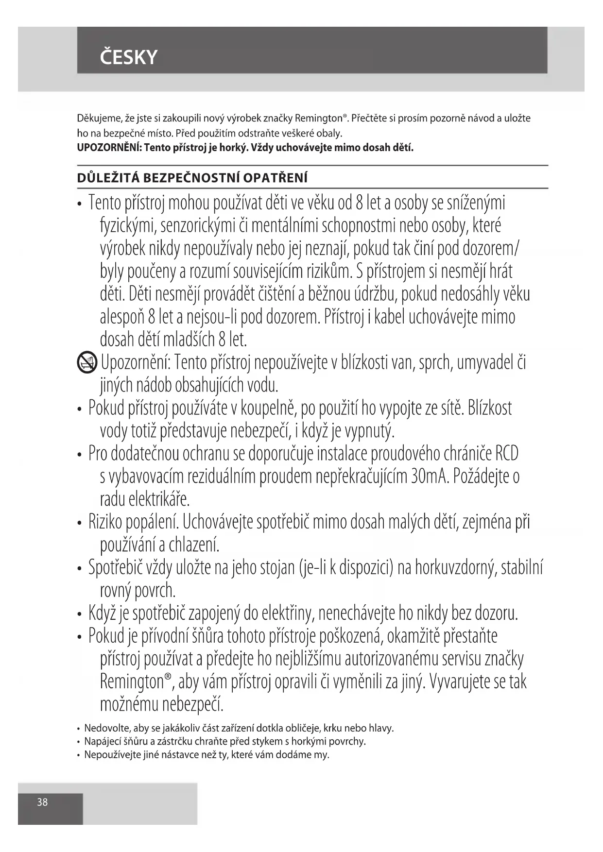 AE38 ČESKY Děkujeme, že jste si zakoupili nový výrobek značky Remington®. Přečtěte si prosím pozorně návod a uložte ho na bezpečné místo. Před použitím odstraňte veškeré obaly. UPOZORNĚNÍ: Tento přístroj je horký. Vždy uchovávejte mimo dosah dětí. DŮLEŽITÁ BEZPEČNOSTNÍ OPATŘENÍ