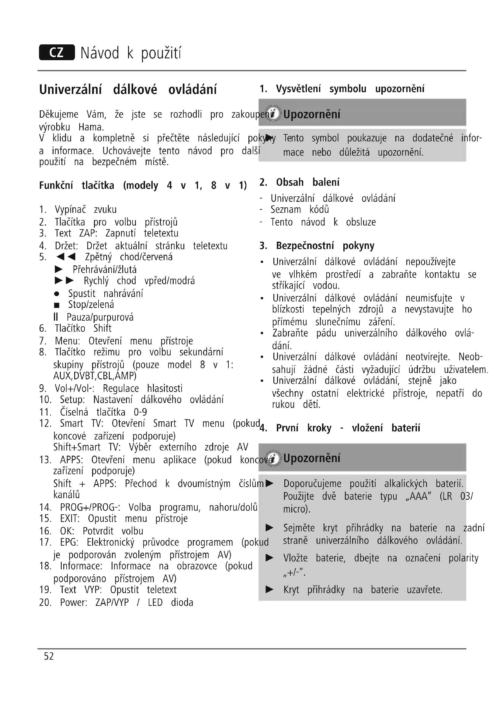 Ochrana životního prostředí: Evropská směrnice 2012/19/EU a 2006/66/EU ustanovujete následující: Elektrická a elektronická zařízení stejně jako baterie nepatří do domovního odpadu. Spotřebitel se zavazuje odevzdat všechna zařízení a baterie po uplynutí jejich životnosti do příslušných sběren. Podrobnosti stanoví zákon příšlušné země. Symbol na produktu, návod k obsluze nebo balení na toto poukazuje. Recyklací a jinými způsoby zužitkování přispíváte k ochraně životního prostředí. 56Univerzálny diaľkový ovládač Ďakujeme Vám, že ste sa rozhodli pre kúpu výrobku Hama. Venujte chvíľu času a prečítajte si všetky nasledujúce pokyny a informácie. Návod na použitie uschovajte na bezpečnom mieste pre prípadné použitie v budúcnosti. Funkčné tlačidlá (modely 4 v 1, 8 v 1)
