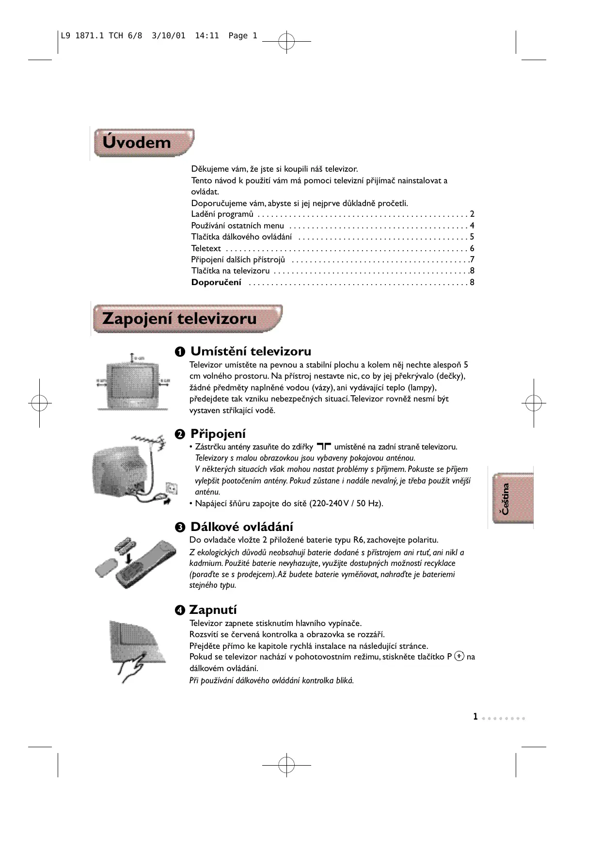 Úvodem Děkujeme vám, že jste si koupili náš televizor. Tento návod k použití vám má pomoci televizní přijímač nainstalovat a ovládat. Doporučujeme vám, abyste si jej nejprve důkladně pročetli. Ladění programů . . . . . . . . . . . . . . . . . . . . . . . . . . . . . . . . . . . . . . . . . . . . . . . 2 Používání ostatních menu . . . . . . . . . . . . . . . . . . . . . . . . . . . . . . . . . . . . . . . . 4 Tlačítka dálkového ovládání . . . . . . . . . . . . . . . . . . . . . . . . . . . . . . . . . . . . . . 5 Teletext . . . . . . . . . . . . . . . . . . . . . . . . . . . . . . . . . . . . . . . . . . . . . . . . . . . . . . 6 Připojení dalších přístrojů . . . . . . . . . . . . . . . . . . . . . . . . . . . . . . . . . . . . . . . .7 Tlačítka na televizoru . . . . . . . . . . . . . . . . . . . . . . . . . . . . . . . . . . . . . . . . . . . .8 Doporučení . . . . . . . . . . . . . . . . . . . . . . . . . . . . . . . . . . . . . . . . . . . . . . . . . 8
