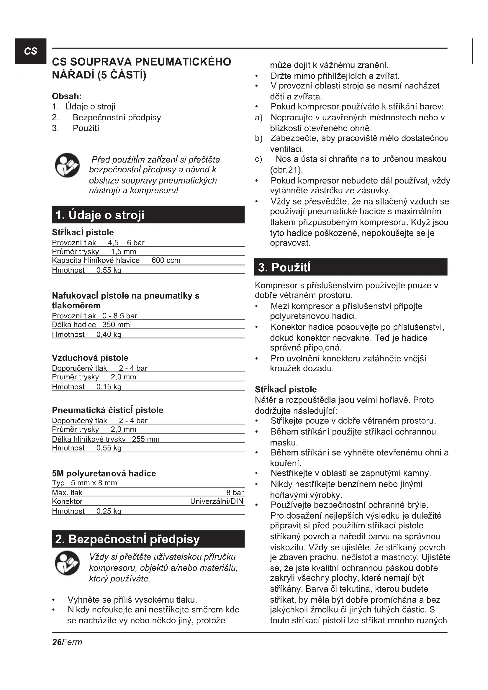 Pred pouzitim zarifzeni si prectete bezpecnostni prdepisy a navod k obsslze soupravy pneumatickych nastroju a kompresoru!