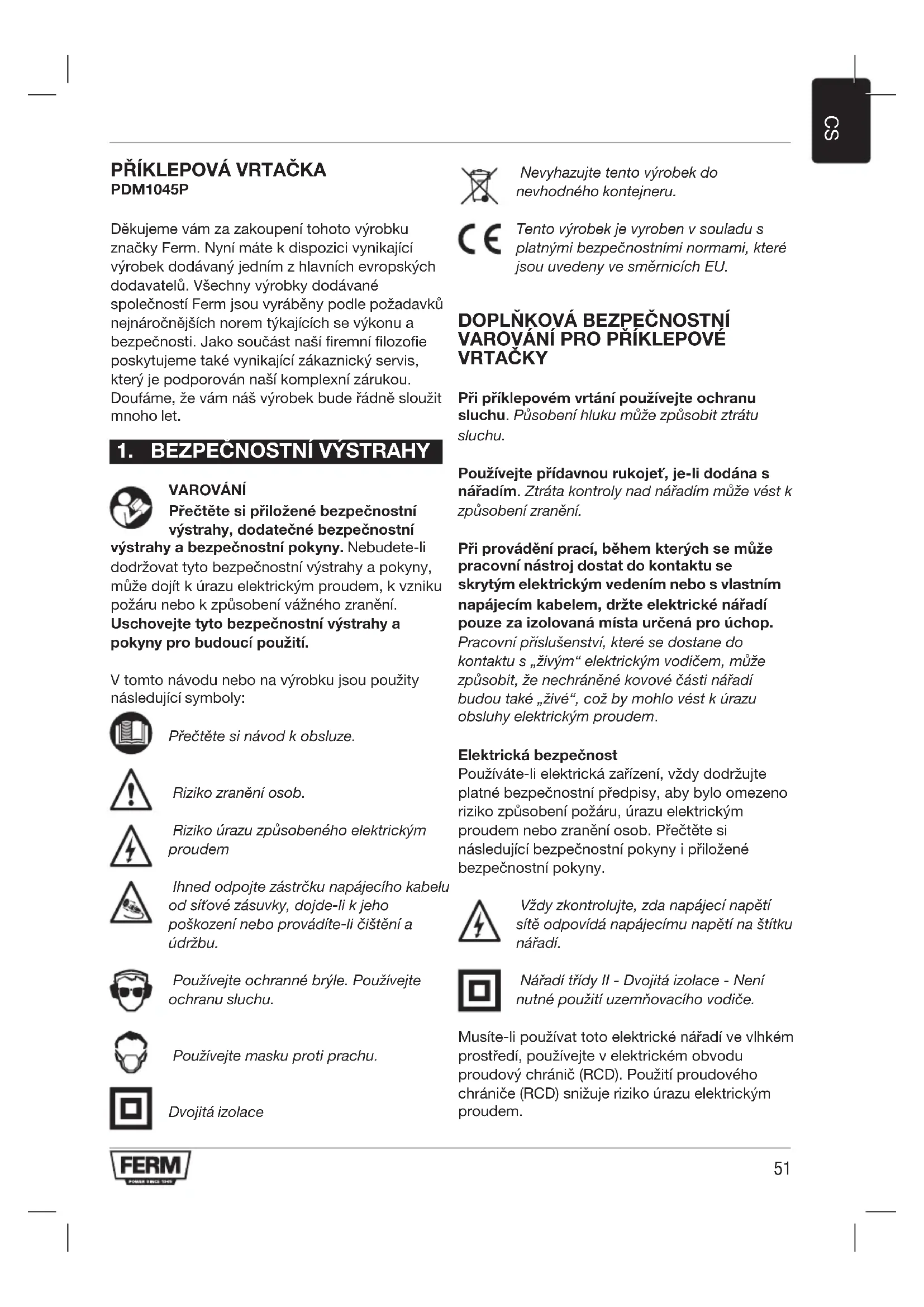 PDM1045P Děkujeme vám za zakoupení tohoto výrobku značky Ferm. Nyní máte k dispozici vynikající výrobek dodávaný jedním z hlavních evropských dodavatelů. Všechny výrobky dodávané společností Ferm jsou vyráběny podle požadavků nejnáročnějších norem týkajících se výkonu a bezpečnosti. Jako součást naší firemní filozofie poskytujeme také vynikající zákaznický servis, který je podporován naší komplexní zárukou. Doufáme, že vám náš výrobek bude řádně sloužit mnoho let.