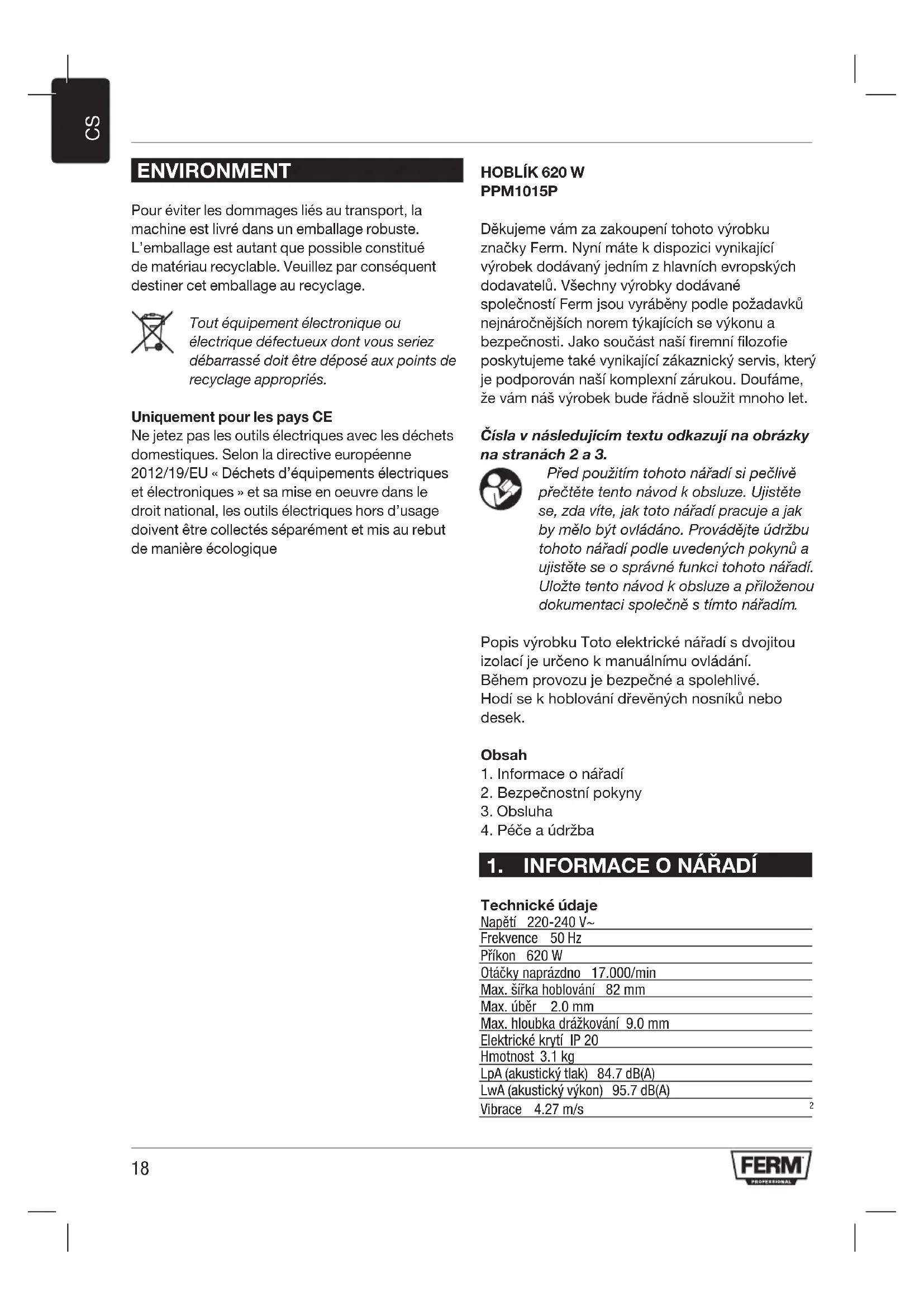PPM1015P Děkujeme vám za zakoupení tohoto výrobku značky Ferm. Nyní máte k dispozici vynikající výrobek dodávaný jedním z hlavních evropských dodavatelů. Všechny výrobky dodávané společností Ferm jsou vyráběny podle požadavků nejnáročnějších norem týkajících se výkonu a bezpečnosti. Jako součást naší firemní filozofie poskytujeme také vynikající zákaznický servis, který je podporován naší komplexní zárukou. Doufáme, že vám náš výrobek bude řádně sloužit mnoho let. Čísla v následujícím textu odkazují na obrázky na stranách 2 a 3. Předpoužitímtohotonářadísipečlivě přečtětetentonávodkobsluze.Ujistěte se,zdavíte,jaktotonářadípracujeajak bymělobýtovládáno.Provádějteúdržbu tohotonářadípodleuvedenýchpokynůa ujistěteseosprávnéfunkcitohotonářadí. Uložtetentonávodkobsluzeapřiloženou dokumentacispolečněstímtonářadím