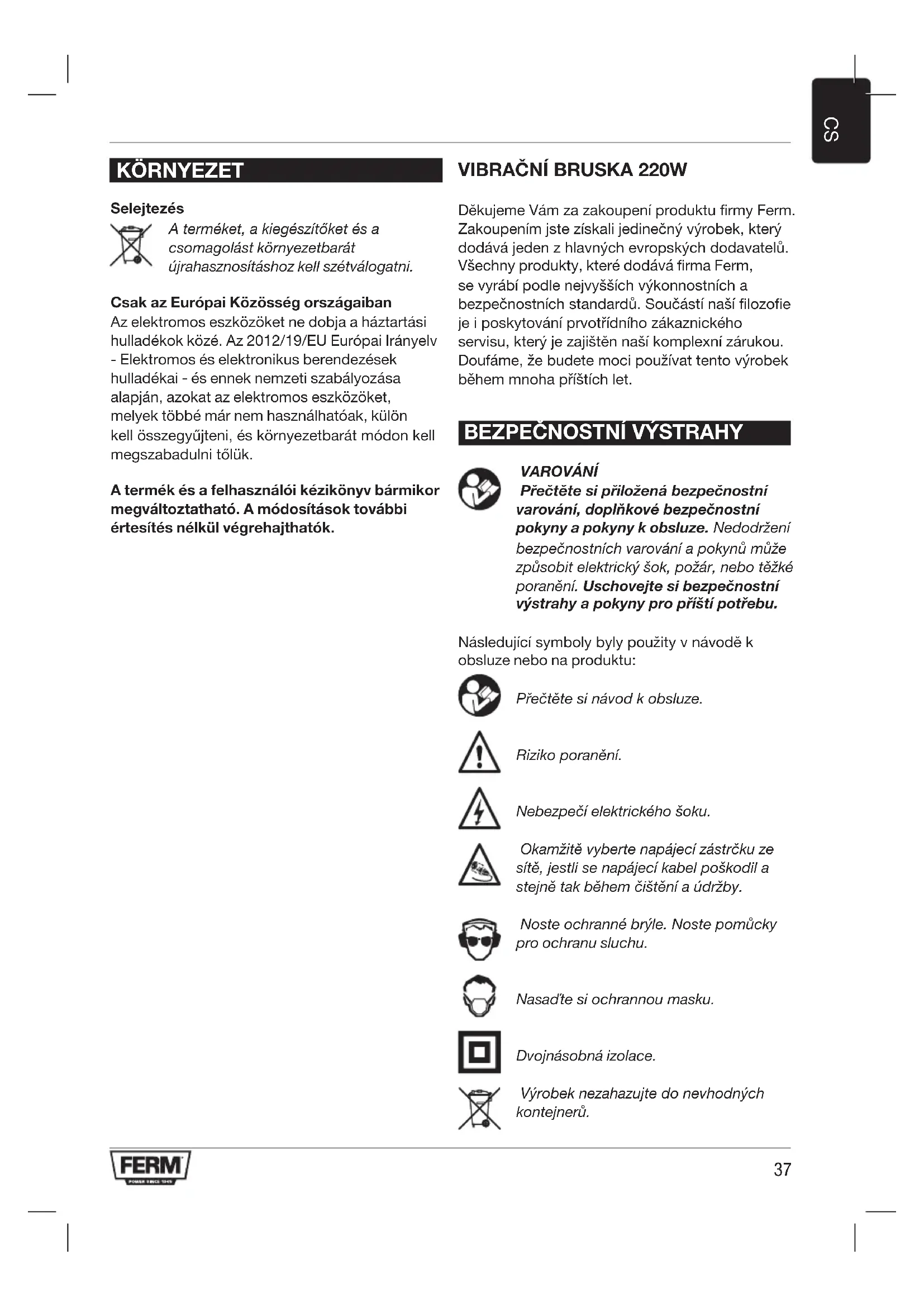 Děkujeme Vám za zakoupení produktu firmy Ferm. Zakoupením jste získali jedinečný výrobek, který dodává jeden z hlavných evropských dodavatelů. Všechny produkty, které dodává firma Ferm, se vyrábí podle nejvyšších výkonnostních a bezpečnostních standardů. Součástí naší filozofie je i poskytování prvotřídního zákaznického servisu, který je zajištěn naší komplexní zárukou. Doufáme, že budete moci používat tento výrobek během mnoha příštích let.