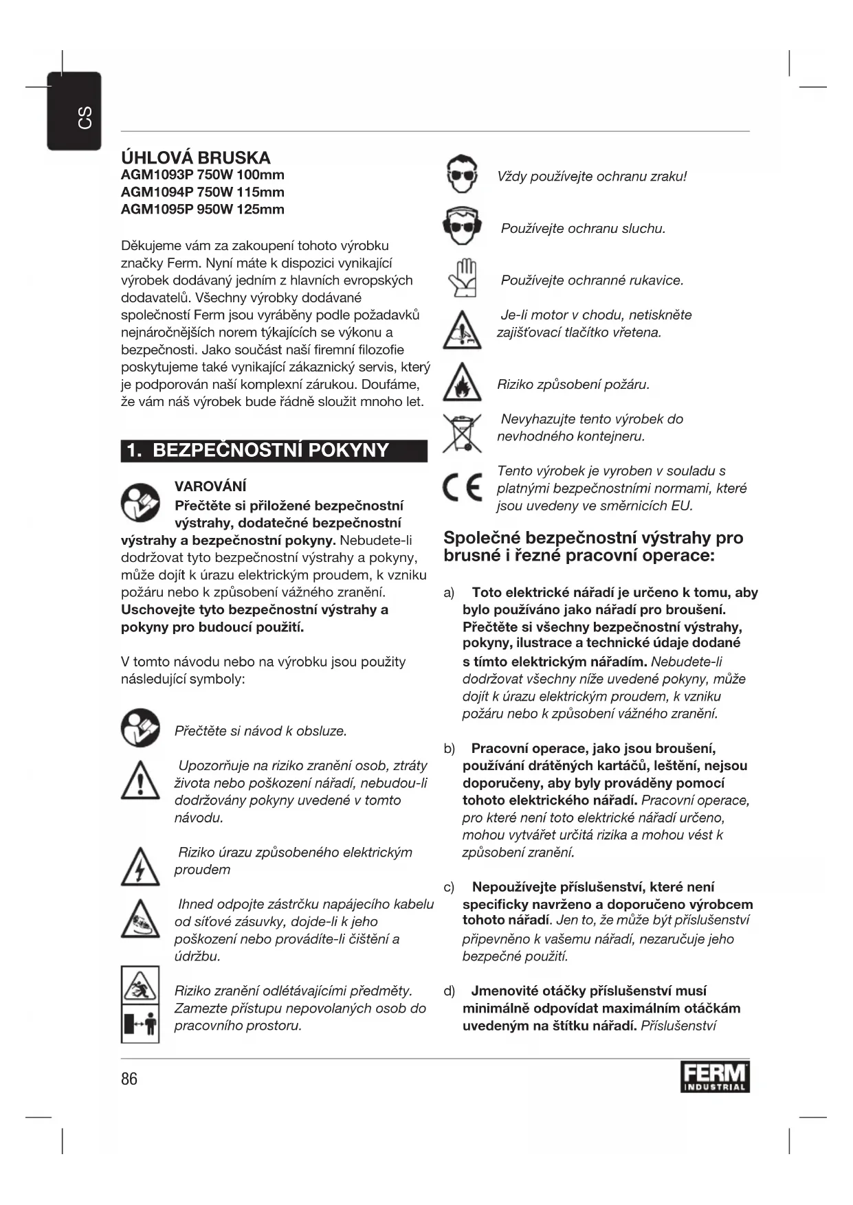 ÚHLOVÁ BRUSKA AGM1093P 750W 100mm AGM1094P 750W 115mm AGM1095P 950W 125mm Děkujeme vám za zakoupení tohoto výrobku značky Ferm. Nyní máte k dispozici vynikající výrobek dodávaný jedním z hlavních evropských dodavatelů. Všechny výrobky dodávané společností Ferm jsou vyráběny podle požadavků nejnáročnějších norem týkajících se výkonu a bezpečnosti. Jako součást naší firemní filozofie poskytujeme také vynikající zákaznický servis, který je podporován naší komplexní zárukou. Doufáme, že vám náš výrobek bude řádně sloužit mnoho let.