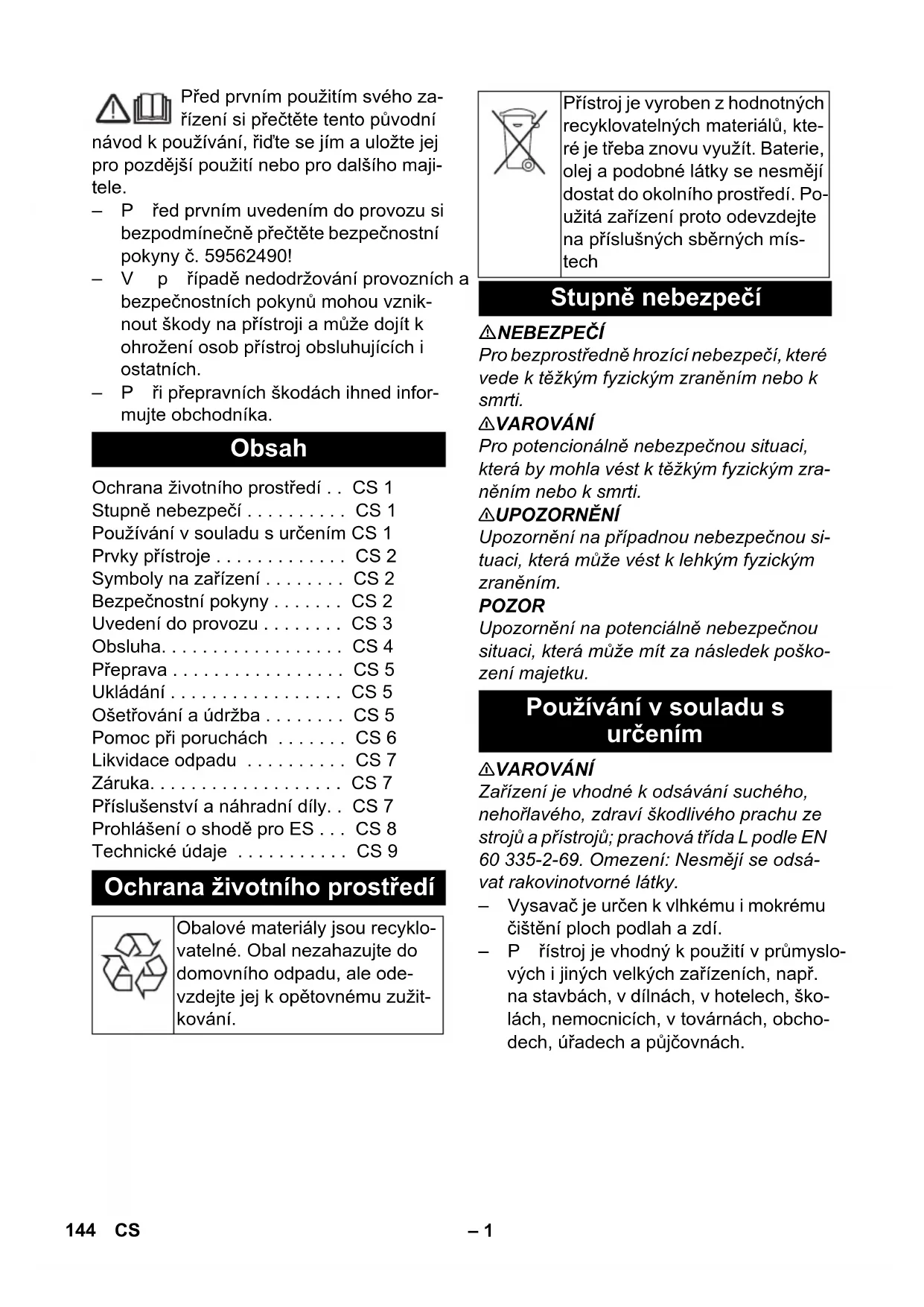 Alkatrész szám Kábelhosszú- ság EU 297.534 7,5 m 143HU– 1 Před prvním použitím svého za- řízení si přečtěte tento původní návod k používání, řiďte se jím a uložte jej pro pozdější použití nebo pro dalšího maji- tele. –Před prvním uvedením do provozu si bezpodmínečně přečtěte bezpečnostní pokyny č. 59562490! –V případě nedodržování provozních a bezpečnostních pokynů mohou vznik- nout škody na přístroji a může dojít k ohrožení osob přístroj obsluhujících i ostatních. –Při přepravních škodách ihned infor- mujte obchodníka. NEBEZPEČÍ Pro bezprostředně hrozící nebezpečí, které vede k těžkým fyzickým zraněním nebo k smrti. 몇 VAROVÁNÍ Pro potencionálně nebezpečnou situaci, která by mohla vést k těžkým fyzickým zra- něním nebo k smrti. 몇 UPOZORNĚNÍ Upozorně ní na případnou nebezpečnou si- tuaci, která může vést k lehkým fyzickým zraněním. POZOR Upozornění na potenciálně nebezpečnou situaci, která může mít za následek poško- zení majetku. 몇 VAROVÁNÍ Zařízení je vhodné k odsávání suchého, nehořlavého, zdraví škodlivého prachu ze strojů a přístrojů; prachová třída L podle EN 60 335-2-69. Omezení: Nesmějí se odsá- vat rakovinotvorné látky. – Vysavač je určen k vlhkému i mokrému čištění ploch podlah a zdí. –Přístroj je vhodný k použití v průmyslo- vých i jiných velkých zařízeních, např. na stavbách, v dílnách, v hotelech, ško- lách, nemocnicích, v továrnách, obcho- dech, úřadech a půjčovnách. Obsah Ochrana životního prostředí . . CS 1 Stupně nebezpečí . . . . . . . . . . CS 1 Používání v souladu s určením CS 1 Prvky přístroje . . . . . . . . . . . . . CS 2 Symboly na zařízení . . . . . . . . CS 2 Bezpečnostní pokyny . . . . . . . CS 2 Uvedení do provozu . . . . . . . . CS 3 Obsluha. . . . . . . . . . . . . . . . . . CS 4 Přeprava . . . . . . . . . . . . . . . . . CS 5 Ukládání . . . . . . . . . . . . . . . . . CS 5 Ošetřování a údržba . . . . . . . . CS 5 Pomoc při poruchách . . . . . . . CS 6 Likvidace odpadu . . . . . . . . . . CS 7 Záruka. . . . . . . . . . . . . . . . . . . CS 7 Příslušenství a náhradní díly. . CS 7 Prohlášení o shodě pro ES . . . CS 8 Technické údaje . . . . . . . . . . . CS 9 Ochrana životního prostředí Obalové materiály jsou recyklo- vatelné. Obal nezahazujte do domovního odpadu, ale ode- vzdejte jej k opětovnému zužit- kování. Přístroj je vyroben z hodnotných recyklovatelných materiálů, kte- ré je třeba znovu využít. Baterie, olej a podobné látky se nesmějí dostat do okolního prostředí. Po- užitá zařízení proto odevzdejte na příslušných sběrných mís- tech Stupně nebezpečí Používání v souladu s určením 144 CS– 2 1 Elektrody 2 Sací hadice 3 Kabelový hák 4 Vývod vzduchu, pracovní vzduch 5 Uzamčení sací hlavy 6 Univerzální adaptér 7Přívod vzduchu, Chladicí vzduch v mo- toru 8 Nádoba na nečistoty 9 Vysávací hlavice 10 Řídicí válec 11 Sací hrdlo 12 Podlahová hubice (není součástí do- dávky) 13 Sací trubka (není součástí dodávky) 14 Držadlo 15 Kryt filtru 16 Násada (není součástí dodávky) 17 Regulátor sací síly (plynule regulovatelné) 18 Otočný regulátor pro nastavení sacího výkonu (min-max). 19 Kontrolka 20 Zásuvka 21 Automatické čištění filtru 22 Hlavní spínač 23 Plochý skládaný filtr 24 Čištění filtru 25 Držák na podlahovou hubici 26 Držák na štěrbinovou hubici 27 Držák na sací trubku 28 Sít'ový kabel 29 typový štítek 몇 VAROVÁNÍ – Je-li odfuk ze zařízení vyveden zpět do místnosti, musí být v místnosti zajištěna dostatečně rychlá výměna vzduchu V. Aby byly dodrženy požadované limitní hodnoty, může objemový průtok přivádě- ný zpět představovat nanejvýše 50% z celkového objemového průtoku čerstvé- ho vzduchu (objem místnosti O
