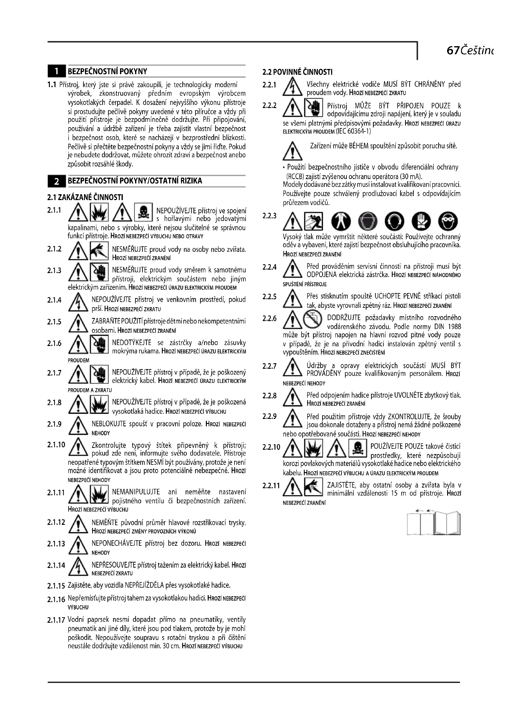 Vysoký tlak může vymrštit některé součásti: Používejte ochranný oděv a vybavení, které zajistí bezpečnost obsluhujícího pracovníka. hrozí neBezpečí zranění Před prováděním servisní činnosti na přístroji musí být ODPOJENA elektrická zástrčka. hrozí neBezpečí náhodného spuštění přístroje Přes stisknutím spouště UCHOPTE PEVNĚ stříkací pistoli tak, abyste vyrovnali zpětný ráz. hrozí neBezpečí zranění