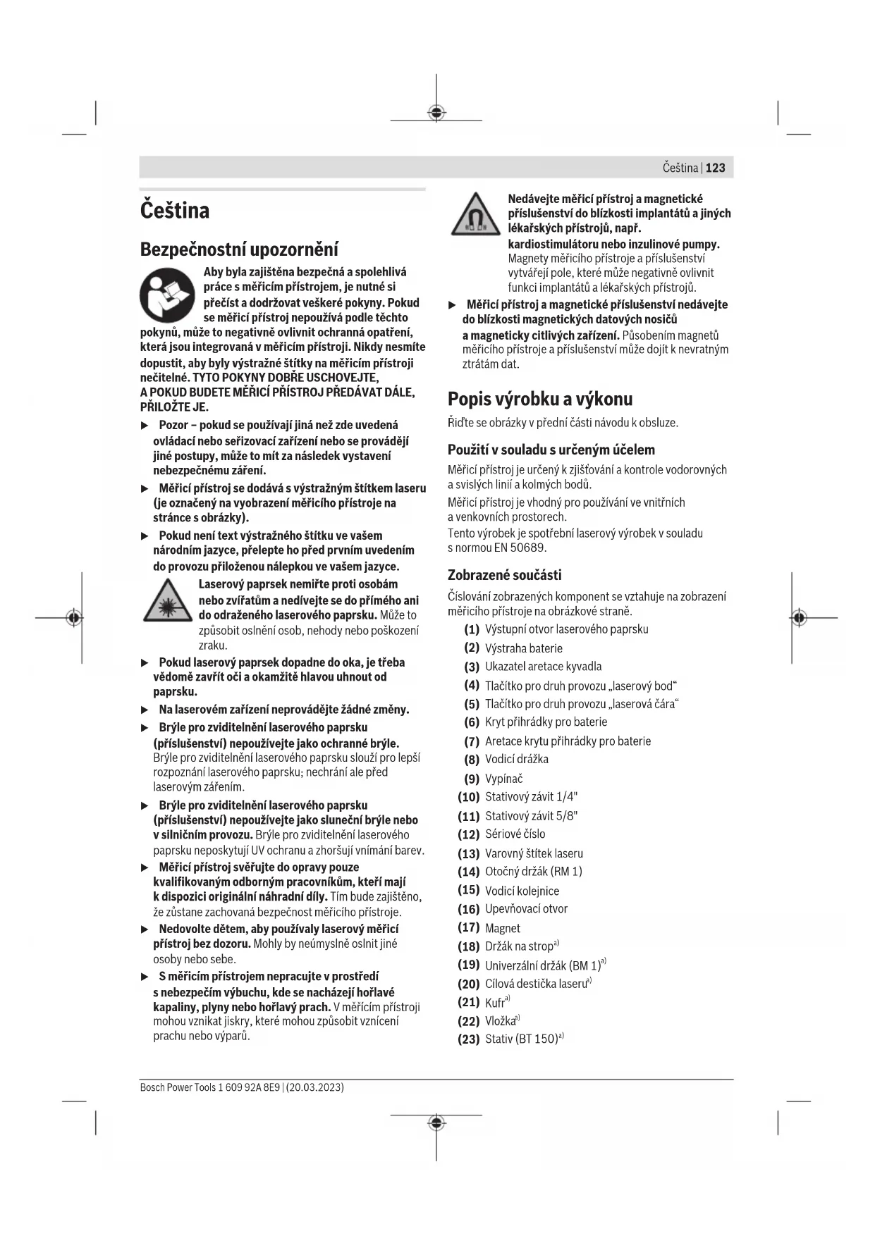 180° – Měřicí přístroj otočte o180°. Umístěte ho tak, aby se střed dolního laserového bodu shodoval sjiž označeným bodemⅡ. Nechte měřicí přístroj znivelovat. Označte střed horního laserového bodu (bodⅢ). – Rozdíld mezi oběma označenými bodyⅠ aⅢ na stropě udává skutečnou odchylku měřicího přístroje od svislé roviny. Maximální přípustnou odchylku vypočítáte následovně: dvojnásobná vzdálenost mezi podlahou astropem×0,7mm/m. Příklad: Při vzdálenosti mezi podlahou astropem 5m smí maximální odchylka činit 2×5m×±0,7mm/m=±7mm. BodyⅠ aⅢ smí tedy být maximálně 7mm od sebe. Pracovní pokyny u Pro označení používejte vždy pouze střed laserového bodu, resp. laserové čáry. Velikost laserového bodu resp. šířka laserové přímky se mění se vzdáleností. Práce se stativem (příslušenství) Stativ poskytuje stabilní, výškově přestavitelný měřicí základ. Nasaďte měřicí přístroj 1/4" upnutím pro stativ (10) na závit stativu (23) nebo běžného fotografického stativu. Pro upevnění na běžný stavební stativ použijte 5/8" upnutí pro stativ(11). Pomocí zajišťovacího šroubu stativu měřicí přístroj přišroubujte. Než zapnete měřicí přístroj, stativ nahrubo vyrovnejte. Bosch Power Tools 1 609 92A 8E9 | (20.03.2023)130 | Slovenčina Upevnění pomocí univerzálního držáku (příslušenství) (viz obrázekG) Pomocí univerzálního držáku(19) můžete měřicí přístroj upevnit např. na svislých plochách nebo magnetických materiálech. Univerzální držák je rovněž vhodný jako podlahový stativ ausnadňuje výškové vyrovnání měřicího přístroje. u Když připevňujete příslušenství na povrch, nedávejte prsty na zadní stranu magnetického příslušenství. Vlivem silné přitažlivé síly magnetů může dojít kuskřípnutí prstů. Než měřicí přístroj zapnete, univerzální držák(19) nahrubo vyrovnejte. Práce scílovou tabulkou laseru (viz obrázekG) Cílová tabulka laseru(20) zlepšuje viditelnost laserového paprsku při nepříznivých podmínkách avětších vzdálenostech. Odrazivá plocha cílové tabulky laseru(20) zlepšuje viditelnost laserové čáry, pomocí průhledné plochy je laserová čára patrná ize zadní strany cílové tabulky laseru. Brýle pro práci slaserem (příslušenství) Brýle pro práci slaserem odfiltrují okolní světlo. Tím se jeví světlo laseru světlejší pro oko. u Brýle pro zviditelnění laserového paprsku (příslušenství) nepoužívejte jako ochranné brýle. Brýle pro zviditelnění laserového paprsku slouží pro lepší rozpoznání laserového paprsku; nechrání ale před laserovým zářením. u Brýle pro zviditelnění laserového paprsku (příslušenství) nepoužívejte jako sluneční brýle nebo vsilničním provozu. Brýle pro zviditelnění laserového paprsku neposkytují UV ochranu azhoršují vnímání barev. Příklady práce (viz obrázky B2–F2, GaH) Příklady možností použití měřicího přístroje naleznete na stránkách sobrázky. Údržba aservis Údržba ačištění Udržujte měřicí přístroj vždy čistý. Měřicí přístroj neponořujte do vody nebo jiných kapalin. Nečistoty otřete vlhkým, měkkým hadříkem. Nepoužívejte čisticí prostředky nebo rozpouštědla. Pravidelně čistěte zejména plochy na výstupním otvoru laseru adávejte pozor na vlákna. Zákaznická služba aporadenství ohledně použití Zákaznická služba zodpoví vaše dotazy kopravě aúdržbě vašeho výrobku atéž knáhradním dílům. Rozkladové výkresy ainformace onáhradních dílech najdete také na: www.bosch-pt.com Vpřípadě dotazů knašim výrobkům apříslušenství vám ochotně pomůže poradenský tým Bosch. Vpřípadě veškerých otázek aobjednávek náhradních dílů bezpodmínečně uveďte 10místné věcné číslo podle typového štítku výrobku. Czech Republic Robert Bosch odbytová s.r.o. Bosch Service Center PT K Vápence 1621/16 692 01 Mikulov Na www.bosch-pt.cz si si můžete objednat opravu Vašeho stroje nebo náhradní díly online. Tel.: +420 519 305700 Fax: +420 519 305705 E-Mail: servis.naradi@cz.bosch.com www.bosch-pt.cz Další adresy servisů najdete na: www.bosch-pt.com/serviceaddresses Likvidace Měřící přístroje, příslušenství a obaly je třeba odevzdat k ekologické recyklaci. Měřicí přístroje abaterie nevyhazujte do domovního odpadu! Pouze pro zeměEU: Podle evropské směrnice 2012/19/EU oodpadních elektrických aelektronických zařízeních ajejího provedení ve vnitrostátním právu se musí již nepoužitelné měřicí přístroje apodle evropské směrnice 2006/66/ES vadné nebo opotřebované akumulátory/baterie shromažďovat odděleně aodevzdat kekologické recyklaci. Při nesprávné likvidaci mohou odpadní elektrická aelektronická zařízení kvůli případnému obsahu nebezpečných látek poškodit životní prostředí alidské zdraví. Slovenčina Bezpečnostné upozornenia Aby bola zaistená bezpečná aspoľahlivá práca smeracím prístrojom, prečítajte si adodržiavajte všetky pokyny. Pokiaľ mera- cí prístroj nebudete používať vsúlade stý- mito pokynmi, môžete nepriaznivo ovplyvniť integrova- né ochranné opatrenia vmeracom prístroji. Nikdy ne- smiete dopustiť, aby boli výstražné štítky na meracom prístroji nečitateľné. TIETO POKYNY DOBRE USCHOVAJ- TE A POKIAĽ BUDETE MERACÍ PRÍSTROJ ODOVZDÁVAŤ ĎALEJ, PRILOŽTE ICH. u Pozor – keď sa používajú iné ovládacie alebo nastavo- vacie zariadenia, ako sú tu uvedené alebo iné postupy, môže to viesť knebezpečnej expozícii žiarením. 1 609 92A 8E9 | (20.03.2023) Bosch Power ToolsSlovenčina | 131 u Merací prístroj sa dodáva svýstražným štítkom lasera (označeným na vyobrazení meracieho prístroja na strane s obrázkami). u Ak text výstražného štítk