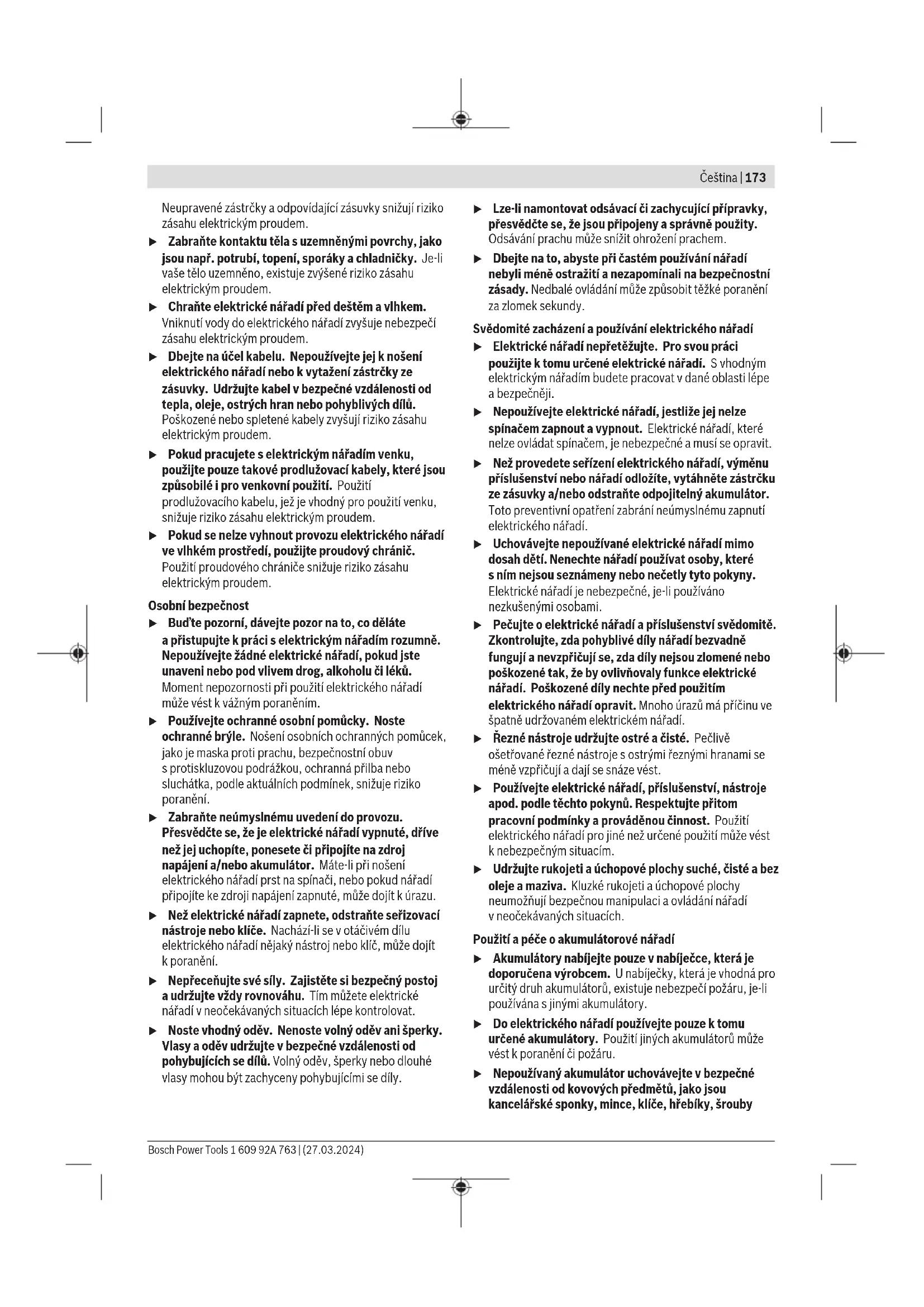 Konstantní elektronika udržuje počet otáček při běhu naprázdno apři zatížení téměř konstantní azaručuje rovnoměrný pracovní výkon. Montáž Montáž ochranného zařízení u Před každou prací na elektronářadí (např. údržba, výměna nástrojů) apři jeho přepravě auskladnění vyjměte akumulátor. Při neúmyslném stisknutí vypínače hrozí nebezpečí poranění. u Před každou prací na elektronářadí vytáhněte zástrčku ze zásuvky. Upozornění: Po prasknutí brusného kotouče během provozu nebo při poškození upínacích přípravků na ochranném krytu/ na elektronářadí se musí elektronářadí neprodleně zaslat zákaznickému servisu, adresy viz část „Zákaznická aporadenská služba“. Ochranný kryt pro broušení Nasaďte ochranný kryt (7) pro upínání na elektronářadí tak, aby kódovací výstupky ochranného krytu souhlasily supínáním. Stiskněte adržte přitom stisknutou odjišťovací páčku (1). Přitlačte ochranný kryt (7) na krk vřetena tak, aby nákružek ochranného krytu dosedal kpřírubě elektronářadí aotáčejte ochranným krytem, dokud slyšitelně nezaskočí. Nastavte polohu ochranného krytu (7) podle požadavků příslušné práce. Odjišťovací páčku (1) 1 609 92A 763 | (27.03.2024) Bosch Power ToolsČeština | 179 stiskněte nahoru aotočte ochranný kryt (7) do požadované polohy. u Ochranný kryt(7) nastavte vždy tak, aby oba výstupky odjišťovací páčky (1) zapadly do příslušných otvorů vochranném krytu (7). u Ochranný kryt (7) nastavte tak, aby jiskry nelétaly směrem kpracovníkovi. u Ochranným krytem(7) musí být možné ve směru otáčení příslušenství otáčet pouze po stisknutí odjišťovací páčky(1) ! Vopačném případě se nesmí elektrické nářadí vžádném případě nadále používat amusí se dát do servisu. Upozornění: Kódovací výstupky na ochranném krytu (7) zabezpečují, že lze namontovat pouze ochranný kryt, který je vhodný pro toto elektronářadí. Odsávací kryt pro broušení Pro bezprašné broušení barev, laků aplastů ve spojení stvrdokovovými hrncovými kotouči(11) můžete použít odsávací kryt(6). Odsávací kryt(6) není vhodný pro broušení kovu. Kodsávacímu krytu(6) lze připojit vhodný vysavač Bosch. Za tímto účelem nasaďte sací hadici sodsávacím adaptérem do příslušného hrdla odsávacího krytu. Ochranný kryt pro dělení u Při dělení používejte vždy ochranný kryt pro dělení(8) nebo ochranný kryt pro broušení (7) společně skrytem pro dělení (9). u Při dělení kamene zajistěte dostatečné odsávání prachu. Ochranný kryt pro dělení(8) se montuje stejně jako ochranný kryt pro broušení(7). Kryt pro dělení zkovu Namontujte kryt pro dělení(9) zkovu na ochranný kryt pro broušení(7) (viz obrázek A): Překlopte přídržný oblouk zpět (➊). Nasaďte kryt(9) na ochranný kryt pro broušení (7) (➋). Přídržný oblouk pevně přitlačte kochrannému krytu(7)