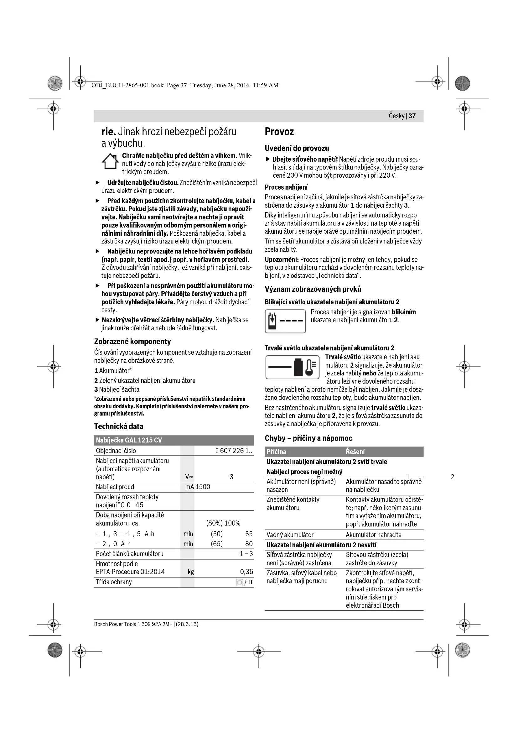 Nabíjecí napětí akumulátoru (automatické rozpoznání napětí) V3,6–12 Nabíjecí proud mA 1500 Dovolený rozsah teploty nabíjení °C 0–45 Doba nabíjení při kapacitě akumulátoru, ca. (80%) 100% –1,3–1,5 Ah min (50) 65 –2,0 Ah min (65) 80 Počet článků akumulátoru 1–3 Hmotnost podle EPTA-Procedure 01:2014 kg 0,36 Třída ochrany / II Příčina Řešení Ukazatel nabíjení akumulátoru 2 svítí trvale Nabíjecí proces není možný Akumulátor není (správně) nasazen Akumulátor nasaďte správně na nabíječku Znečištěné kontakty akumulátoru Kontakty akumulátoru očistě- te; např. několikerým zasunu- tím a vytažením akumulátoru, popř. akumulátor nahraďte Vadný akumulátor Akumulátor nahraďte Ukazatel nabíjení akumulátoru 2 nesvítí Síťová zástrčka nabíječky není (správně) zastrčena Síťovou zástrčku (zcela) zastrčte do zásuvky Zásuvka, síťový kabel nebo nabíječka mají poruchu Zkontrolujte síťové napětí, nabíječku příp. nechte zkont- rolovat autorizovaným servis- ním střediskem pro elektronářadí Bosch OBJ_BUCH-2865-001.book Page 37 Tuesday, June 28, 2016 11:59 AM38 | Slovensky 1 609 92A 2MH | (28.6.16) Bosch Power Tools Pracovní pokyny Při nepřetržitých popř. několikrát po sobě následujících nabí- jecích cyklech bez přerušení se může nabíječka zahřát. To však není znepokojující a nepoukazuje to na technickou záva- du nabíječky. Výrazně nižší provozní doba po nabití ukazuje, že je akumulá- tor opotřebován a musí být vyměněn. Údržba a servis Je-li nutné nahrazení přívodního kabelu, pak to nechte kvůli zamezení ohrožení bezpečnosti provést firmou Bosch nebo autorizovaným servisem pro elektronářadí Bosch. Zákaznická a poradenská služba Zákaznická služba zodpoví Vaše dotazy k opravě a údržbě Va- šeho výrobku a též k náhradním dílům. Technické výkresy a in- formace k náhradním dílům naleznete i na: www.bosch-pt.com Tým poradenské služby Bosch Vám rád pomůže při otázkách k našim výrobkům a jejich příslušenství. V případě veškerých otázek a objednávek náhradních dílů bezpodmínečně uveďte 10místné věcné číslo podle typového štítku výrobku. Czech Republic Robert Bosch odbytová s.r.o. Bosch Service Center PT K Vápence 1621/16 692 01 Mikulov Na www.bosch-pt.cz si si můžete objednat opravu Vašeho stroje nebo náhradní díly online. Tel.: 519 305700 Fax: 519 305705 E-Mail: servis.naradi@cz.bosch.com www.bosch.cz Zpracování odpadů Nabíječky, příslušenství a obaly by měly být dodány k opětov- nému zhodnocení nepoškozujícímu životní prostředí. Nevyhazujte nabíječky do domovního odpadu! Pouze pro země EU: Podle evropské směrnice 2012/19/EU o starých elektrických a elektronických zaříze- ních a jejím prosazení v národních zákonech musí být neupotřebitelné nabíječky roze- brané shromážděny a dodány k opětovnému zhodnocení nepoškozujícímu životní pro- středí. Změny vyhrazeny. Slovensky Popis produktu a výkonu Prečítajte si všetky Výstraž- né upozornenia a bezpeč- nostné pokyny. Zanedbanie dodržiavania Výstražných upo- zornení a pokynov uvedených v nasledujúcom texte môže mať za následok zásah elektric- kým prúdom, spôsobiť požiar a/alebo ťažké poranenie. Tieto pokyny a bezpečnostné predpisy starostlivo uscho- vajte. Nabíjačku používajte len v takom prípade, ak viete kompletne ohodnotiť a bez obmedzenia uskutočniť všetky funkcie, alebo ak ste dostali príslušné pokyny. Bezpečnostné pokyny Táto nabíjačka nie je určená na to, aby ju používali deti a osoby s obmedzenými fyzickými, zmyslo- vými alebo duševnými schopnosťa- mi alebo nedostatočnými skúse- nosťami a znalosťami. Túto nabí- jačku môžu používať deti od 8 ro- kov a osoby s obmedzenými fyzic- kými, zmyslovými alebo duševný- mi schopnosťami alebo s nedostatočnými skúsenosťami a vedomosťami vtedy, keď sú pod dozorom osoby zodpovednej za ich bezpečnosť alebo ak ich táto osoba poučila o bezpečnom zaobchádza- ní s nabíjačkou a chápu nebezpe- čenstvá, ktoré sú s tým spojené. V opačnom prípade existuje riziko chybnej obsluhy a vzniku poranení. Pri používaní, čistení a údržbe dá- vajte na deti pozor. Zabezpečí sa tým, že sa deti nebudú s nabíjačkou hrať. Nabíjajte len lítium-iónové akumu- látory Bosch s kapacitou od 1,3 Ah (od 1 akumulátorových článkov). OBJ_BUCH-2865-001.book Page 38 Tuesday, June 28, 2016 11:59 AMSlovensky | 39 Bosch Power Tools 1 609 92A 2MH | (28.6.16) Napätie akumulátora sa musí zho- dovať s nabíjacím napätím nabíjač- ky. Nenabíjajte nenabíjacie baté- rie. Inak hrozí nebezpečenstvo požia- ru a výbuchu. Chráňte nabíjačku pred účinkami dažďa a vlh- kosti. Vniknutie vody do nabíjačky zvyšuje riziko zásahu elektrickým prúdom. Udržiavajte nabíjačku v čistote. Následkom znečistenia hrozí nebezpečenstvo zásahu elektrickým prúdom. Pred každým použitím produktu prekontrolujte nabí- jačku, prívodnú šnúru aj zástrčku. Nepoužívajte nabí- jačku v prípade, ak ste zistili nejaké poškodenie. Nabí- jačku sami neotvárajte a dávajte ju opravovať len kva- lifikovanému personálu a výlučne iba s použitím origi- nálnych náhradných súčiastok. Poškodené nabíjačky, prívodné šnúry a zástrčky zvyšujú riziko zásahu elektric- kým prúdom. Nepoužívajte nabíjačku položenú na ľahko horľavom podklade (ako je napr. papier, textil a podobne) resp. ani v horľavom prostredí. Zohrievanie nabíjačky, ktoré vzniká pri nabíjaní, predstavuje nebezpečenstvo požiaru. Po poškodení akumulátora alebo v prípade neodborné- ho používania môžu z akumulátora vystupovať škodlivé výpary. Zabezpečte prívod čerstvého vzduchu a v prí- pade nevoľnosti vyhľada