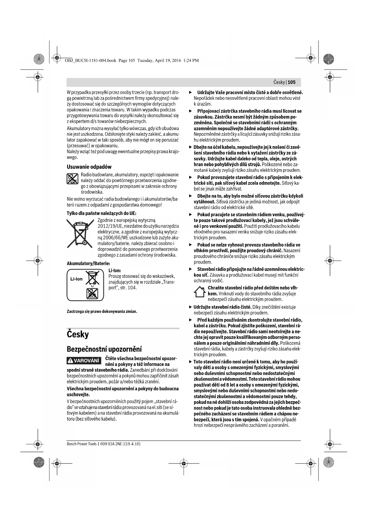 Akumulator jest zbyt gorący lub zbyt zimny (świeci się ostrzeżenie termiczne k) Odczekać, aby akumulator osiągnął właściwą tempera- turę roboczą Zasilanie energią elektryczną urządzeń zewnętrznych nie funkcjonuje Wtyczka nie jest włączona Włożyć (całkowicie) wtyczkę do gniazdka Przyłącze 12 V nie działa Bezpiecznik 32 nie jest wmontowany Włożyć bezpiecznik 32 Bezpiecznik 32 zadziałał Wymienić bezpiecznik 32 Zadziałało wewnętrzne za- bezpieczenie termiczne Usunąć zewnętrzne urządze- nie i doprowadzić do ochło- dzenia radioodbiornika Radioodbiornik nieoczekiwanie przestaje działać Wtyczka lub akumulator nie zostały włożone, lub uczynio- ne zostało to niedokładnie Całkowicie włożyć wtyczkę bądź akumulator Błędy w oprogramowaniu Aby zresetować oprogra- mowanie, należy wyjąć wtyczkę z gniazdka lub usu- nąć akumulator, a następnie – po odczekaniu 30 sekund – ponownie włożyć wtyczkę lub akumulator na miejsce. Zły odbiór radiowy Zakłócenia spowodowane in- nymi urządzeniami lub nieko- rzystnymi warunkami w miejscu umieszczenia ra- dioodbiornika Umieścić radioodbiornik w in- nym miejscu, gdzie jest lepszy odbiór względnie zachować większy odstęp do innych urządzeń elektronicznych lub od gniazdek sieciowych Zakłócenia w wyświetlaniu czasu Baterie buforowe dla zegara wyładowały się Wymienić baterie buforowe Niewłaściwie ułożone baterie (bieguny) Baterie buforowe ułożyć we wnęce zważając na zachowanie właściwej biegu- nowości Przyczyna Usuwanie błędu OBJ_BUCH-1181-004.book Page 104 Tuesday, April 19, 2016 1:24 PMČesky | 105 Bosch Power Tools 1 609 92A 2NE | (19.4.16) W przypadku przesyłki przez osoby trzecie (np. transport dro- gą powietrzną lub za pośrednictwem firmy spedycyjnej) nale- ży dostosować się do szczególnych wymogów dotyczących opakowania i znaczenia towaru. W takim wypadku podczas przygotowywania towaru do wysyłki należy skonsultować się z ekspertem d/s towarów niebezpiecznych. Akumulatory można wysyłać tylko wówczas, gdy ich obudowa nie jest uszkodzona. Odsłonięte styki należy zakleić, a akumu- lator zapakować w taki sposób, aby nie mógł on się poruszać (przesuwać) w opakowaniu. Należy wziąć też pod uwagę ewentualne przepisy prawa krajo- wego. Usuwanie odpadów Radio budowlane, akumulatory, osprzęt i opakowanie należy oddać do powtórnego przetworzenia zgodne- go z obowiązującymi przepisami w zakresie ochrony środowiska. Nie wolno wyrzucać radia budowlanego i i akumulatorów/ba- terii razem z odpadami z gospodarstwa domowego! Tylko dla państw należących do UE: Zgodnie z europejską wytyczną 2012/19/UE, niezdatne do użytku narzędzia elektryczne, a zgodnie z europejską wytycz- ną 2006/66/WE uszkodzone lub zużyte aku- mulatory/baterie, należy zbierać osobno i doprowadzić do ponownego przetworzenia zgodnego z zasadami ochrony środowiska. Akumulatory/Baterie: Li-Ion: Proszę stosować się do wskazówek, znajdujących się w rozdziale „Trans- port“, str. 104. Zastrzega się prawo dokonywania zmian. Česky Bezpečnostní upozornění Čtěte všechna bezpečnostní upozor- nění a pokyny a též informace na spodní straně stavebního rádia. Zanedbání při dodržování bezpečnostních upozornění a pokynů mohou zapříčinit zásah elektrickým proudem, požár a/nebo těžká zranění. Všechna bezpečnostní upozornění a pokyny do budoucna uschovejte. V bezpečnostních upozorněních použitý pojem „stavební rá- dio“ se vztahuje na stavební rádia provozovaná na el.síti (se sí- ťovým kabelem) a na stavební rádia provozovaná na akumulá- toru (bez síťového kabelu). Udržujte Vaše pracovní místo čisté a dobře osvětlené. Nepořádek nebo neosvětlené pracovní oblasti mohou vést k úrazům. Připojovací zástrčka stavebního rádia musí lícovat se zásuvkou. Zástrčka nesmí být žádným způsobem po- změněna. Společně se stavebními rádii s ochranným uzemněním nepoužívejte žádné adaptérové zástrčky. Nepozměněné zástrčky a lícující zásuvky snižují riziko zása- hu elektrickým proudem. Dbejte na účel kabelu, nepoužívejte jej k nošení či zavě- šení stavebního rádia nebo k vytažení zástrčky ze zá- suvky. Udržujte kabel daleko od tepla, oleje, ostrých hran nebo pohyblivých dílů strojů. Poškozené nebo za- motané kabely zvyšují riziko zásahu elektrickým proudem. Pokud provozujete stavební rádio s připojením k elek- trické síti, pak síťový kabel zcela odmotejte. Síťový ka- bel se jinak může zahřívat. Dbejte na to, aby bylo možné síťovou zástrčku kdykoli vytáhnout. Síťová zástrčka je jediná možnost, jak odpojit stavební rádio od elektrické sítě. Pokud pracujete se stavebním rádiem venku, používej- te pouze takové prodlužovací kabely, jež jsou schvále- né i pro venkovní použití. Použití prodlužovacího kabelu vhodného pro nasazení venku snižuje riziko zásahu elek- trickým proudem. Pokud se nelze vyhnout provozu stavebního rádia ve vlhkém prostředí, použijte proudový chránič. Nasazení proudového chrániče snižuje riziko zásahu elektrickým proudem. Stavební rádio připojujte na řádně uzemněnou elektric- kou síť. Zásuvka a prodlužovací kabel musejí mít funkční ochranný vodič. Chraňte stavební rádio před deštěm nebo vlh- kem. Vniknutí vody do stavebního rádia zvyšuje nebezpečí zásahu elektrickým proudem. Udržujte stavební rádio čisté. Díky znečištění existuje nebezpečí zásahu elektrickým proudem. Před každým používáním zkontrolujte stavební rádio, kabel a zástrčku. Pokud zjistíte poškození, stavební rá- dio nepoužívejte. Stavební rádio sami neotvírejte a ne- chte jej opravit pouze kvalifikovaným odborným perso- nálem a pouze originálními náhradními díly. Poškozená stavební rádia, kabely