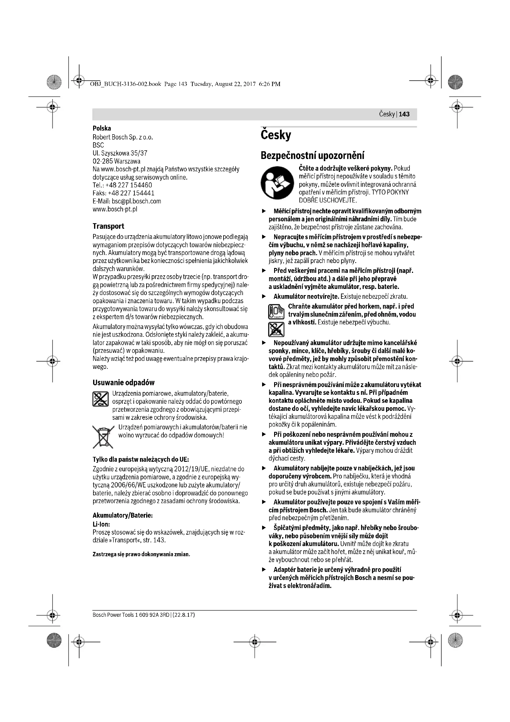 30 5,1 x 3,8 OBJ_BUCH-3136-002.book Page 142 Tuesday, August 22, 2017 6:26 PMČesky | 143 Bosch Power Tools 1 609 92A 3RD | (22.8.17) Polska Robert Bosch Sp. z o.o. BSC Ul. Szyszkowa 35/37 02-285 Warszawa Na www.bosch-pt.pl znajdą Państwo wszystkie szczegóły dotyczące usług serwisowych online. Tel.: +48 227 154460 Faks: +48 227 154441 E-Mail: bsc@pl.bosch.com www.bosch-pt.pl Transport Pasujące do urządzenia akumulatory litowo jonowe podlegają wymaganiom przepisów dotyczących towarów niebezpiecz- nych. Akumulatory mogą być transportowane drogą lądową przez użytkownika bez konieczności spełnienia jakichkolwiek dalszych warunków. W przypadku przesyłki przez osoby trzecie (np. transport dro- gą powietrzną lub za pośrednictwem firmy spedycyjnej) nale- ży dostosować się do szczególnych wymogów dotyczących opakowania i znaczenia towaru. W takim wypadku podczas przygotowywania towaru do wysyłki należy skonsultować się z ekspertem d/s towarów niebezpiecznych. Akumulatory można wysyłać tylko wówczas, gdy ich obudowa nie jest uszkodzona. Odsłonięte styki należy zakleić, a akumu- lator zapakować w taki sposób, aby nie mógł on się poruszać (przesuwać) w opakowaniu. Należy wziąć też pod uwagę ewentualne przepisy prawa krajo- wego. Usuwanie odpadów Urządzenia pomiarowe, akumulatory/baterie, osprzęt i opakowanie należy oddać do powtórnego przetworzenia zgodnego z obowiązującymi przepi- sami w zakresie ochrony środowiska. Urządzeń pomiarowych i akumulatorów/baterii nie wolno wyrzucać do odpadów domowych! Tylko dla państw należących do UE: Zgodnie z europejską wytyczną 2012/19/UE, niezdatne do użytku urządzenia pomiarowe, a zgodnie z europejską wy- tyczną 2006/66/WE uszkodzone lub zużyte akumulatory/ baterie, należy zbierać osobno i doprowadzić do ponownego przetworzenia zgodnego z zasadami ochrony środowiska. Akumulatory/Baterie: Li-Ion: Proszę stosować się do wskazówek, znajdujących się w roz- dziale »Transport«, str. 143. Zastrzega się prawo dokonywania zmian. Česky Bezpečnostní upozornění Čtěte a dodržujte veškeré pokyny. Pokud měřicí přístroj nepoužíváte v souladu s těmito pokyny, můžete ovlivnit integrovaná ochranná opatření v měřicím přístroji. TYTO POKYNY DOBŘE USCHOVEJTE. Měřící přístroj nechte opravit kvalifikovaným odborným personálem a jen originálními náhradními díly. Tím bude zajištěno, že bezpečnost přístroje zůstane zachována. Nepracujte s měřícím přístrojem v prostředí s nebezpe- čím výbuchu, v němž se nacházejí hořlavé kapaliny, plyny nebo prach. V měřícím přístroji se mohou vytvářet jiskry, jež zapálí prach nebo plyny. Před veškerými pracemi na měřicím přístroji (např. montáží, údržbou atd.) a dále při jeho přepravě a uskladnění vyjměte akumulátor, resp. baterie. Akumulátor neotvírejte. Existuje nebezpečí zkratu. Chraňte akumulátor před horkem, např. i před trvalým slunečním zářením, před ohněm, vodou a vlhkostí. Existuje nebezpečí výbuchu. Nepoužívaný akumulátor udržujte mimo kancelářské sponky, mince, klíče, hřebíky, šrouby či další malé ko- vové předměty, jež by mohly způsobit přemostění kon- taktů. Zkrat mezi kontakty akumulátoru může mít za násle- dek opáleniny nebo požár. Při nesprávném používání může z akumulátoru vytékat kapalina. Vyvarujte se kontaktu s ní. Při případném kontaktu opláchněte místo vodou. Pokud se kapalina dostane do očí, vyhledejte navíc lékařskou pomoc. Vy- tékající akumulátorová kapalina může vést k podráždění pokožky či k popáleninám. Při poškození nebo nesprávném používání mohou z akumulátoru unikat výpary. Přivádějte čerstvý vzduch a při obtížích vyhledejte lékaře. Výpary mohou dráždit dýchací cesty. Akumulátory nabíjejte pouze v nabíječkách, jež jsou doporučeny výrobcem. Pro nabíječku, která je vhodná pro určitý druh akumulátorů, existuje nebezpečí požáru, pokud se bude používat s jinými akumulátory. Akumulátor používejte pouze ve spojení s Vaším měři- cím přístrojem Bosch. Jen tak bude akumulátor chráněný před nebezpečným přetížením. Špičatými předměty, jako např. hřebíky nebo šroubo- váky, nebo působením vnější síly může dojít k poškození akumulátoru. Uvnitř může dojít ke zkratu a akumulátor může začít hořet, může z něj unikat kouř, mů- že vybouchnout nebo se přehřát. Adaptér baterie je určený výhradně pro použití v určených měřicích přístrojích Bosch a nesmí se pou- žívat s elektronářadím. OBJ_BUCH-3136-002.book Page 143 Tuesday, August 22, 2017 6:26 PM144 | Česky 1 609 92A 3RD | (22.8.17) Bosch Power Tools Pokud měřící přístroj delší dobu nepoužíváte, vyjměte z něj baterie. Baterie mohou pří delším skladování koro- dovat a samy se vybít. Chraňte měřicí přístroj, zejména oblast kamery a infračervené čočky, před vlhkostí a sněhem. Přijímací čočka by se mohla zamlžit a zkreslit výsledky měření. Ne- správné nastavení přístroje a další atmosférické ovlivňující faktory mohou vést k nesprávnému měření. Objekty by mohly být znázorněné teplejší nebo studenější, což může být při dotyku nebezpečné. Velké rozdíly teplot v termogramu mohou vést k tomu, že jsou dokonce i vysoké teploty znázorněné barvou, která je spojována s nízkými teplotami. Při kontaktu s takovou plochou může dojít k popálení! Správné měření teploty je možné pouze tehdy, když se shoduje nastavená emisivita a emisivita objektu. Ob- jekty by mohly být pomocí teploty a/nebo barvy znázorně- né teplejší nebo studenější, což může být při dotyku nebez- pečné. Pozor! Při používání měřicího přístroje s Bluetooth® může docházet k rušení jiných přís