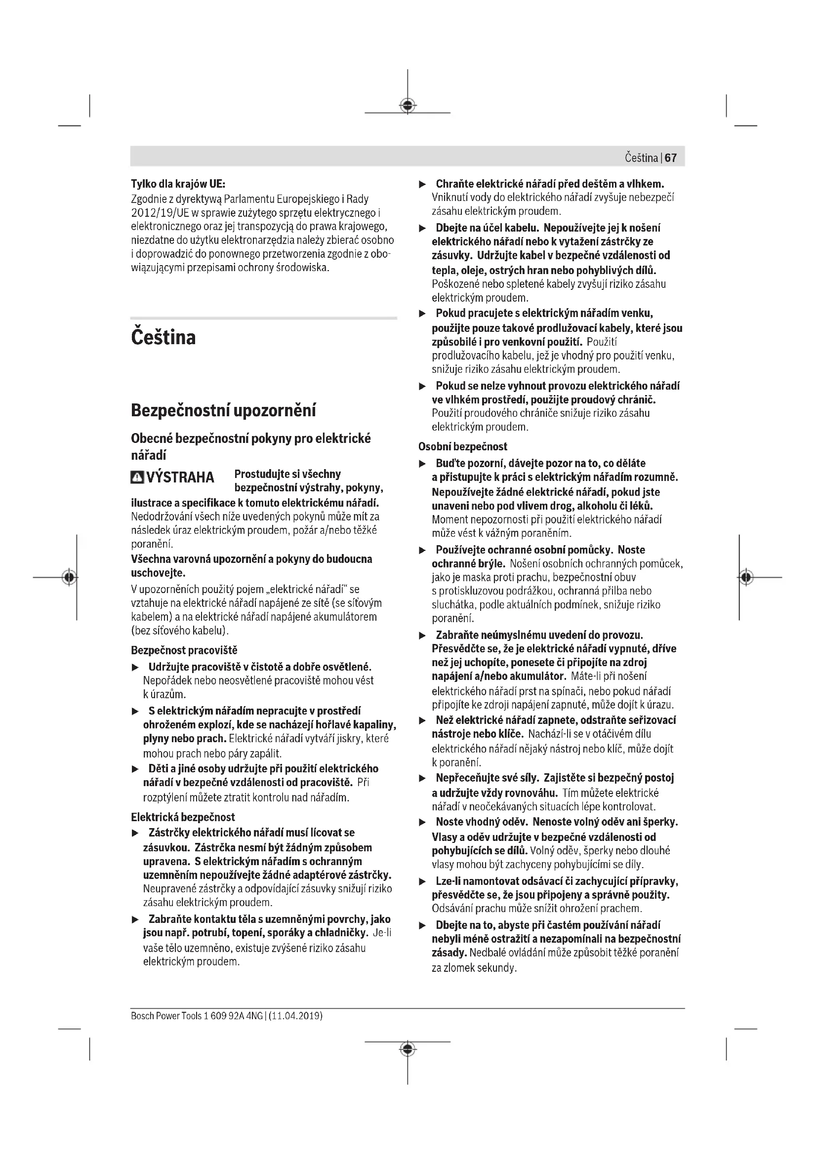 < 2,5 1,5 < 2,5 1,5 3,3 1,5 Úroveň vibrací aúroveň hluku, které jsou uvedené vtěchto pokynech, byly změřeny pomocí normované měřicí metody alze je použít pro vzájemné porovnání elektronářadí. Hodí se ipro předběžný odhad zatížení vibracemi ahlukem. Uvedená úroveň vibrací aúroveň hluku reprezentuje hlavní použití elektronářadí. Pokud se ovšem bude elektronářadí používat pro jiné práce, sjinými nástroji nebo snedostatečnou údržbou, může se úroveň hluku aúroveň vibrací lišit. To může zatížení vibracemi ahlukem po celou pracovní dobu zřetelně zvýšit. Pro přesný odhad zatížení vibracemi ahlukem by měly být zohledněny idoby, kdy je nářadí vypnuté nebo běží, ale ve skutečnosti se nepoužívá. To může zatížení vibracemi ahlukem po celou pracovní dobu výrazně snížit. Stanovte dodatečná bezpečnostní opatření kochraně obsluhy před účinky vibrací, jako je např. údržba elektronářadí anástrojů, udržování teplých rukou, organizace pracovních procesů. Montáž u Před každou prací na elektronářadí vytáhněte zástrčku ze zásuvky. Bosch Power Tools 1 609 92A 4NG | (11.04.2019)70 | Čeština Výměna nástroje (viz obrázek A) Sejměte hloubkový doraz (4) směrem dopředu. Vytáhněte šroubovací bit (1). Vpřípadě potřeby lze vytáhnout také univerzální držák bitů (10) avyměnit ho. Po provedení výměny nástroje znovu nasaďte hloubkový doraz . Provoz Uvedení do provozu u Dbejte na správné síťové napětí! Napětí zdroje proudu musí souhlasit súdaji na typovém štítku elektronářadí. Elektronářadí označené 230V smí být provozováno ina 220V. Nastavení směru otáčení Pomocí přepínače směru otáčení (8) můžete změnit směr otáčení elektronářadí. Při stisknutém vypínači (7) to ale není možné. – Chod vpravo: Pro zašroubování šroubů stiskněte přepínač směru otáčení (8) až nadoraz doleva. – Chod vlevo: Pro povolování, resp. vyšroubování šroubů stiskněte přepínač směru otáčení (8) až nadoraz doprava. Zapnutí avypnutí Pro zapnutí elektronářadí stiskněte vypínač (7) adržte ho stisknutý. Pro zajištění stisknutého vypínače (7) stiskněte aretační tlačítko(6). Pro vypnutí elektrického nářadí uvolněte vypínač (7), resp. pokud je zaaretovaný aretačním tlačítkem (6), krátce stiskněte vypínač (7) apak ho uvolněte. Nastavení otáček Otáčky zapnutého elektronářadí můžete plynule regulovat tím, jak moc stisknete vypínač (7). Mírným stisknutím vypínače (7) dosáhnete nízkých otáček. Srostoucím tlakem se počet otáček zvyšuje. Nastavení hloubky šroubování (viz obrázek B) Pomocí nastavovací objímky (3) lze zvolit hloubku zašroubování hlavy šroubu do obrobku v8zaaretovaných stupních na jedno otočení. Každý stupeň odpovídá změně hloubky šroubování o0,25mm. Otáčením nastavovací objímky (3) po směru hodinových ručiček dosáhnete větší hloubky šroubování, otáčením proti směru hodinových ručiček menší hloubky šroubování. Potřebné nastavení zjistíte nejlépe zkušebním zašroubováním. Pracovní pokyny u Před každou prací na elektronářadí vytáhněte zástrčku ze zásuvky. u Elektronářadí nasazujte na matici/šroub pouze vypnuté. Otáčející se nástroje mohou sklouznout. Nasaďte šroub na šroubovací bit (1). Šroub je přidržován magnetickou silou univerzálního držáku bitů (10). Přitlačte špičku šroubu silou proti materiálu, do kterého šroubujete, aby hloubkový doraz pro šroubování (4) stál na obrobku. Elektronářadí zapněte. Šroub se zašroubovává do obrobku, dokud není dosažena nastavená hloubka šroubování. Pohon se rozpojí; upínání nástroje se již neotáčí. Zkontrolujte hloubku šroubování apřípadně ji seřiďte. Pro povolení šroubů nastavte přepínač směru otáčení (8) na chod vlevo astáhněte hloubkový doraz pro šroubování (4) směrem dopředu, aniž byste otáčeli nastavovací objímku. Můžete pracovat isnasazeným hloubkovým dorazem pro šroubování (4), když přizpůsobíte hloubku šroubování. Spona na pásek Pomocí spony na pásek (5) můžete elektronářadí zavěsit např. na pásek. Pak máte obě ruce volné aelektronářadí je kdykoli po ruce. Údržba aservis Údržba ačištění u Před každou prací na elektronářadí vytáhněte zástrčku ze zásuvky. u Udržujte elektronářadí avětrací otvory čisté, aby pracovalo dobře abezpečně. Je-li nutná výměna přívodního kabelu, nechte ji provést firmou Bosch nebo autorizovaným servisem pro elektronářadí Bosch, abyste zabránili ohrožení bezpečnosti. Zákaznická služba aporadenství ohledně použití Zákaznická služba zodpoví vaše dotazy kopravě aúdržbě vašeho výrobku atéž knáhradním dílům. Rozkladové výkresy ainformace onáhradních dílech najdete také na: www.bosch-pt.com Vpřípadě dotazů knašim výrobkům apříslušenství vám ochotně pomůže poradenský tým Bosch. Vpřípadě veškerých otázek aobjednávek náhradních dílů bezpodmínečně uveďte 10místné věcné číslo podle typového štítku výrobku. Czech Republic Robert Bosch odbytová s.r.o. Bosch Service Center PT K Vápence 1621/16 692 01 Mikulov Na www.bosch-pt.cz si si můžete objednat opravu Vašeho stroje nebo náhradní díly online. Tel.: +420 519 305700 Fax: +420 519 305705 E-Mail: servis.naradi@cz.bosch.com www.bosch.cz Likvidace Elektronářadí, příslušenství aobaly odevzdejte kekologické recyklaci. Elektronářadí nevyhazujte do domovního odpadu! 1 609 92A 4NG | (11.04.2019) Bosch Power ToolsSlovenčina | 71 Pouze pro zeměEU: Podle evropské směrnice 2012/19/EU oodpadních elektrických aelektronických zařízeních ajejí realizace vnárodních zákonech se již nepoužitelné elektronář