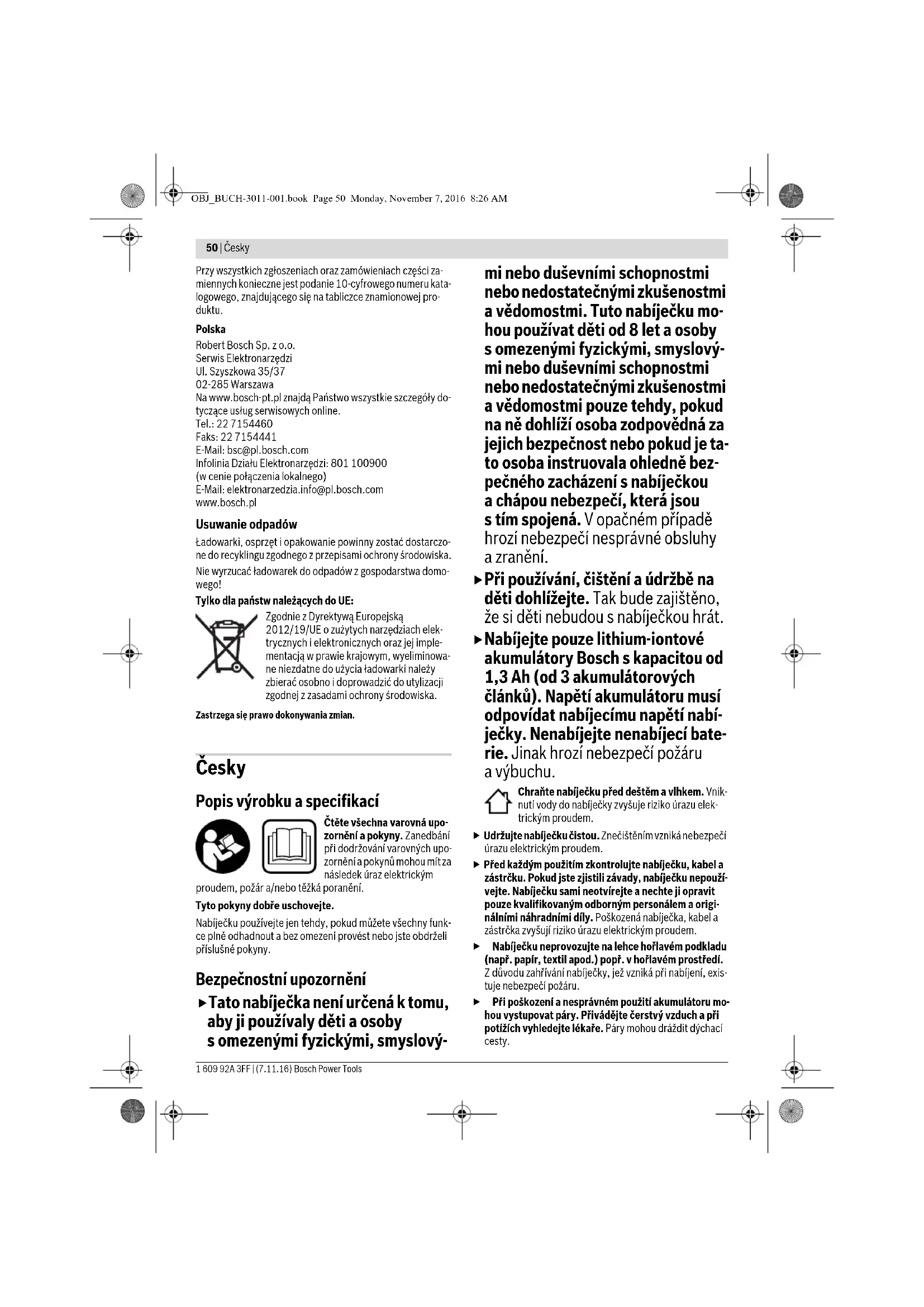 - Pomimo zgodności parametrów technicznych niektórych zewnętrz- nych urządzeń USB nie da się naładować przy użyciu tej ładowarki. Przyczyna Usuwanie błędu OBJ_BUCH-3011-001.book Page 49 Monday, November 7, 2016 8:26 AM50 | Česky 1 609 92A 3FF | (7.11.16) Bosch Power Tools Przy wszystkich zgłoszeniach oraz zamówieniach części za- miennych konieczne jest podanie 10-cyfrowego numeru kata- logowego, znajdującego się na tabliczce znamionowej pro- duktu. Polska Robert Bosch Sp. z o.o. Serwis Elektronarzędzi Ul. Szyszkowa 35/37 02-285 Warszawa Na www.bosch-pt.pl znajdą Państwo wszystkie szczegóły do- tyczące usług serwisowych online. Tel.: 22 7154460 Faks: 22 7154441 E-Mail: bsc@pl.bosch.com Infolinia Działu Elektronarzędzi: 801 100900 (w cenie połączenia lokalnego) E-Mail: elektronarzedzia.info@pl.bosch.com www.bosch.pl Usuwanie odpadów Ładowarki, osprzęt i opakowanie powinny zostać dostarczo- ne do recyklingu zgodnego z przepisami ochrony środowiska. Nie wyrzucać ładowarek do odpadów z gospodarstwa domo- wego! Tylko dla państw należących do UE: Zgodnie z Dyrektywą Europejską 2012/19/UE o zużytych narzędziach elek- trycznych i elektronicznych oraz jej imple- mentacją w prawie krajowym, wyeliminowa- ne niezdatne do użycia ładowarki należy zbierać osobno i doprowadzić do utylizacji zgodnej z zasadami ochrony środowiska. Zastrzega się prawo dokonywania zmian. Česky Popis výrobku a specifikací Čtěte všechna varovná upo- zornění a pokyny. Zanedbání při dodržování varovných upo- zornění a pokynů mohou mít za následek úraz elektrickým proudem, požár a/nebo těžká poranění. Tyto pokyny dobře uschovejte. Nabíječku používejte jen tehdy, pokud můžete všechny funk- ce plně odhadnout a bez omezení provést nebo jste obdrželi příslušné pokyny. Bezpečnostní upozornění Tato nabíječka není určená k tomu, aby ji používaly děti a osoby s omezenými fyzickými, smyslový- mi nebo duševními schopnostmi nebo nedostatečnými zkušenostmi a vědomostmi. Tuto nabíječku mo- hou používat děti od 8 let a osoby s omezenými fyzickými, smyslový- mi nebo duševními schopnostmi nebo nedostatečnými zkušenostmi a vědomostmi pouze tehdy, pokud na ně dohlíží osoba zodpovědná za jejich bezpečnost nebo pokud je ta- to osoba instruovala ohledně bez- pečného zacházení s nabíječkou a chápou nebezpečí, která jsou s tím spojená. V opačném případě hrozí nebezpečí nesprávné obsluhy a zranění. Při používání, čištění a údržbě na děti dohlížejte. Tak bude zajištěno, že si děti nebudou s nabíječkou hrát. Nabíjejte pouze lithium-iontové akumulátory Bosch s kapacitou od 1,3 Ah (od 3 akumulátorových článků). Napětí akumulátoru musí odpovídat nabíjecímu napětí nabí- ječky. Nenabíjejte nenabíjecí bate- rie. Jinak hrozí nebezpečí požáru a výbuchu. Chraňte nabíječku před deštěm a vlhkem. Vnik- nutí vody do nabíječky zvyšuje riziko úrazu elek- trickým proudem. Udržujte nabíječku čistou. Znečištěním vzniká nebezpečí úrazu elektrickým proudem. Před každým použitím zkontrolujte nabíječku, kabel a zástrčku. Pokud jste zjistili závady, nabíječku nepouží- vejte. Nabíječku sami neotvírejte a nechte ji opravit pouze kvalifikovaným odborným personálem a origi- nálními náhradními díly. Poškozená nabíječka, kabel a zástrčka zvyšují riziko úrazu elektrickým proudem. Nabíječku neprovozujte na lehce hořlavém podkladu (např. papír, textil apod.) popř. v hořlavém prostředí. Z důvodu zahřívání nabíječky, jež vzniká při nabíjení, exis- tuje nebezpečí požáru. Při poškození a nesprávném použití akumulátoru mo- hou vystupovat páry. Přivádějte čerstvý vzduch a při potížích vyhledejte lékaře. Páry mohou dráždit dýchací cesty. OBJ_BUCH-3011-001.book Page 50 Monday, November 7, 2016 8:26 AMČesky | 51 Bosch Power Tools 1 609 92A 3FF | (7.11.16) Nezakrývejte větrací štěrbiny nabíječky. Nabíječka se jinak může přehřát a nebude řádně fungovat. Zobrazené komponenty Číslování vyobrazených komponent se vztahuje na zobrazení nabíječky na obrázkové straně. 1 Akumulátor* 2 Nabíjecí šachta pro akumulátory 14,4 V/18 V 3 Nabíjecí šachta pro akumulátory 10,8 V/12 V 4 Zelená kontrolka nabíjení pro akumulátory 14,4 V/18 V 5 Červená kontrolka nabíjení pro akumulátory 14,4 V/18 V 6 Rozhraní USB 7 Zelená kontrolka nabíjení pro akumulátory 10,8 V/12 V 8 Červená kontrolka nabíjení pro akumulátory 10,8 V/12 V 9 Úchytka na stěnu* *Zobrazené nebo popsané příslušenství nepatří k standardnímu obsahu dodávky. Kompletní příslušenství naleznete v našem pro- gramu příslušenství. Technická data Provoz Uvedení do provozu Dbejte síťového napětí! Napětí zdroje proudu musí sou- hlasit s údaji na typovém štítku nabíječky. Nabíječky ozna- čené 230 V mohou být provozovány i při 220 V. Proces nabíjení Nabíjení začíná, jakmile je síťová zástrčka nabíječky zasunuta do zásuvky a akumulátor je vložen 1 do nabíjecí šachty 2/3 a/nebo je nabíjecí kabel zasunut do konektoru USB 6. Akumulátor 1, který je nejdříve vložen do nabíjecí šachty 2/3, se také nejdříve nabíjí. Následně se automaticky nabíjí napo- sled vložený akumulátor 1. Připojené externí zařízení USB se nabíjí vždy, nezávisle na tom, zda je již akumulátor 1 nabitý. Díky inteligentnímu způsobu nabíjení se automaticky rozpo- zná stav nabití akumulátoru a v závislosti na teplotě a napětí akumulátoru se nabije právě optimálním nabíjecím proudem. Tím se šetří akumulátor a zůstává při uložení v nabíječce vždy zcela nabitý. Nabíječka GAX 18V-30 GAX 18V-30 Objednací číslo