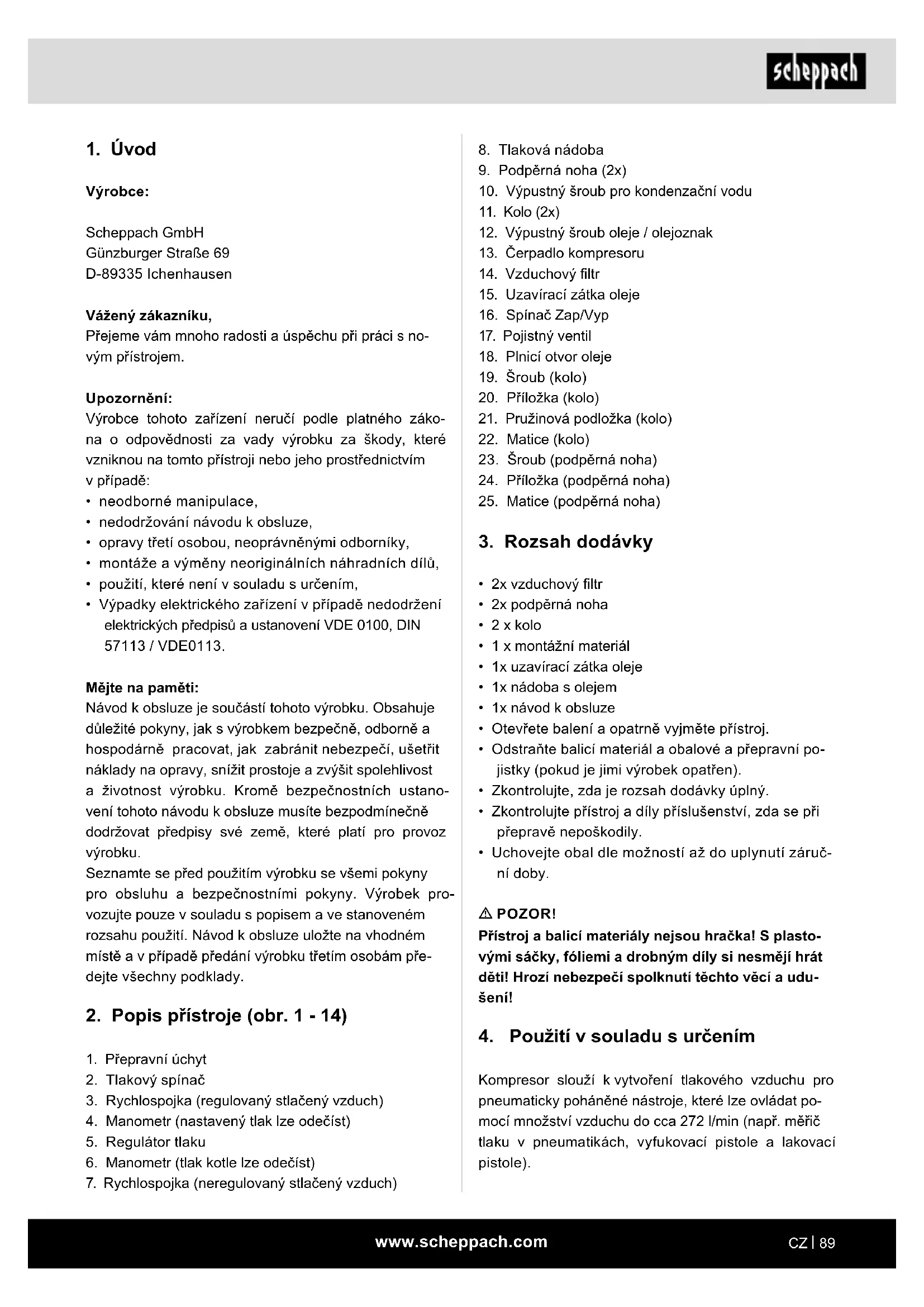 Výrobce: Scheppach GmbH Günzburger Straße 69 D-89335 Ichenhausen Vážený zákazníku, Přejeme vám mnoho radosti a úspěchu při práci s no- vým přístrojem. Upozornění: Výrobce tohoto zařízení neručí podle platného záko- na o odpovědnosti za vady výrobku za škody, které vzniknou na tomto přístroji nebo jeho prostřednictvím v případě: