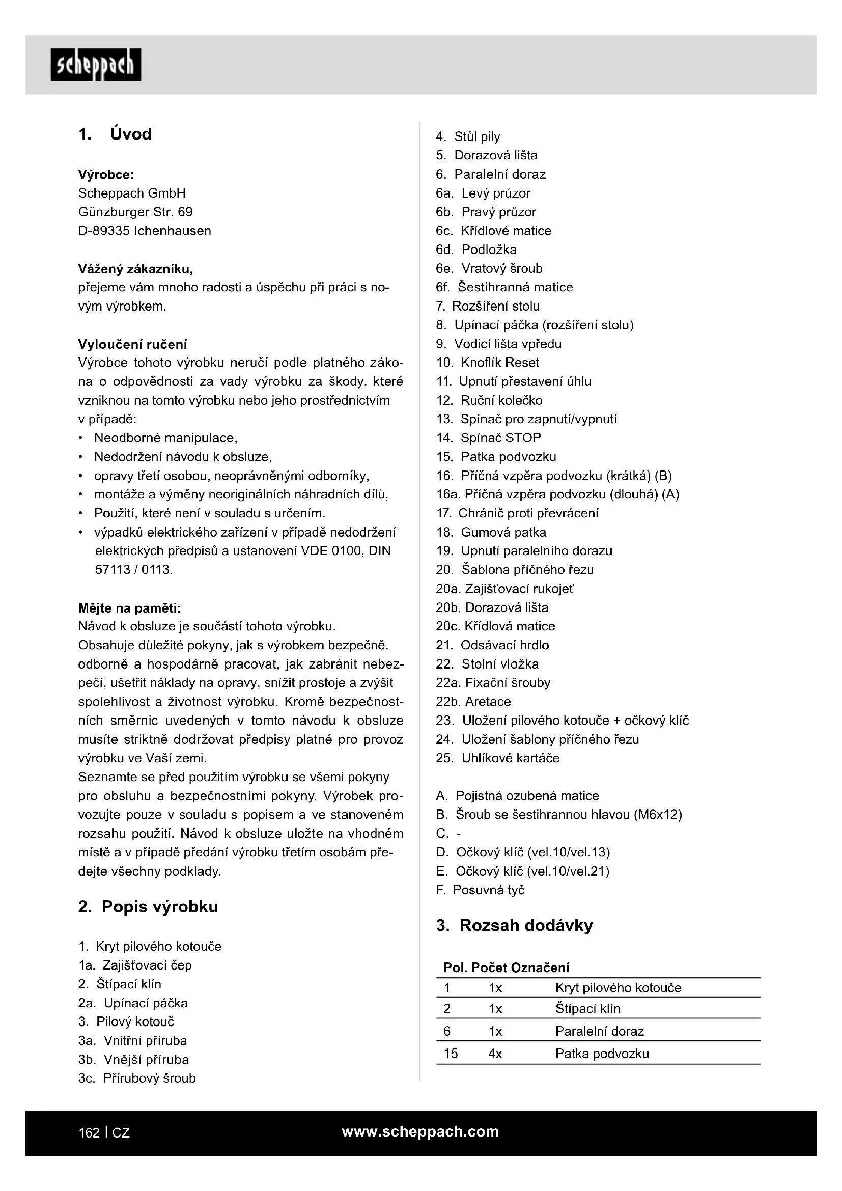 Výrobce: Scheppach GmbH Günzburger Str. 69 D-89335 Ichenhausen Vážený zákazníku, přejeme vám mnoho radosti a úspěchu při práci s no- vým výrobkem. Vyloučení ručení Výrobce tohoto výrobku neručí podle platného záko- na o odpovědnosti za vady výrobku za škody, které vzniknou na tomto výrobku nebo jeho prostřednictvím v případě: