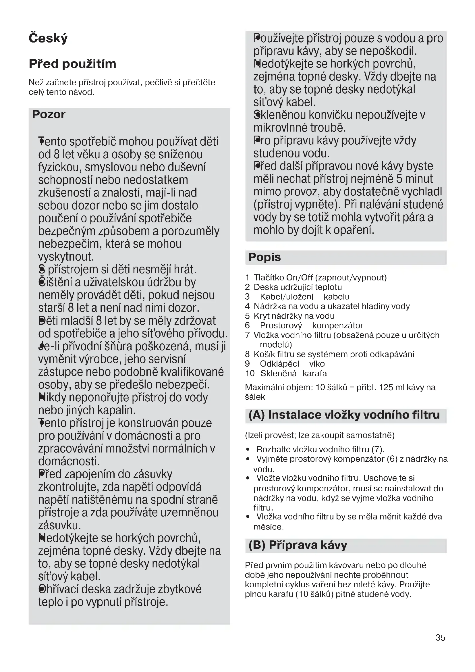 - Vložka vodního filtru by se měla měnit každé dva měsíce. (B) Příprava kávy Před prvním použitím kávovaru nebo po dlouhé době jeho nepoužívání nechte proběhnout kompletní cyklus vaření bez mleté kávy. Použijte plnou karafu (10 šálků) pitné studené vody. 35• Otevřete kryt nádržky na vodu (5).