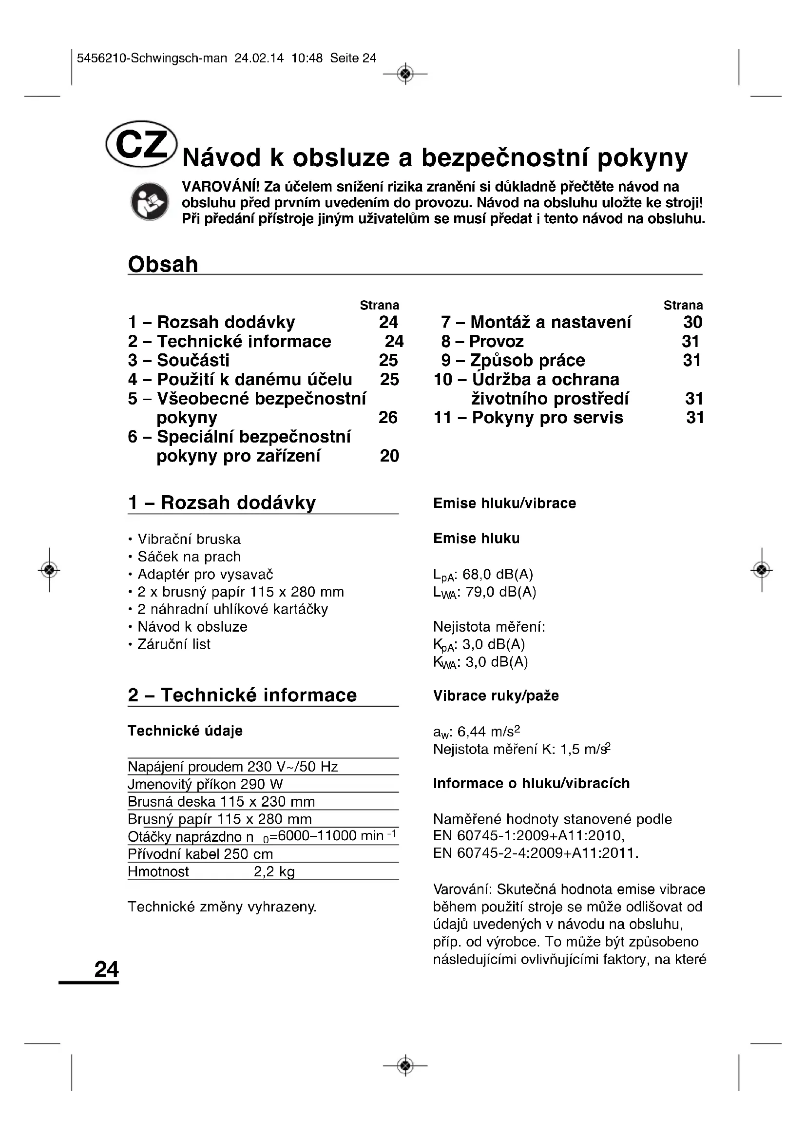 VAROVÁNÍ! Za učelem sniženi rizika zraněni si dúkladné prěctěte námod na obsluhu prěd první umedením do provozu. Námod na obsluhu uložte ke stroji! Pri prědáni prístroje jiným uživatelám se musí prědat i tento námod na obsluhu.