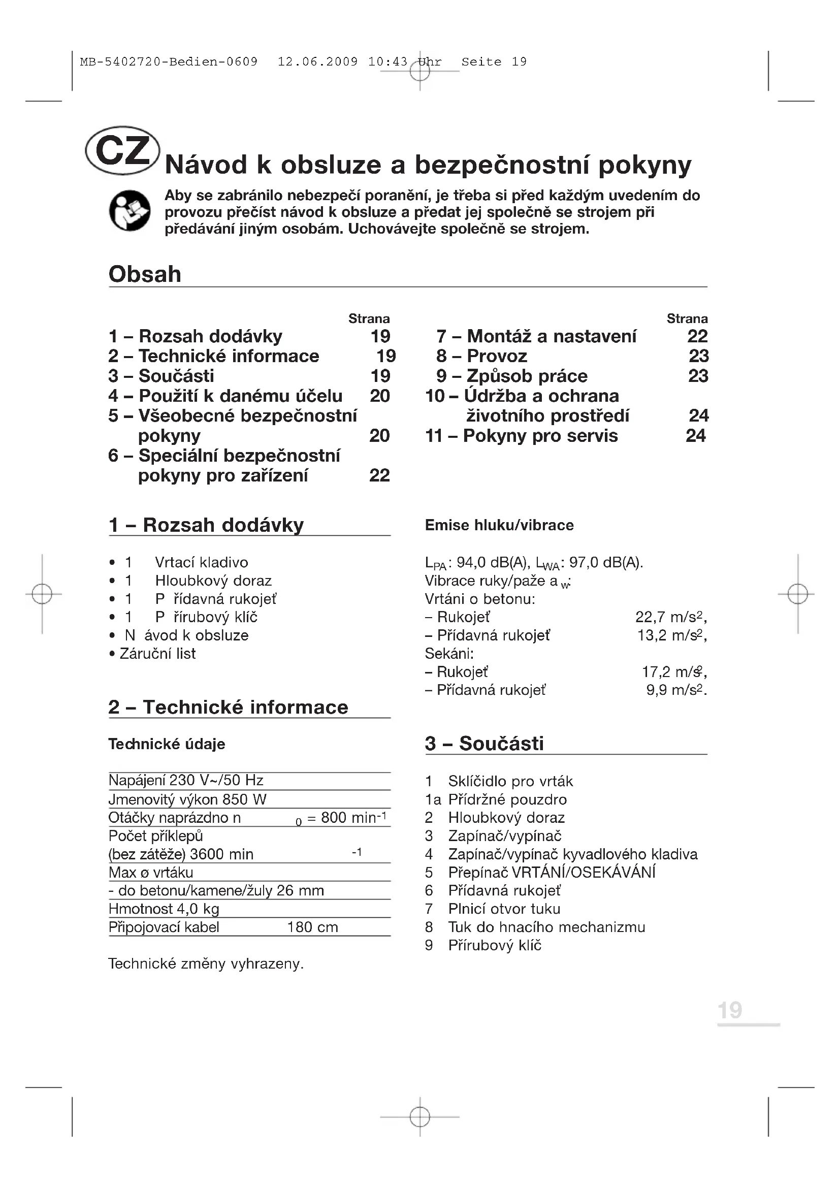 Aby se zabránilo nebezpeci poraněni, je třeba si prěd každým uvedením do provozu prěcíst námod k obsluze a prědat jej spelečné se strojem pri prědávány jiním osobám. Uchovávejte spelečné se strojem.
