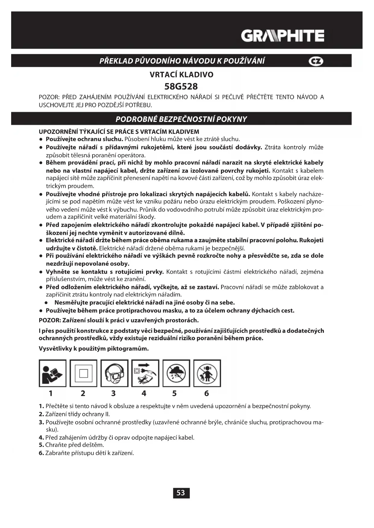 UPOZORNĚNÍ TÝKAJÍCÍ SE PRÁCE S VRTACÍM KLADIVEM ● Používejte ochranu sluchu. Působení hluku může vést ke ztrátě sluchu. ● Používejte nářadí s přídavnými rukojetěmi, které jsou součástí dodávky. Ztráta kontroly může způsobit tělesná poranění operátora. ● Během provádění prací, při nichž by mohlo pracovní nářadí narazit na skryté elektrické kabely nebo na vlastní napájecí kabel, držte zařízení za izolované povrchy rukojeti. Kontakt s kabelem napájecí sítě může zapříčinit přenesení napětí na kovové části zařízení, což by mohlo způsobit úraz elek- trickým proudem. ● Používejte vhodné přístroje pro lokalizaci skrytých napájecích kabelů. Kontakt s kabely nacháze- jícími se pod napětím může vést ke vzniku požáru nebo úrazu elektrickým proudem. Poškození plyno- vého vedení může vést k výbuchu. Průnik do vodovodního potrubí může způsobit úraz elektrickým pro- udem a zapříčinit velké materiální škody. ● Před zapojením elektrického nářadí zkontrolujte pokaždé napájecí kabel. V případě zjištění po- škození jej nechte vyměnit v autorizované dílně. ● Elektrické nářadí držte během práce oběma rukama a zaujměte stabilní pracovní polohu. Rukojeti udržujte v čistotě. Elektrické nářadí držené oběma rukami je bezpečnější. ● Při používání elektrického nářadí ve výškách pevně rozkročte nohy a přesvědčte se, zda se dole nezdržují nepovolané osoby. ● Vyhněte se kontaktu s rotujícími prvky. Kontakt s rotujícími částmi elektrického nářadí, zejména příslušenstvím, může vést ke zranění. ● Před odložením elektrického nářadí, vyčkejte, až se zastaví. Pracovní nářadí se může zablokovat a zapříčinit ztrátu kontroly nad elektrickým nářadím. ● Nesměřujte pracující elektrické nářadí na jiné osoby či na sebe. ● Používejte během práce protiprachovou masku, a to za účelem ochrany dýchacích cest. POZOR: Zařízení slouží k práci v uzavřených prostorách. I přes použití konstrukce z podstaty věci bezpečné, používání zajišťujících prostředků a dodatečných ochranných prostředků, vždy existuje reziduální riziko poranění během práce. Vysvětlivky k použitým piktogramům.