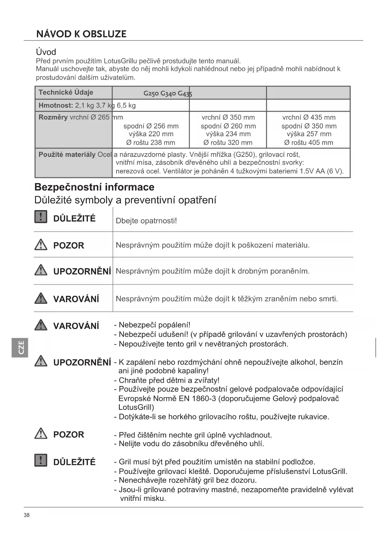 - Nebezpečí popálení! - Nebezpečí udušení! (v případě grilování v uzavřených prostorách) - Nepoužívejte tento gril v nevětraných prostorách. - K zapálení nebo rozdmýchání ohně nepoužívejte alkohol, benzín ani jiné podobné kapaliny! - Chraňte před dětmi a zvířaty! - Používejte pouze bezpečnostní gelové podpalovače odpovídající Evropské Normě EN 1860-3 (doporučujeme Gelový podpalovač LotusGrill) - Dotýkáte-li se horkého grilovacího roštu, používejte rukavice. - Před čištěním nechte gril úplně vychladnout. - Nelijte vodu do zásobníku dřevěného uhlí. - Gril musí být před použitím umístěn na stabilní podložce. - Používejte grilovací kleště. Doporučujeme příslušenství LotusGrill. - Nenechávejte rozehřátý gril bez dozoru. - Jsou-li grilované potraviny mastné, nezapomeňte pravidelně vylévat vnitřní misku. Dbejte opatrnosti! Nesprávným použitím může dojít k poškození materiálu. Nesprávným použitím může dojít k těžkým zraněním nebo smrti. Nesprávným použitím může dojít k drobným poraněním. Důležité symboly a preventivní opatření Bezpečnostní informace