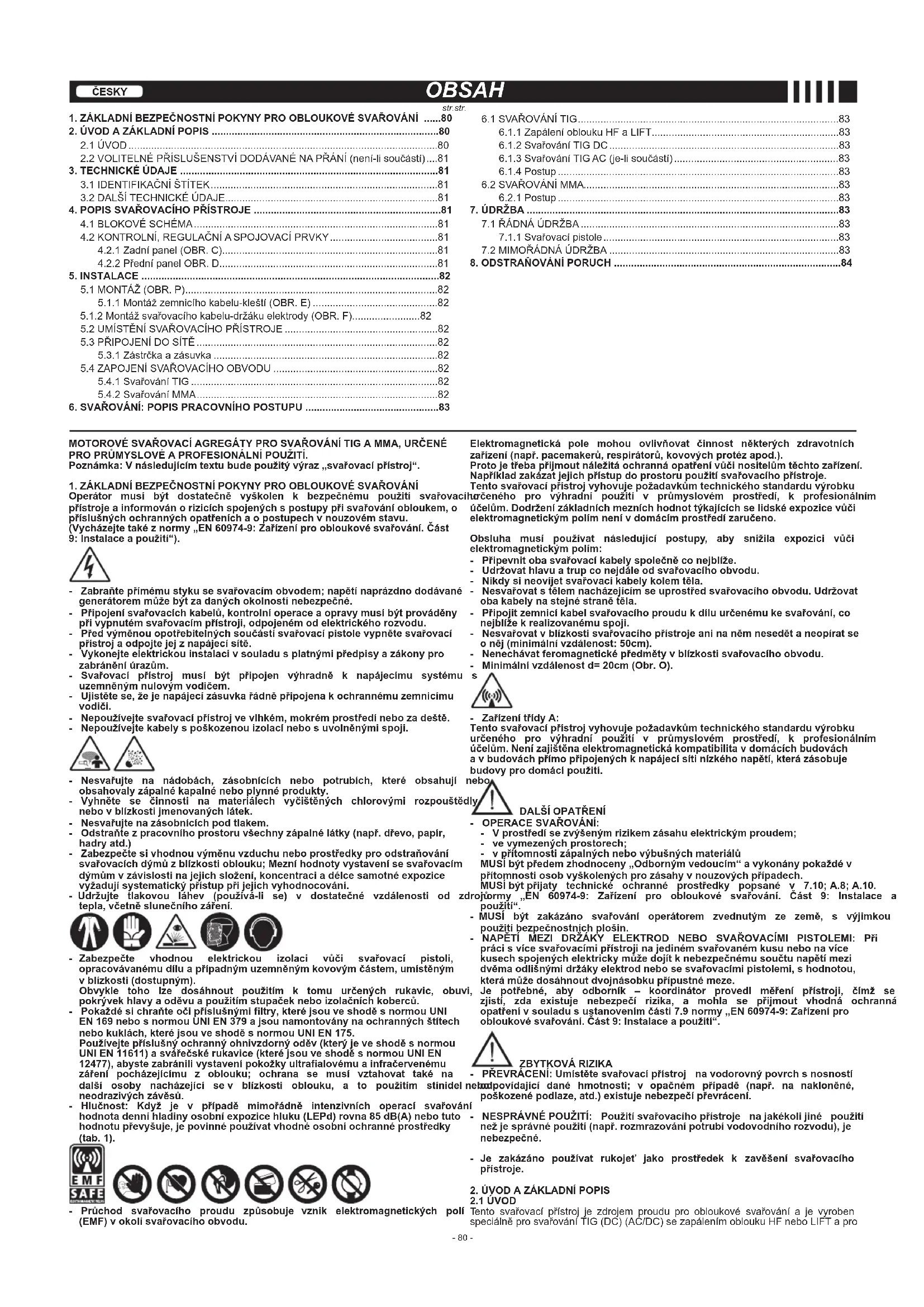 V PŘÍPADĚ NEUSPOKOJIVÉ ČINNOSTI A DŘÍVE, NEŽ PROVEDETE SYSTEMATICKÉ KONTROLY NEBO NEŽ SE OBRÁTÍTE NA VAŠE SERVISNÍ STŘEDISKO, ZKONTROLUJTE, ZDA: - Svařovací proud, regulovaný příslušným potenciometrem se stupnicí ocejchovanou v ampérech, odpovídá průměru a druhu použité elektrody. - Při hlavním vypínači v poloze „ON“ je rozsvícena příslušná kontrolka; v opačném případě je problém obyčejně v napájecím vedení (kabely, zásuvka a/nebo zástrčka, pojistky atd.). - Není rozsvícena žlutá LED signalizující zásah tepelné ochrany způsobené přepětím nebo podpětím anebo zkratem. - Ujistěte se, zda jste dodrželi jmenovitou hodnotu poměru základního a pulzního proudu; v případě zásahu termostatické ochrany vyčkejte na ochlazení přístroje přirozeným způsobem, zkontrolujte činnost ventilátoru. - Zkontrolujte napájecí napětí: Když je napětí příliš vysoké nebo příliš nízké, svařovací přístroj zůstane zablokován. - Zkontrolujte, zda na výstupu svařovacího přístroje není přítomen zkrat: V takovém případě přistupte k odstranění jeho příčin. - Je správně provedeno zapojení svařovacího obvodu, se zvláštním důrazem na skutečné připojení zemnicích kleští k dílu, aniž by byl mezi ně vložen izolační materiál (např. lak). - Je použitý správný ochranný plyn (argon 99.5%) a ve správném množství.- 85 - SLOVENSKY OBSAH 1.ZÁKLADNÉBEZPEČNOSTNÉPOKYNYPREOBLÚKOVÉZVÁRANIE.........85