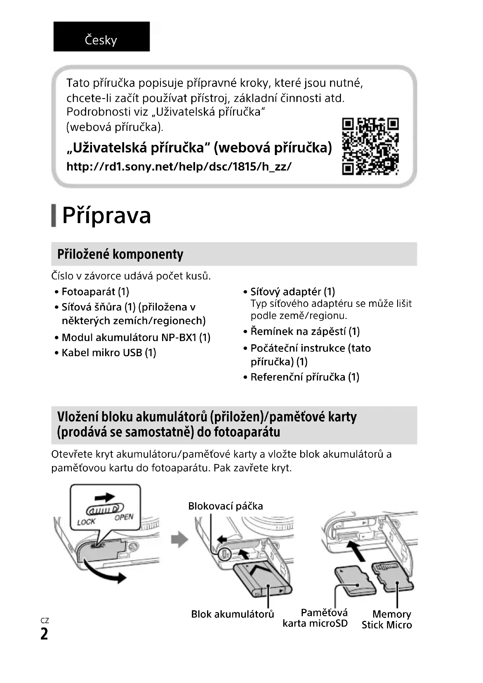 Česky Příprava Přiložené komponenty Číslo v závorce udává počet kusů.• Fotoaparát (1)• Síťová šňůra (1) (přiložena v některých zemích/regionech)• Modul akumulátoru NP-BX1 (1)• Kabel mikro USB (1)• Síťový adaptér (1)Typ síťového adaptéru se může lišit podle země/regionu.• Řemínek na zápěstí (1)• Počáteční instrukce (tato příručka) (1)• Referenční příručka (1) Vložení bloku akumulátorů (přiložen)/paměťové karty (prodává se samostatně) do fotoaparátu Otevřete kryt akumulátoru/paměťové karty a vložte blok akumulátorů a paměťovou kartu do fotoaparátu. Pak zavřete kryt.Paměťová karta microSD Memory Stick MicroBlok akumulátorůBlokovací páčka Tato příručka popisuje přípravné kroky, které jsou nutné, chcete-li začít používat přístroj, základní činnosti atd. Podrobnosti viz „Uživatelská příručka“ (webová příručka). „Uživatelská příručka“ (webová příručka) http://rd1.sony.net/help/dsc/1815/h_zz/CZ