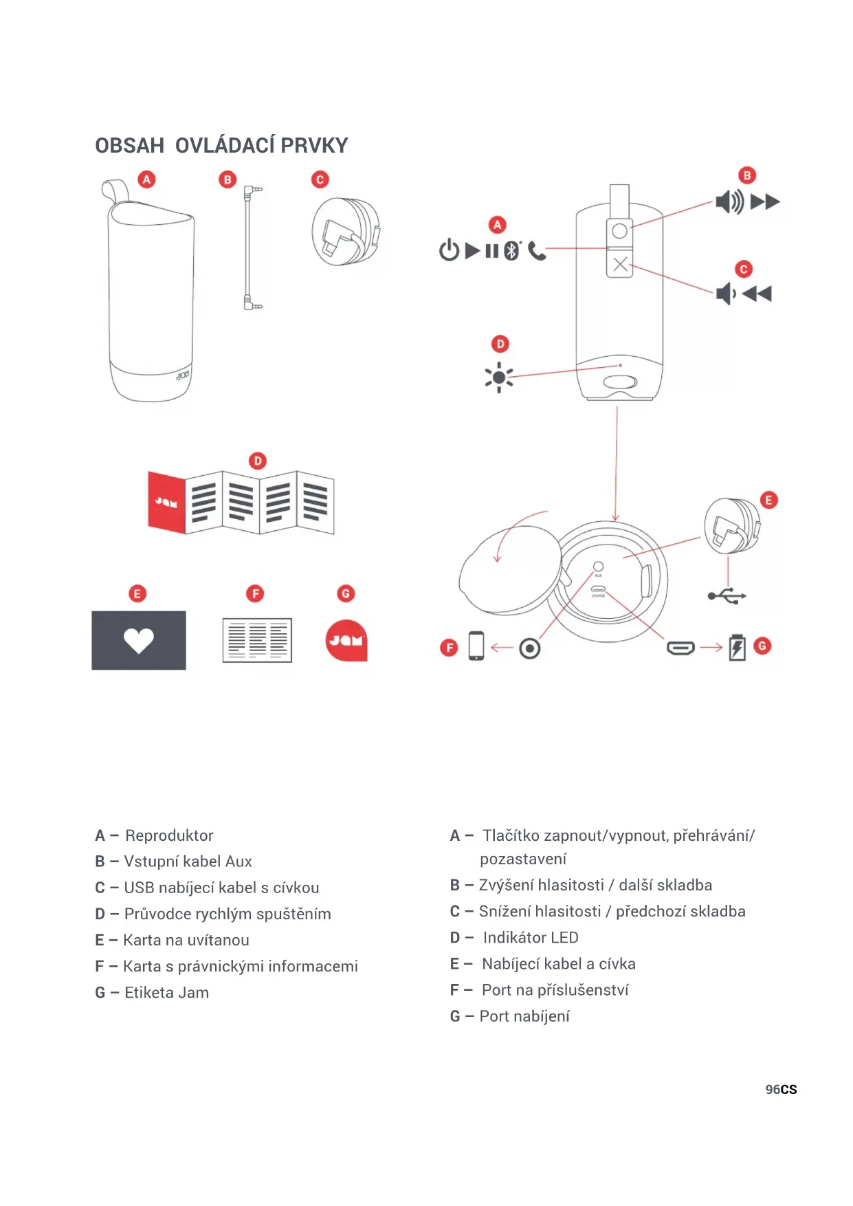 A – Reproduktor B – Vstupní kabel Aux C – USB nabíjecí kabel s cívkou D – Průvodce rychlým spuštěním E – Karta na uvítanou F – Karta s právnickými informacemi G – Etiketa Jam A – Tlačítko zapnout/vypnout, přehrávání/ pozastavení B – Zvýšení hlasitosti / další skladba C – Snížení hlasitosti / předchozí skladba D – Indikátor LED E – Nabíjecí kabel a cívka F – Port na příslušenství G – Port nabíjení97 CHARGE AUX CHARGE NASTAVENÍ 2hrs 12hrs 3 hrs 22 hrs