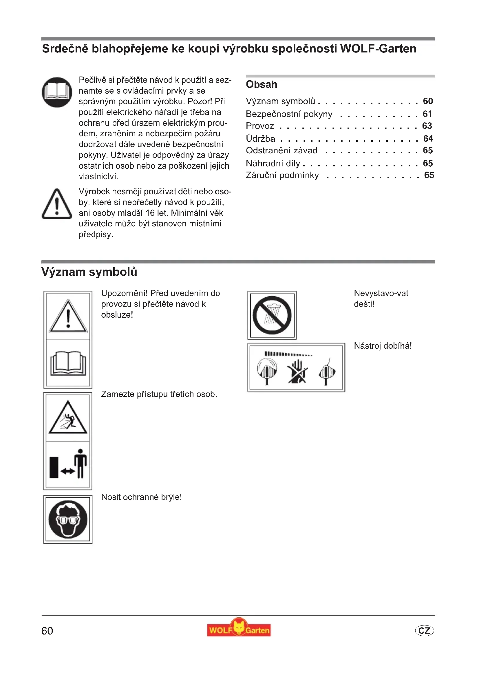 - C Srde<n= blahop>ejeme ke koupi výrobku spole<nosti WOLF-Garten Obsah Význam symbol p. 60