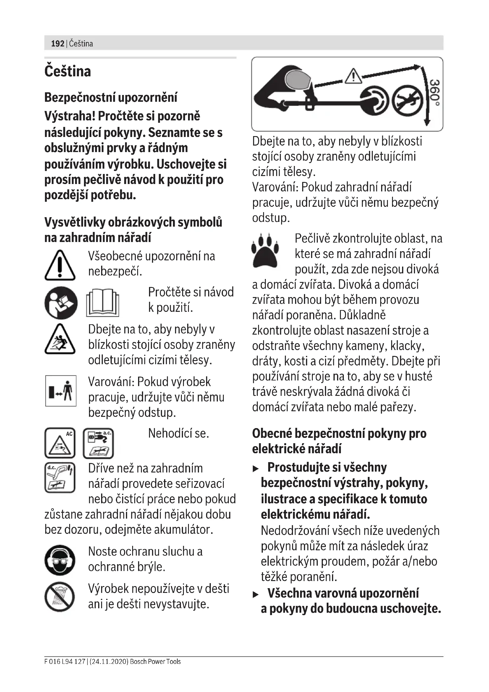 a.c. Nehodící se. d.c. Dříve než na zahradním nářadí provedete seřizovací nebo čistící práce nebo pokud zůstane zahradní nářadí nějakou dobu bez dozoru, odejměte akumulátor. Noste ochranu sluchu a ochranné brýle. Výrobek nepoužívejte v dešti ani je dešti nevystavujte. Dbejte na to, aby nebyly v blízkosti stojící osoby zraněny odletujícími cizími tělesy. Varování: Pokud zahradní nářadí pracuje, udržujte vůči němu bezpečný odstup. Pečlivě zkontrolujte oblast, na které se má zahradní nářadí použít, zda zde nejsou divoká a domácí zvířata. Divoká a domácí zvířata mohou být během provozu nářadí poraněna. Důkladně zkontrolujte oblast nasazení stroje a odstraňte všechny kameny, klacky, dráty, kosti a cizí předměty. Dbejte při používání stroje na to, aby se v husté trávě neskrývala žádná divoká či domácí zvířata nebo malé pařezy. Obecné bezpečnostní pokyny pro elektrické nářadí u Prostudujte si všechny bezpečnostní výstrahy, pokyny, ilustrace aspecifikace ktomuto elektrickému nářadí. Nedodržování všech níže uvedených pokynů může mít za následek úraz elektrickým proudem, požár a/nebo těžké poranění. u Všechna varovná upozornění apokyny do budoucna uschovejte. F 016 L94 127 | (24.11.2020) Bosch Power ToolsČeština | 193 u Vupozorněních použitý pojem „elektrické nářadí“ se vztahuje na elektrické nářadí napájené ze sítě (se síťovým kabelem) ana elektrické nářadí napájené akumulátorem (bez síťového kabelu). Bezpečnost pracoviště u Udržujte pracoviště včistotě adobře osvětlené. Nepořádek nebo neosvětlené pracoviště mohou vést kúrazům. u Selektrickým nářadím nepracujte vprostředí ohroženém explozí, kde se nacházejí hořlavé kapaliny, plyny nebo prach. Elektrické nářadí vytváří jiskry, které mohou prach nebo páry zapálit. u Děti ajiné osoby udržujte při použití elektrického nářadí vbezpečné vzdálenosti od pracoviště. Při rozptýlení můžete ztratit kontrolu nad nářadím. Elektrická bezpečnost u Zástrčky elektrického nářadí musí lícovat se zásuvkou. Zástrčka nesmí být žádným způsobem upravena. Selektrickým nářadím sochranným uzemněním nepoužívejte žádné adaptérové zástrčky. Neupravené zástrčky aodpovídající zásuvky snižují riziko zásahu elektrickým proudem. u Zabraňte kontaktu těla suzemněnými povrchy, jako jsou např. potrubí, topení, sporáky achladničky. Je‑li vaše tělo uzemněno, existuje zvýšené riziko zásahu elektrickým proudem. u Chraňte elektrické nářadí před deštěm avlhkem. Vniknutí vody do elektrického nářadí zvyšuje nebezpečí zásahu elektrickým proudem. u Dbejte na účel kabelu. Nepoužívejte jej knošení elektrického nářadí nebo kvytažení zástrčky ze zásuvky. Udržujte kabel vbezpečné vzdálenosti od tepla, oleje, ostrých hran nebo pohyblivých dílů. Poškozené nebo spletené kabely zvyšují riziko zásahu elektrickým proudem. u Pokud pracujete selektrickým nářadím venku, použijte pouze takové prodlužovací kabely, které jsou způsobilé ipro venkovní použití. Použití prodlužovacího kabelu, jež je vhodný pro použití venku, snižuje riziko zásahu elektrickým proudem. u Pokud se nelze vyhnout provozu elektrického nářadí ve vlhkém prostředí, použijte proudový chránič. Použití proudového chrániče snižuje riziko zásahu elektrickým proudem. Osobní bezpečnost u Buďte pozorní, dávejte pozor na to, co děláte apřistupujte kpráci selektrickým nářadím rozumně. Bosch Power Tools F 016 L94 127 | (24.11.2020)194 | Čeština Nepoužívejte žádné elektrické nářadí, pokud jste unaveni nebo pod vlivem drog, alkoholu či léků. Moment nepozornosti při použití elektrického nářadí může vést kvážným poraněním. u Používejte ochranné osobní pomůcky. Noste ochranné brýle. Nošení osobních ochranných pomůcek, jako je maska proti prachu, bezpečnostní obuv sprotiskluzovou podrážkou, ochranná přilba nebo sluchátka, podle aktuálních podmínek, snižuje riziko poranění. u Zabraňte neúmyslnému uvedení do provozu. Přesvědčte se, že je elektrické nářadí vypnuté, dříve než jej uchopíte, ponesete či připojíte na zdroj napájení a/nebo akumulátor. Máte‑li při nošení elektrického nářadí prst na spínači, nebo pokud nářadí připojíte ke zdroji napájení zapnuté, může dojít kúrazu. u Než elektrické nářadí zapnete, odstraňte seřizovací nástroje nebo klíče. Nachází-li se votáčivém dílu elektrického nářadí nějaký nástroj nebo klíč, může dojít kporanění. u Nepřeceňujte své síly. Zajistěte si bezpečný postoj audržujte vždy rovnováhu. Tím můžete elektrické nářadí vneočekávaných situacích lépe kontrolovat. u Noste vhodný oděv. Nenoste volný oděv ani šperky. Vlasy aoděv udržujte vbezpečné vzdálenosti od pohybujících se dílů. Volný oděv, šperky nebo dlouhé vlasy mohou být zachyceny pohybujícími se díly. u Lze‑li namontovat odsávací či zachycující přípravky, přesvědčte se, že jsou připojeny asprávně použity. Odsávání prachu může snížit ohrožení prachem. u Dbejte na to, abyste při častém používání nářadí nebyli méně ostražití anezapomínali na bezpečnostní zásady. Nedbalé ovládání může způsobit těžké poranění za zlomek sekundy. Svědomité zacházení apoužívání elektrického nářadí u Elektrické nářadí nepřetěžujte. Pro svou práci použijte ktomu určené elektrické nářadí. Svhodným elektrickým nářadím budete pracovat vdané oblasti lépe abezpečněji. u Nepoužívejte elektrické nářadí, jestliže jej nelze spínačem zapnout avypnout. Elektrické nářadí, které nelze ovládat spínačem, je nebezpečné amusí 