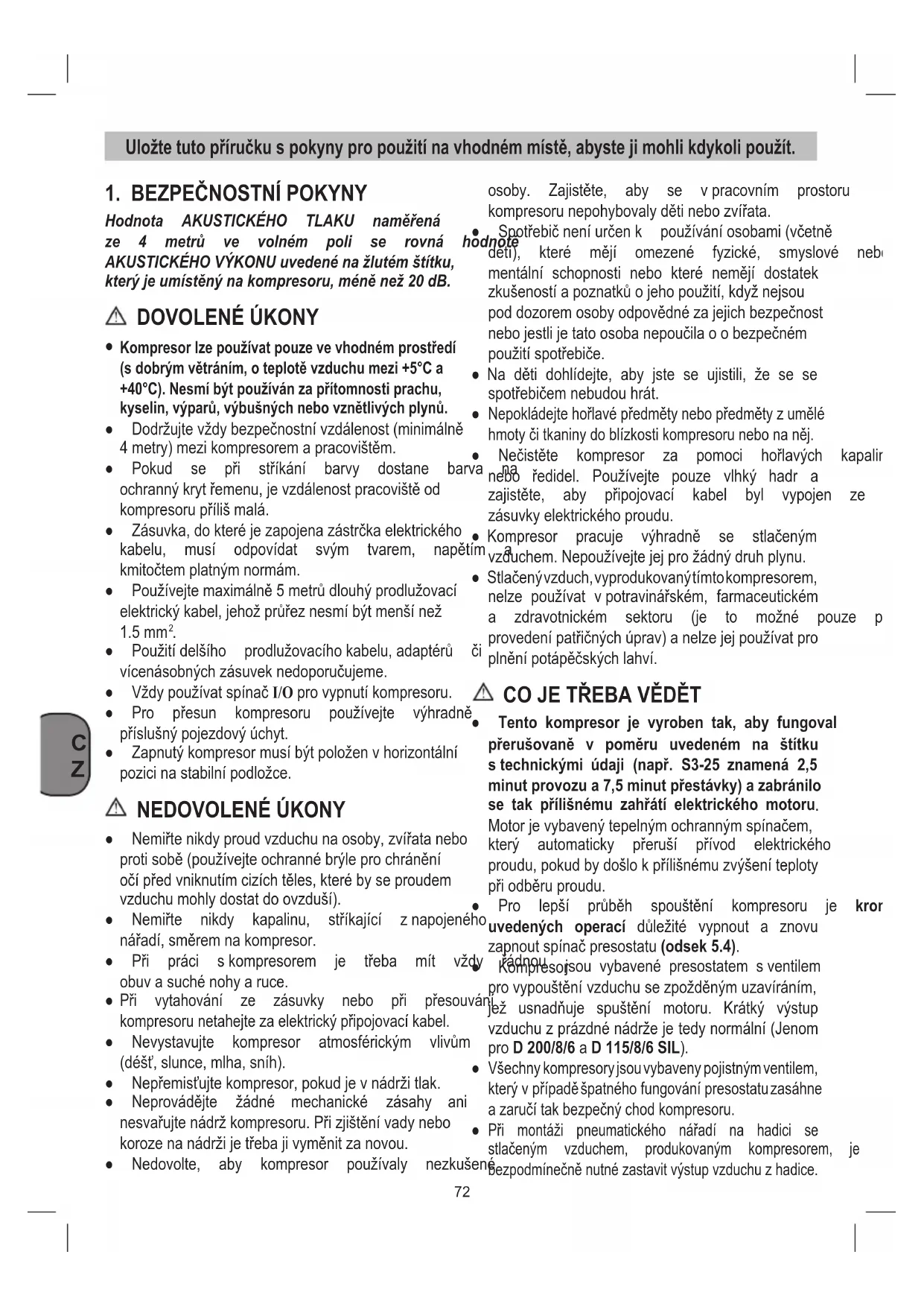 - Kompresor lze používat pouze ve vchodné prostřédi (s dobrým větránim, o teplě vržduchu mezi +5°C a +40°C). Nesmi byt použiván za pritomnosti prachu, kyselin, vyparù, vybusněch nebo vznětlívých plynu.
