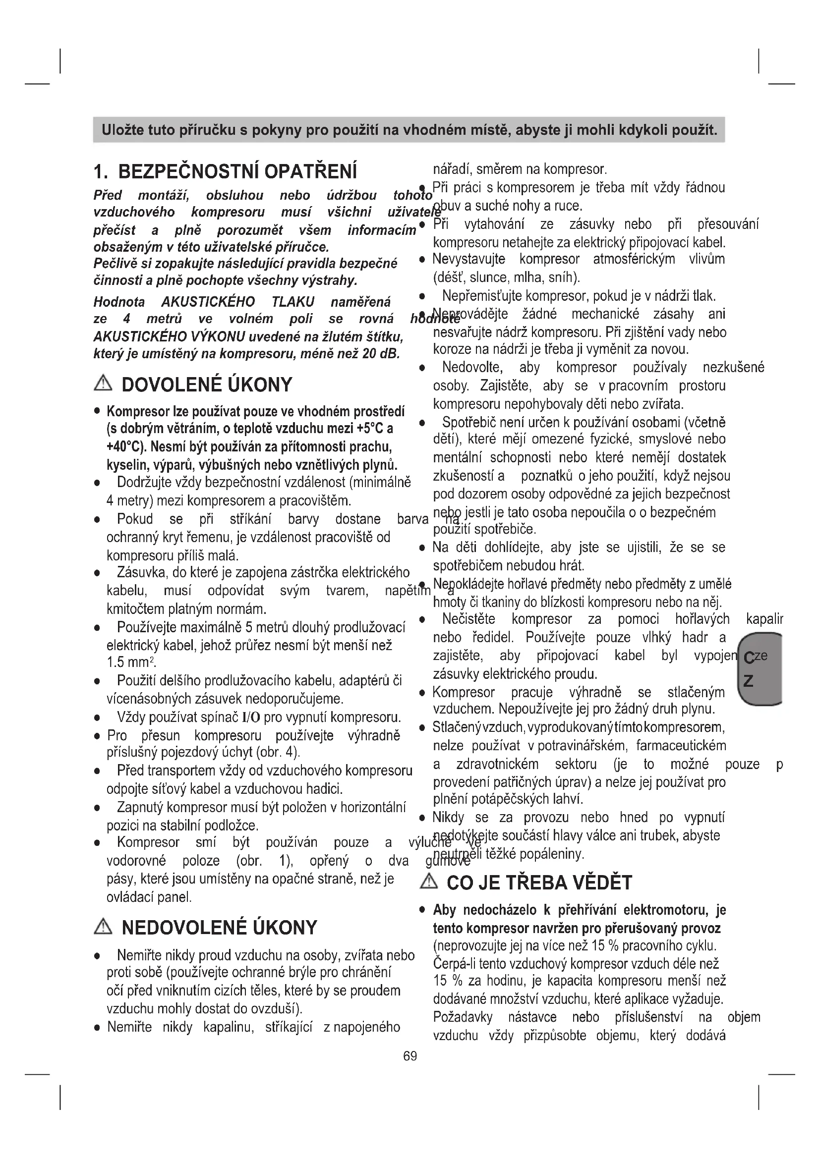 Před montáží, obsluhou nebo údržbou tohoto vzduchového kompresoru musí všichni uživatelé přečíst a plně porozumět všem informacím obsaženýmvtétouživatelsképříručce. Pečlivěsizopakujtenásledujícípravidlabezpečné činnostiaplněpochoptevšechnyvýstrahy. Hodnota AKUSTICKÉHO TLAKU naměřená ze 4 metrů ve volném poli se rovná hodnotě AKUSTICKÉHOVÝKONUuvedenénažlutémštítku, kterýjeumístěnýnakompresoru,méněnež20dB. DOVOLENÉ úKONY