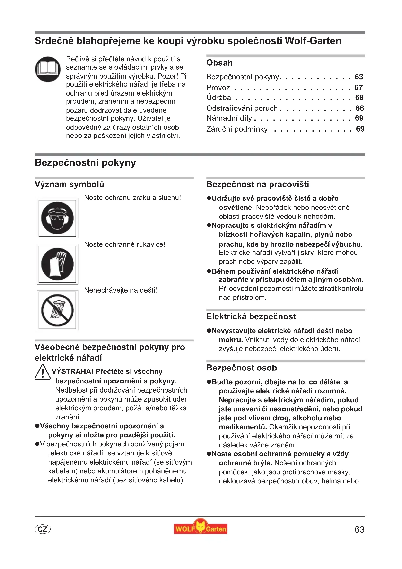 - CSrde?n@ blahopDejeme ke koupi výrobku spole?nosti Wolf-Garten Obsah Bezpenostní pokyny p. 63