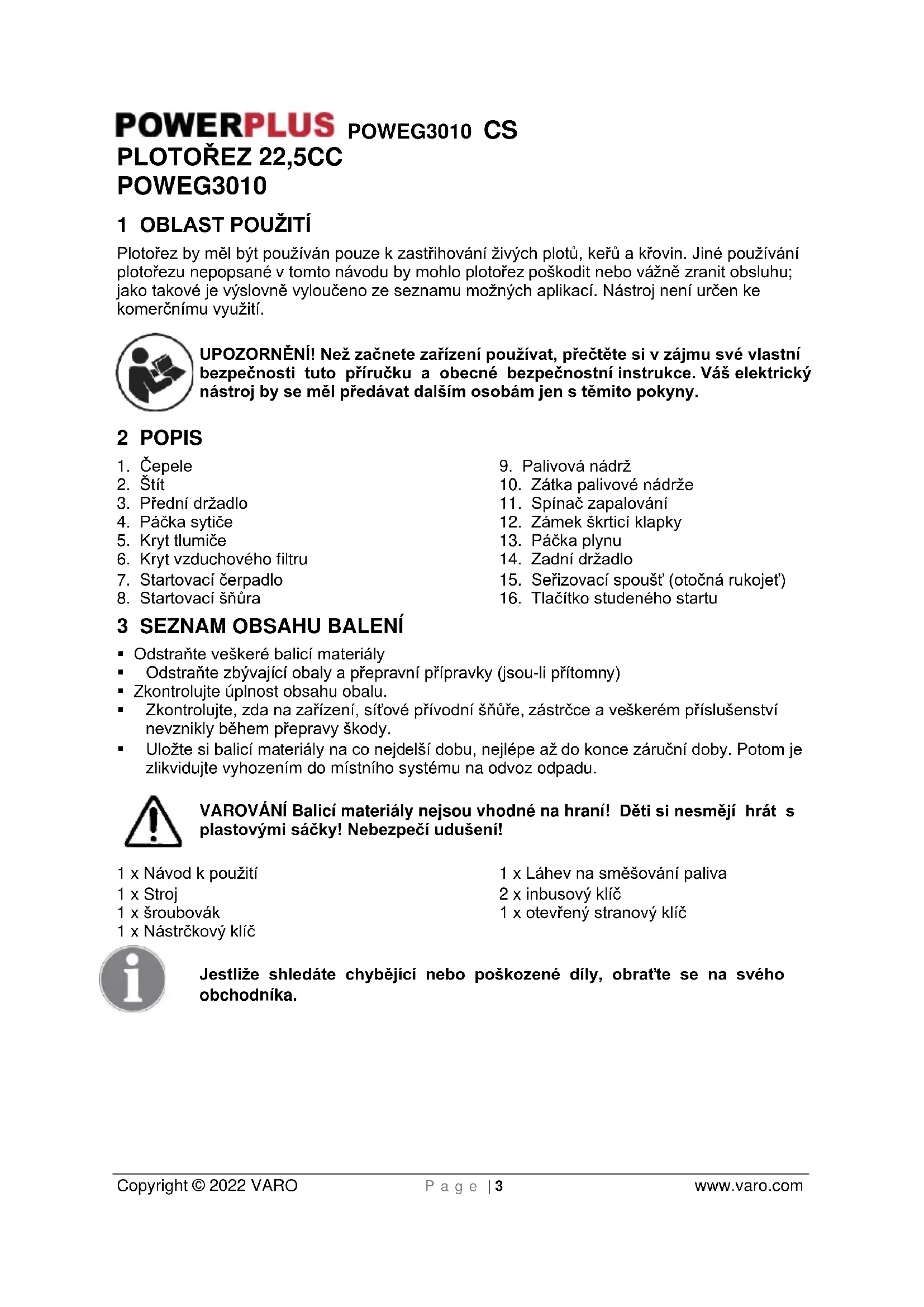 Použité zařízení nelikvidujte spolu s běžným domovním odpadem, ale řiďte se předpisy vydanými s ohledem na ochranu životního prostředí. Laskavě likvidujte použitý motorový olej způsobem slučitelným s péči o životní prostředí. Navrhujeme vzít jej v uzavřeném kanystru na svou místní servisní stanici k regeneraci. Nevyhazujte jej do odpadu ani jej nevylévejte na zem.POWEG3010 CS Copyright © 2022 VARO P a g e | 14 www.varo.com