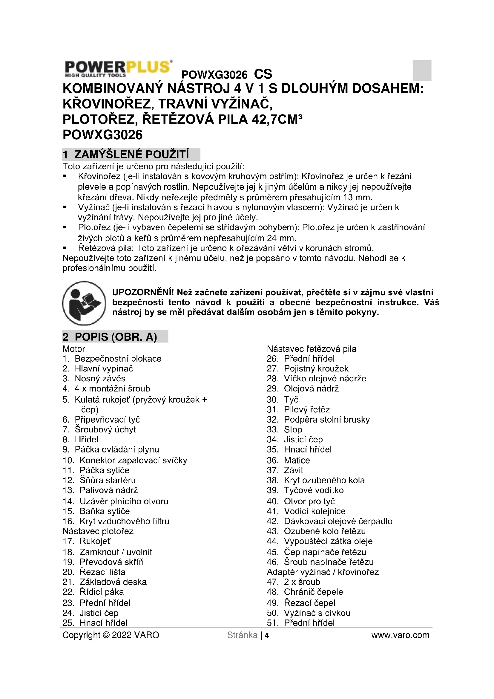 - Nikdy nepoužívejte plotořez bez kontroly těsnosti držáku.POWXG3026 CS Copyright © 2022 VARO Stránka | 23 www.varo.com