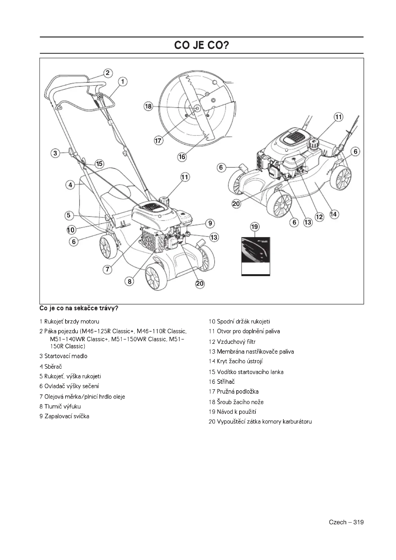 1 RukojeÈ brzdy motoru2 Páka pojezdu (M46-125R Classic+, M46-110R Classic, M51-140WR Classic+, M51-150WR Classic, M51-150R Classic)3 Startovací madlo4 Sbûraã5 RukojeÈ, v˘‰ka rukojeti6 Ovladaã v˘‰ky seãení7 Olejová mûrka/plnicí hrdlo oleje8 Tlumiã v˘fuku9 Zapalovací svíãka10 Spodní drÏák rukojeti11 Otvor pro doplnûní paliva12 Vzduchov˘ filtr13 Membrána nastfiikovaãe paliva14 Kryt Ïacího ústrojí15 Vodítko startovacího lanka16 Stfiihaã17 PruÏná podloÏka18 ·roub Ïacího noÏe19 Návod k pouÏití20 Vypou‰tûcí zátka komory karburátoruBEZPEâNOSTNÍ V¯BAVA ZA¤ÍZENÍ 320 – Czech V‰eobecnû Tato ãást popisuje bezpeãnostní vybavení stroje, jeho úãel a zpÛsob, kter˘m by se mûla provádût kontrola a údrÏba, aby byla zaji‰tûna jeho správná funkce. Kryt Ïacího ústrojí