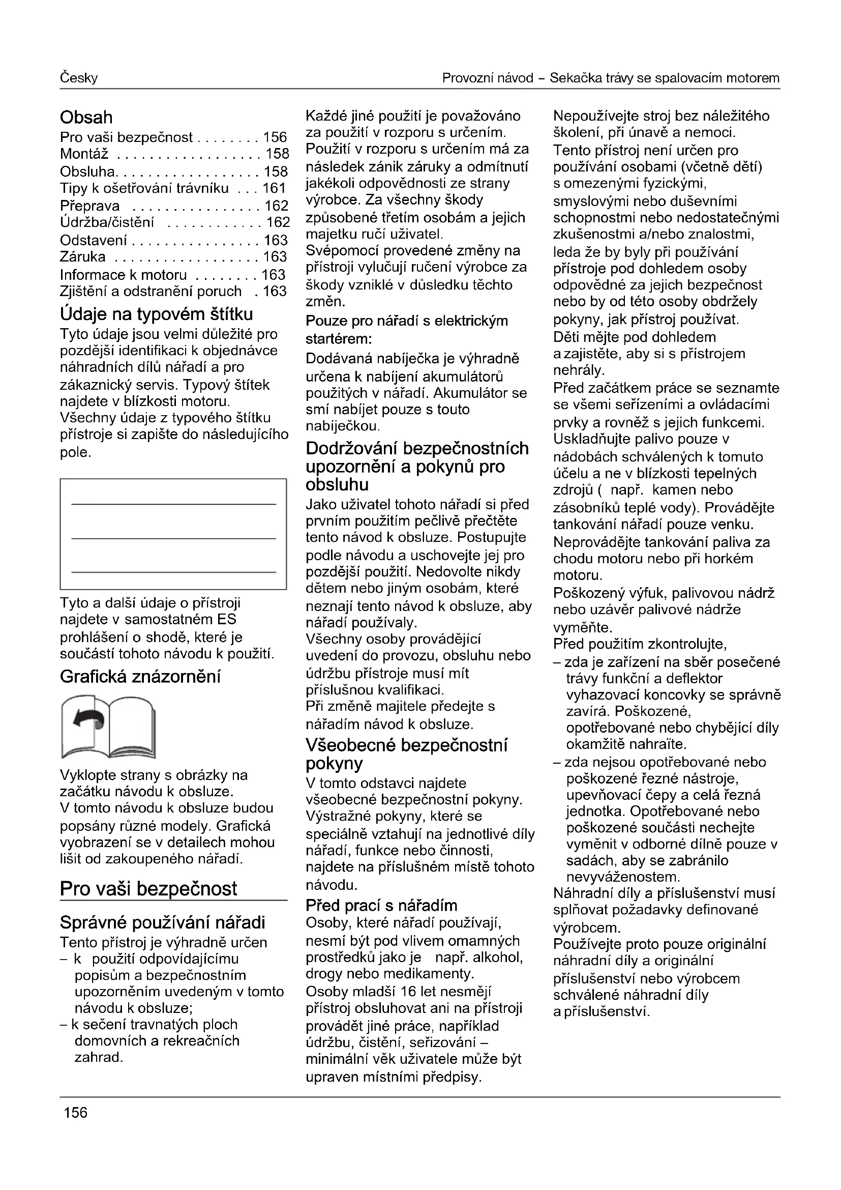 - Informace k motoru Zjištění a odstranění poruch . 163 Údaje na typovém štítku Tyto údaje jsou velmi důležité pro pozdější identifikaci k objednávce náhradních dílů nářadí a pro zákaznický servis. Typový štítek najdete v blízkosti motoru. Všechny údaje z typového štítku přístroje si zapište do následujícího pole. Tyto a další údaje o přístroji najdete v samostatném ES prohlášení o shodě, které je součástí tohoto návodu k použití. Grafická znázornění Vyklopte strany s obrázky na začátku návodu k obsluze. V tomto návodu k obsluze budou popsány různé modely. Grafická vyobrazení se v detailech mohou lišit od zakoupeného nářadí. Pro vaši bezpečnost Správné používání nářadi Tento přístroj je výhradně určen –k použití odpovídajícímu popisům a bezpečnostním upozorněním uvedeným v tomto návodu k obsluze; – k sečení travnatých ploch domovních a rekreačních zahrad. Každé jiné použití je považováno za použití v rozporu s určením. Použití v rozporu s určením má za následek zánik záruky a odmítnutí jakékoli odpovědnosti ze strany výrobce. Za všechny škody způsobené třetím osobám a jejich majetku ručí uživatel. Svépomocí provedené změny na přístroji vylučují ručení výrobce za škody vzniklé v důsledku těchto změn. Pouze pro nářadí s elektrickým startérem: Dodávaná nabíječka je výhradně určena k nabíjení akumulátorů použitých v nářadí. Akumulátor se smí nabíjet pouze s touto nabíječkou. Dodržování bezpečnostních upozornění a pokynů pro obsluhu Jako uživatel tohoto nářadí si před prvním použitím pečlivě přečtěte tento návod k obsluze. Postupujte podle návodu a uschovejte jej pro pozdější použití. Nedovolte nikdy dětem nebo jiným osobám, které neznají tento návod k obsluze, aby nářadí používaly. Všechny osoby provádějící uvedení do provozu, obsluhu nebo údržbu přístroje musí mít příslušnou kvalifikaci. Při změně majitele předejte s nářadím návod k obsluze. Všeobecné bezpečnostní pokyny V tomto odstavci najdete všeobecné bezpečnostní pokyny. Výstražné pokyny, které se speciálně vztahují na jednotlivé díly nářadí, funkce nebo činnosti, najdete na příslušném místě tohoto návodu. Před prací s nářadím Osoby, které nářadí používají, nesmí být pod vlivem omamných prostředků jako je např. alkohol, drogy nebo medikamenty. Osoby mladší 16 let nesmějí přístroj obsluhovat ani na přístroji provádět jiné práce, například údržbu, čistění, seřizování – minimální věk uživatele může být upraven místními předpisy. Nepoužívejte stroj bez náležitého školení, při únavě a nemoci. Tento přístroj není určen pro používání osobami (včetně dětí) p. 163