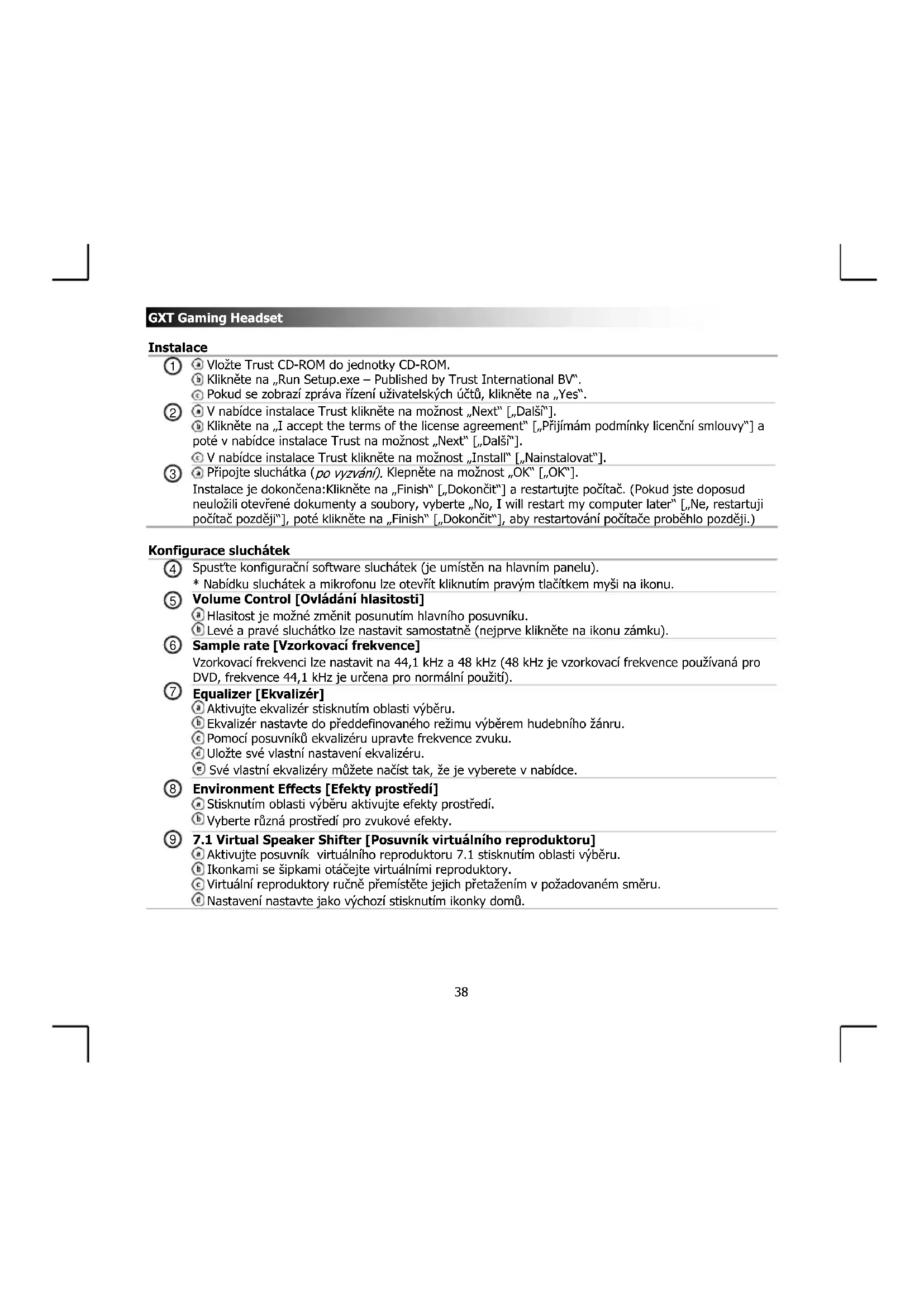 Vložte Trust CD-ROM do jednotky CD-ROM. Klikněte na „Run Setup.exe – Published by Trust International BV“. Pokud se zobrazí zpráva řízení uživatelských účtů, klikněte na „Yes“. V nabídce instalace Trust klikněte na možnost „Next“ [„Další“]. Klikněte na „I accept the terms of the license agreement“ [„Přijímám podmínky licenční smlouvy“] a poté v nabídce instalace Trust na možnost „Next“ [„Další“]. V nabídce instalace Trust klikněte na možnost „Install“ [„Nainstalovat“]. Připojte sluchátka ( po vyzvání). Klepněte na možnost „OK“ [„OK“]. Instalace je dokončena:Klikněte na „Finish“ [„Dokončit“] a restartujte počítač. (Pokud jste doposud neuložili otevřené dokumenty a soubory, vyberte „No, I will restart my computer later“ [„Ne, restartuji počítač později“], poté klikněte na „Finish“ [„Dokončit“], aby restartování počítače proběhlo později.)