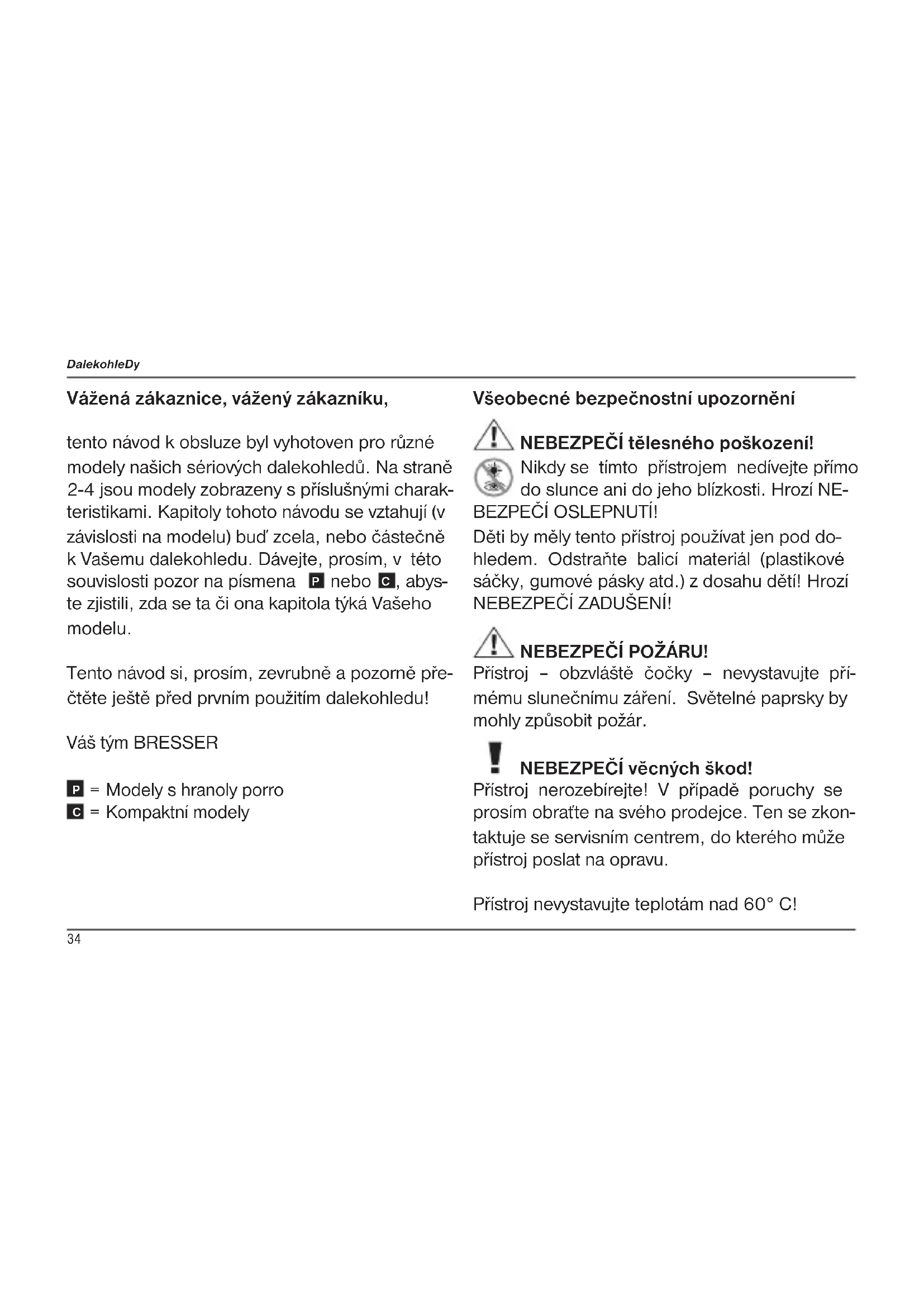 , abys- te zjistili, zda se ta či ona kapitola týká Vašeho modelu. Tento návod si, prosím, zevrubně a pozorně pře- čtěte ještě před prvním použitím dalekohledu! Váš tým BRESSER