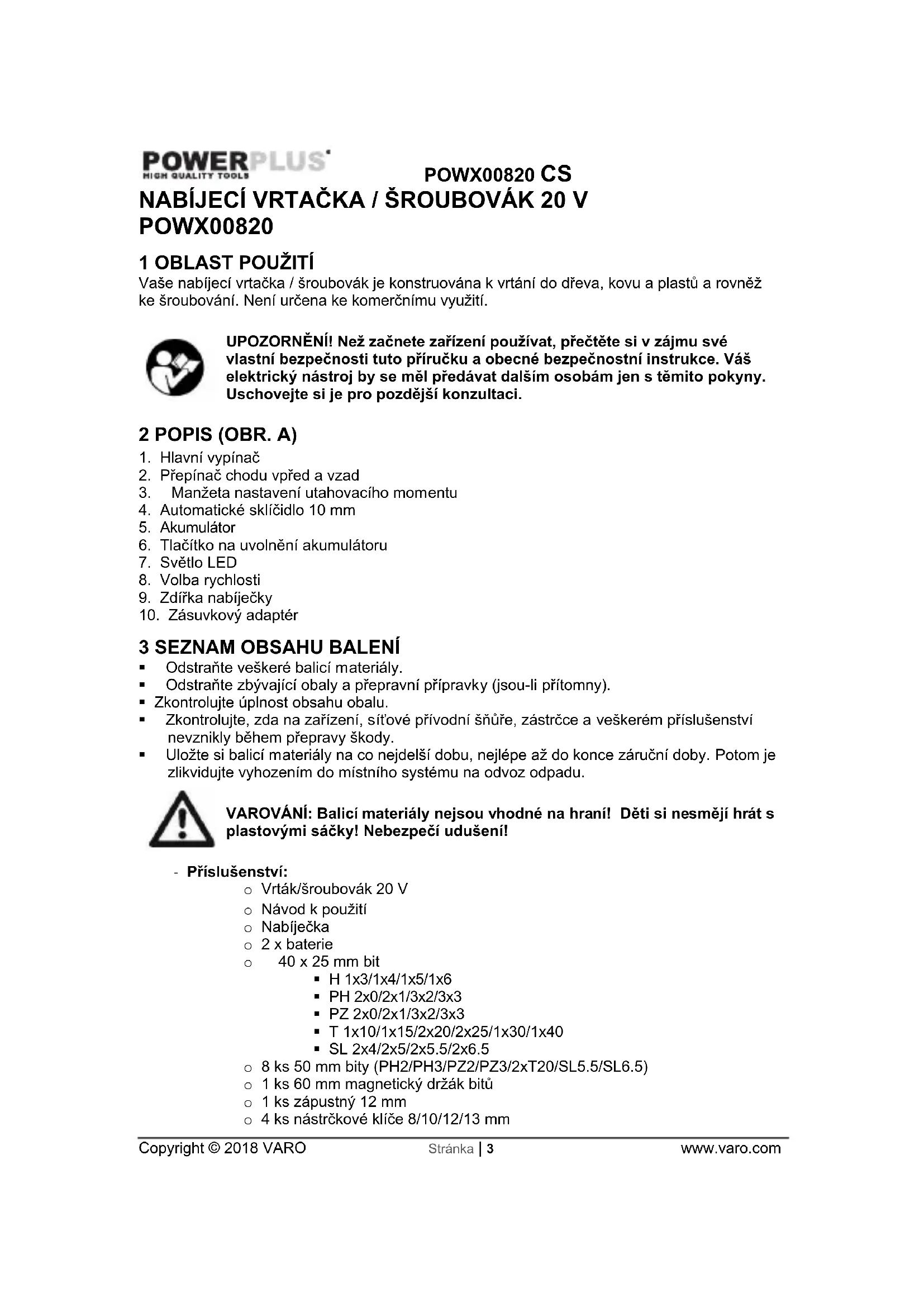 Odstraňte veškeré balicí materiály. Odstraňte zbývající obaly a přepravní přípravky (jsou-li přítomny). Zkontrolujte úplnost obsahu obalu. Zkontrolujte, zda na zařízení, síťové přívodní šňůře, zástrčce a veškerém příslušenství nevznikly během přepravy škody. Uložte si balicí materiály na co nejdelší dobu, nejlépe až do konce záruční doby. Potom je zlikvidujte vyhozením do místního systému na odvoz odpadu. VAROVÁNÍ: Balicí materiály nejsou vhodné na hraní! Děti si nesmějí hrát s plastovými sáčky! Nebezpečí udušení! - Příslušenství: o Vrták/šroubovák 20 V o Návod k použití o Nabíječka o 2 x baterie o 40 x 25 mm bit H 1x3/1x4/1x5/1x6 PH 2x0/2x1/3x2/3x3 PZ 2x0/2x1/3x2/3x3 T 1x10/1x15/2x20/2x25/1x30/1x40 SL 2x4/2x5/2x5.5/2x6.5 o 8 ks 50 mm bity (PH2/PH3/PZ2/PZ3/2xT20/SL5.5/SL6.5) o 1 ks 60 mm magnetický držák bitů o 1 ks zápustný 12 mm o 4 ks nástrčkové klíče 8/10/12/13 mmPOWX00820 CS Copyright © 2018 VARO Stránka | 4 www.varo.com o 8 ks HSS: Vrtáky (3.0/3.5/4.0/4.5/5.0/5.5/6.0/6.5 mm) o 5 ks vrtáky do kamene: Vrtáky (4.0/5.0/6.0/8.0/10.0 mm) o 5 ks vrtáky do dřeva: Vrtáky (4.0/5.0/6.0/8.0/10.0 mm) o 2 ks plochý vrták do dřeva: Vrtáky (16.0/20.0 mm) Jestliže některé díly chybí nebo jsou poškozeny, obraťte se na svého obchodníka. 4 SYMBOLY V této příručce a/nebo na stroji se používají následující symboly: Znamená riziko zranění osob nebo poškození nástroje.