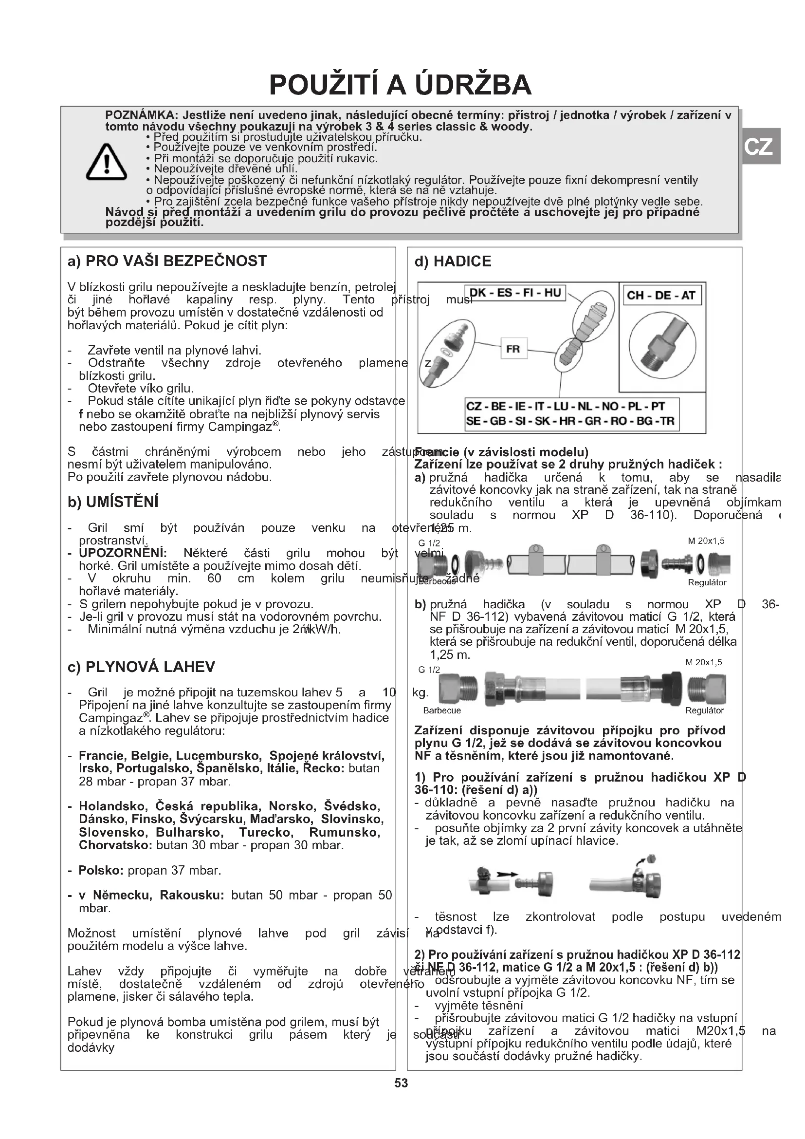 kastas i naturen eller eldas upp: förekomsten av vissa farliga ämnen i elektrisk och elektronisk utrustning kan vara skadlig för miljön och eventuellt påverka människors hälsa.a) PRO VAŠI BEZPEČNOST Vblízkostigrilunepoužívejteaneskladujtebenzín,petrolej či jiné hořlavé kapaliny resp. plyny. Tento přístroj musí býtbĕhemprovozuumístĕnvdostatečnévzdálenostiod hořlavýchmateriálů.Pokud je cítit plyn: - Zavřeteventilnaplynovélahvi. - Odstraňte všechny zdroje otevřeného plamene z blízkosti grilu. - Otevřetevíkogrilu. - Pokudstálecítíteunikajícíplynřiďtesepokynyodstavce fneboseokamžitĕobraťtenanejbližšíplynovýservis nebo zastoupení firmy Campingaz