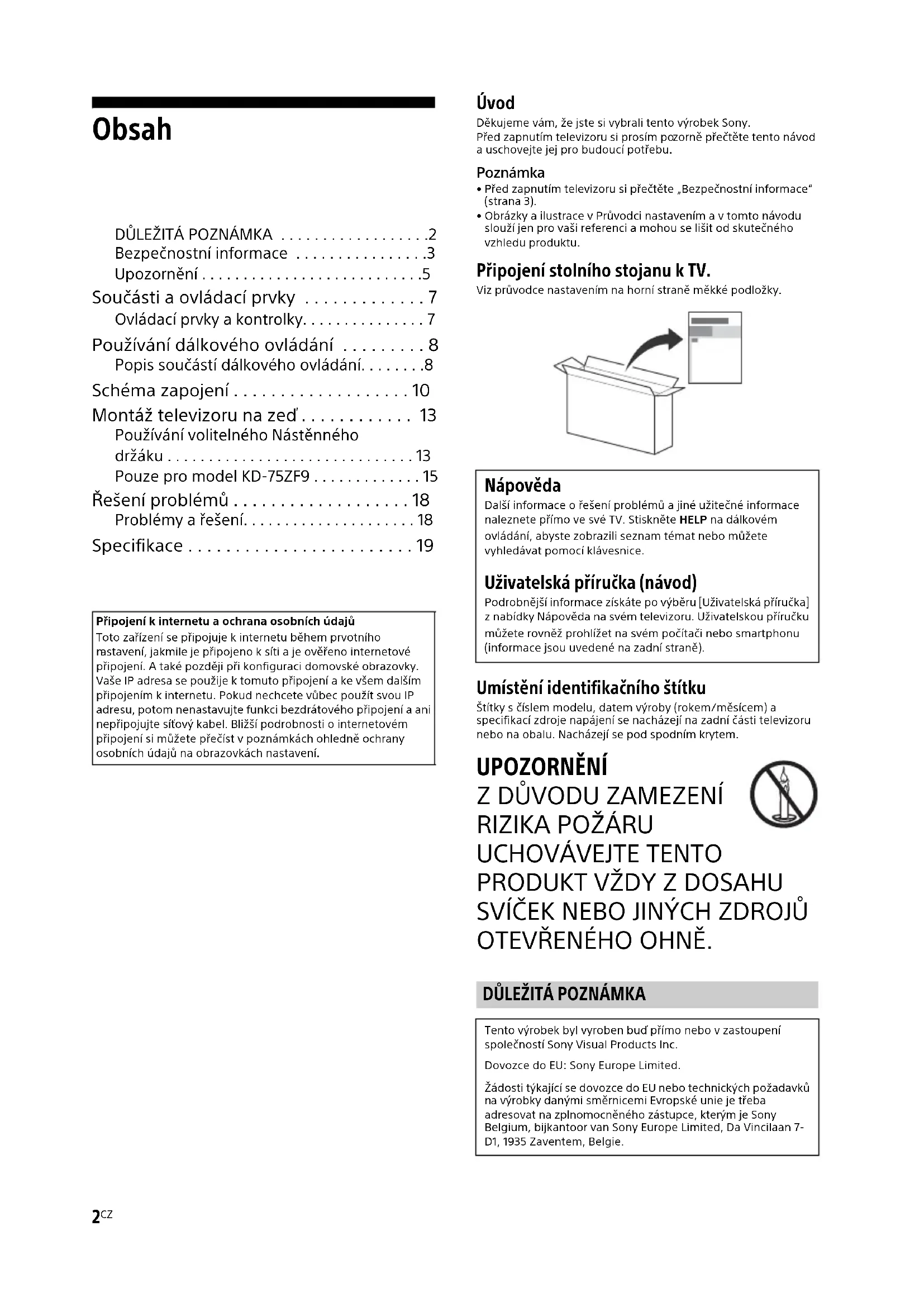 OTEVŘENÉHO OHNĚ. Připojení k internetu a ochrana osobních údajůToto zařízení se připojuje k internetu během prvotního astavení, jakmile je připojeno k síti a je ověřeno internetové připojení. A také později při konfiguraci domovské obrazovky. Vaše IP adresa se použije k tomuto připojení a ke všem dalším připojením k internetu. Pokud nechcete vůbec použít svou IP adresu, potom nenastavujte funkci bezdrátového připojení a ani nepřipojujte síťový kabel. Bližší podrobnosti o internetovém připojení si můžete přečíst v poznámkách ohledně ochrany osobních údajů na obrazovkách nastavení. Nápověda Další informace o řešení problémů a jiné užitečné informace naleznete přímo ve své TV. Stiskněte HELP na dálkovém ovládání, abyste zobrazili seznam témat nebo můžete vyhledávat pomocí klávesnice. Uživatelská příručka (návod) Podrobnější informace získáte po výběru [Uživatelská příručka] z nabídky Nápověda na svém televizoru. Uživatelskou příručku můžete rovněž prohlížet na svém počítači nebo smartphonu (informace jsou uvedené na zadní straně).