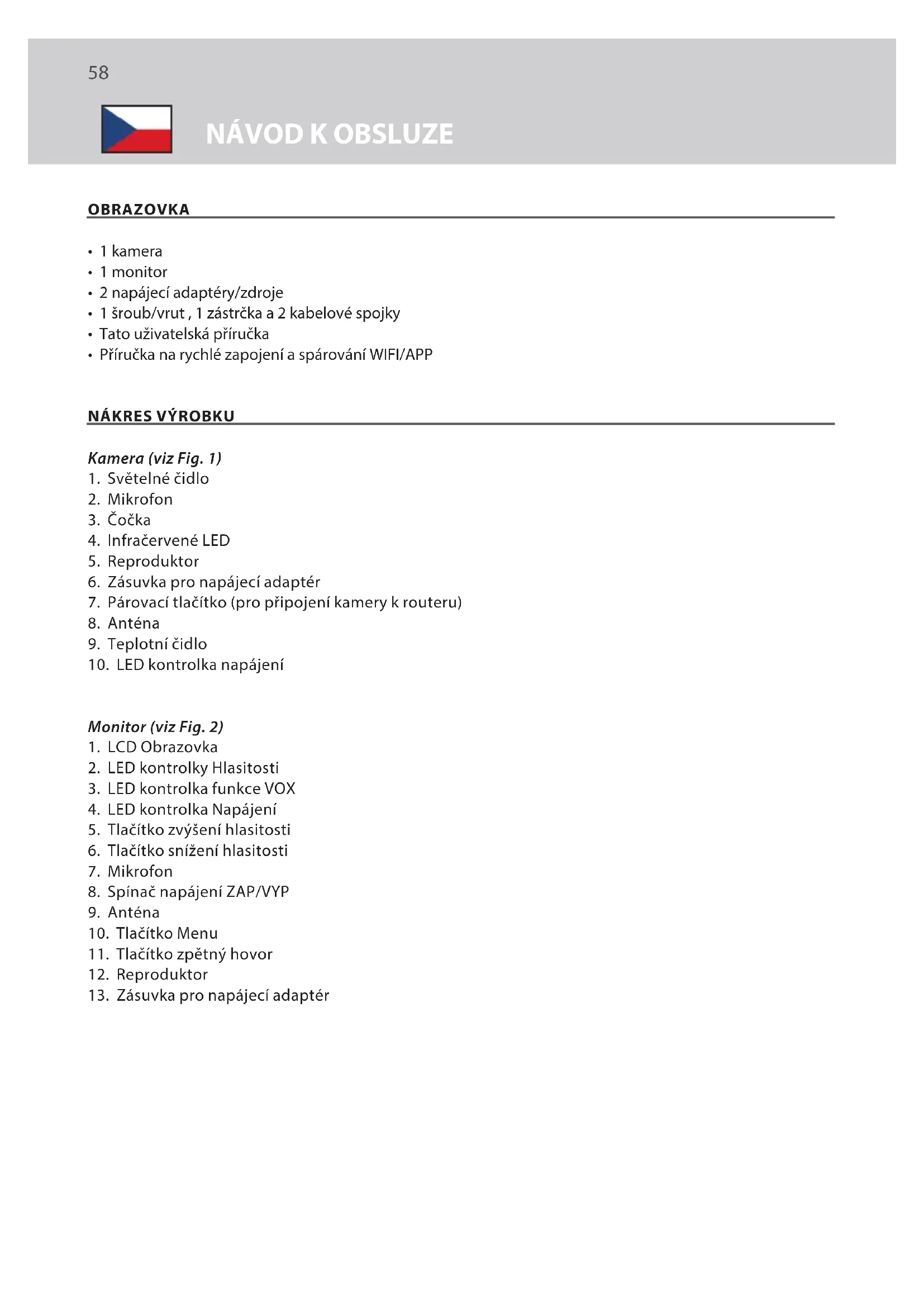 NASTAVENÍ1. NASTAVENÍ KAMERY A MONITORU1.1 Napájení kameryZasuňte příslušný konec kabelu přiloženého napájecího adaptéru do zdířky v kameře a adaptér zapojte do síťové zásuvky. Kamera se po připojení automaticky zapne. (viz Fig. 3).POZNÁMKA: Pro kameru použijte adaptér označený Output: 5V DC 2.0A.1.2 Umístění kameryUmístěte kameru na vhodné místo, namiřte čočku směrem ke sledované oblasti.POZNÁMKA: Neotáčejte ručně kamerou! Otáčení hlavou kamery musí být prováděno výhradně pomocí menu monitor(viz Fig. 11).1.3 Noční viděníKamera je pro zobrazení jasného obrazu při temnotě vybavena osmi LED diodami o vysoké intenzitě. Když světelné čidlo zjistí nízkou úroveň okolního světla, jsou LED automaticky aktivovány.1.4 Měření pokojové teplotyTeplotní čidlo měří pokojovou teplotu u kamery. Teplota bude zobrazena na obra-zovce monitoru.1.5 Napájení monitoruMonitor má v sobě zabudovanou 3.7V 2600mAh (Li-ion) baterii a používá běžné domácí síťové napájení.1. Zasuňte příslušný konec kabelu přiloženého napájecího adaptéru do zdířky v kameře a adaptér zapojte do síťové zásuvky. (viz Fig. 4).2. Posuňte spínač napájení do pozice ‘ON (ZAP)’(viz Fig. 4).POZNÁMKA 1: Pro monitor použijte adaptér označený OUTPUT (VÝSTUP): 5V DC 1.0A. POZNÁMKA 2: Pokud je napájení připojeno k monitoru, LED kontrolka “Power” se zeleně rozsvítí.Pokud je baterie vybitá, LED kontrolka “Power” začne červeně blikat.Když se baterie nabíjí, LED kontrolka “Power” svítí červeně.Jakmile je baterie plně nabitá, LED kontrolka “Power” zhasne (pokud je monitor vyp-nutý)POZNÁMKA 3: Pokud jsou monitor a kamera od sebe příliš vzdáleny, bude na LCD obrazovce zobrazeno “” (mimo dosah - out of range)2. TLAČÍTKA MONITORU2.1 Nastavení hlasitostiPro nastavení požadované úrovně hlasitosti stiskněte zesílit, nebo zeslabit (viz Fig. 5).2.2 Funkce zpětného hovoruPro hovor pomocí kamerové jednotky stiskněte a držte tlačítko zpětného hovoru(talk back button), na obrazovce se zobrazí příslušné ikony (viz Fig. 6). CZ60