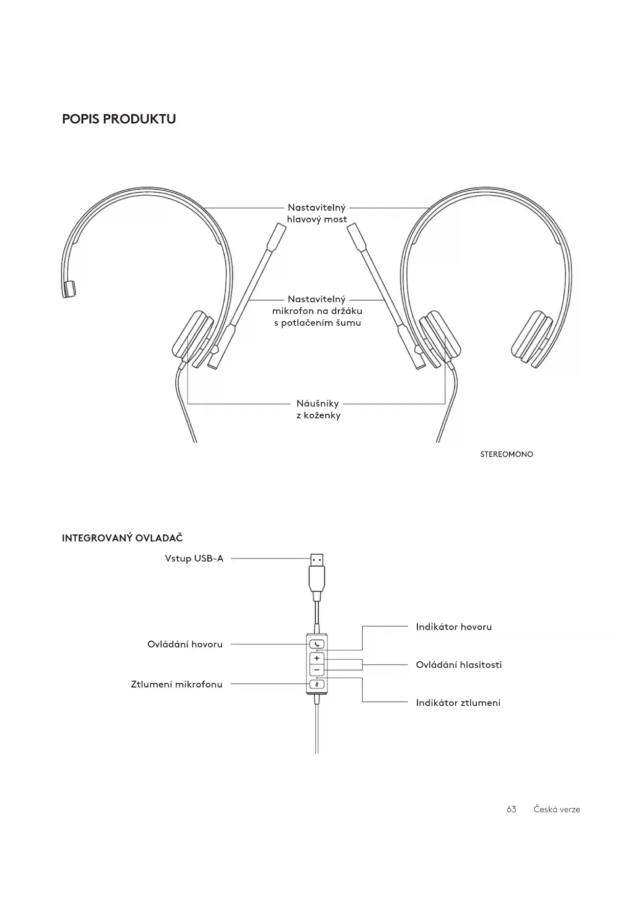 1 Držák mikrofonu je otočný vrozmezí 270 stupňů. Mikrofon lze nasadit na levou nebo pravou stranusoupravy. 2 Držák mikrofonu je exibilní – přizpůsobte si jeho polohu za účelem lepšího snímání hlasu. OBSAH BALENÍ MONO 1 Náhlavní souprava sintegrovaným ovladačem akonektorem USB-A 2 Uživatelská dokumentace STEREO 1 Náhlavní souprava sintegrovaným ovladačem akonektorem USB-A 2 Uživatelská dokumentace USB-A USB-A