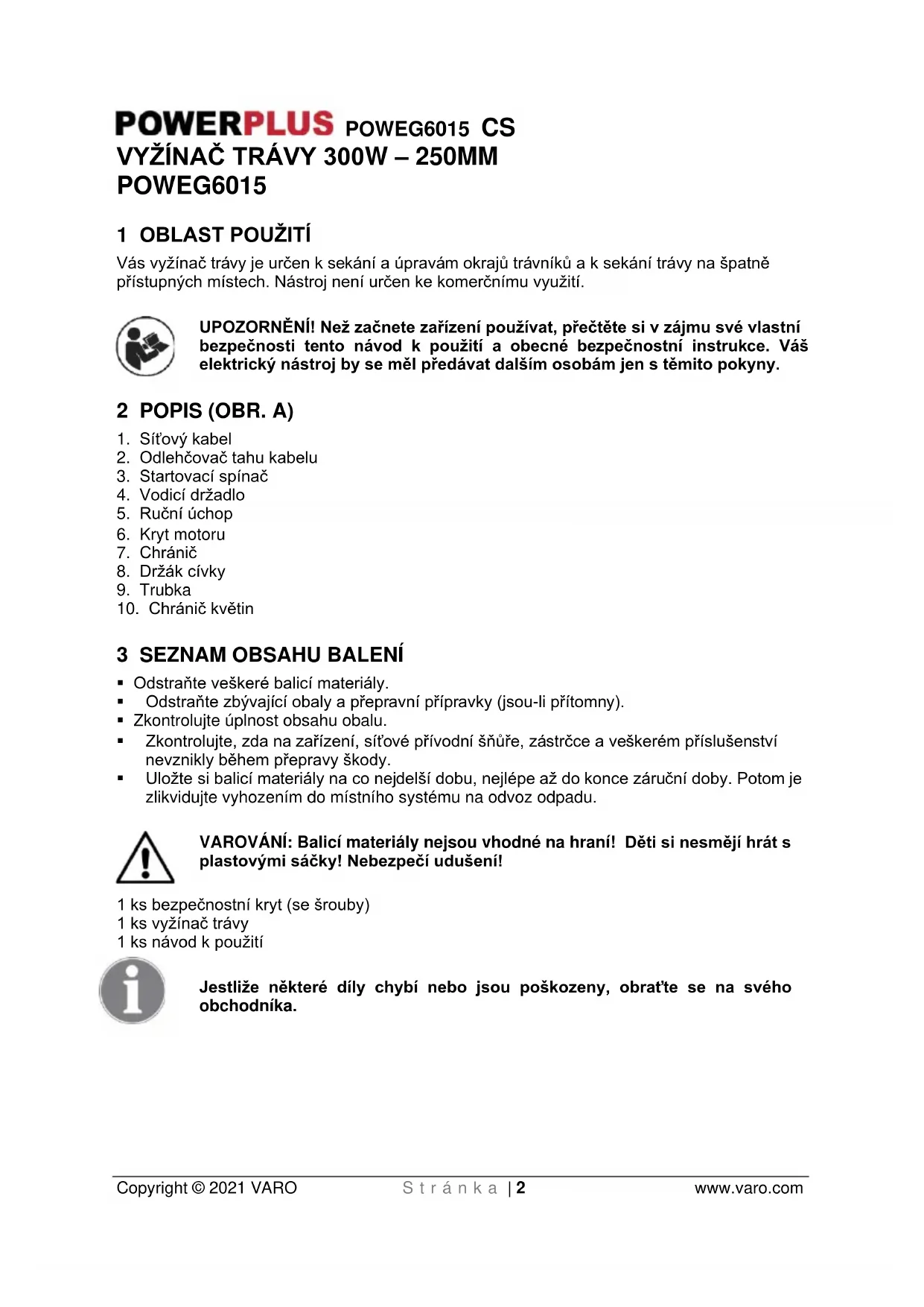 VARO-Vic. Van Rompuy N.V. - Joseph Van Instraat 9 - BE2500 Lier - BELGIUM, prohlašuje, že Výrobek: Vyžínač trávy Výrobní značka: PowerPlus Model: POWEG6015 je ve shodě se základními požadavky a ostatními relevantními ustanoveními příslušných evropských směrnic založených na aplikaci evropských harmonizovaných norem. Jakákoliv neschválená úprava přístroje vede ke ztrátě platnosti tohoto prohlášení. Evropské směrnice (včetně, nastanou-li, jejich změn a doplňků až do data podpisu): 2011/65/EU 2006/42/EC 2014/30/EU 2000/14/EC Annex VI LwA Measured 91dB(A) Guaranteed 96dB(A) Notified Body TuV Sud - DE Evropské harmonizované normy (včetně, nastanou-li, jejich změn a doplňků až do data podpisu): EN60335-1 : 2012 EN50636-2-91 : 2014 EN55014-1 : 2017 EN55014-2 : 2015 EN61000-3-2 : 2014 EN61000-3-3 : 2013 Držitel technické dokumentace: Philippe Vankerkhove, VARO - Vic. Van Rompuy N.V. Níže podepsaný jedná jménem vedení společnosti, Philippe Vankerkhove Regulativní postupy - Manažer pro dohled nad řádným jednáním 26/05/2021, Lier-BelgiumPOWEG6015 SL Avtorske pravice © 2021 VARO Stran | 1 www.varo.com 1 UPORABA ........................................................................................ 2