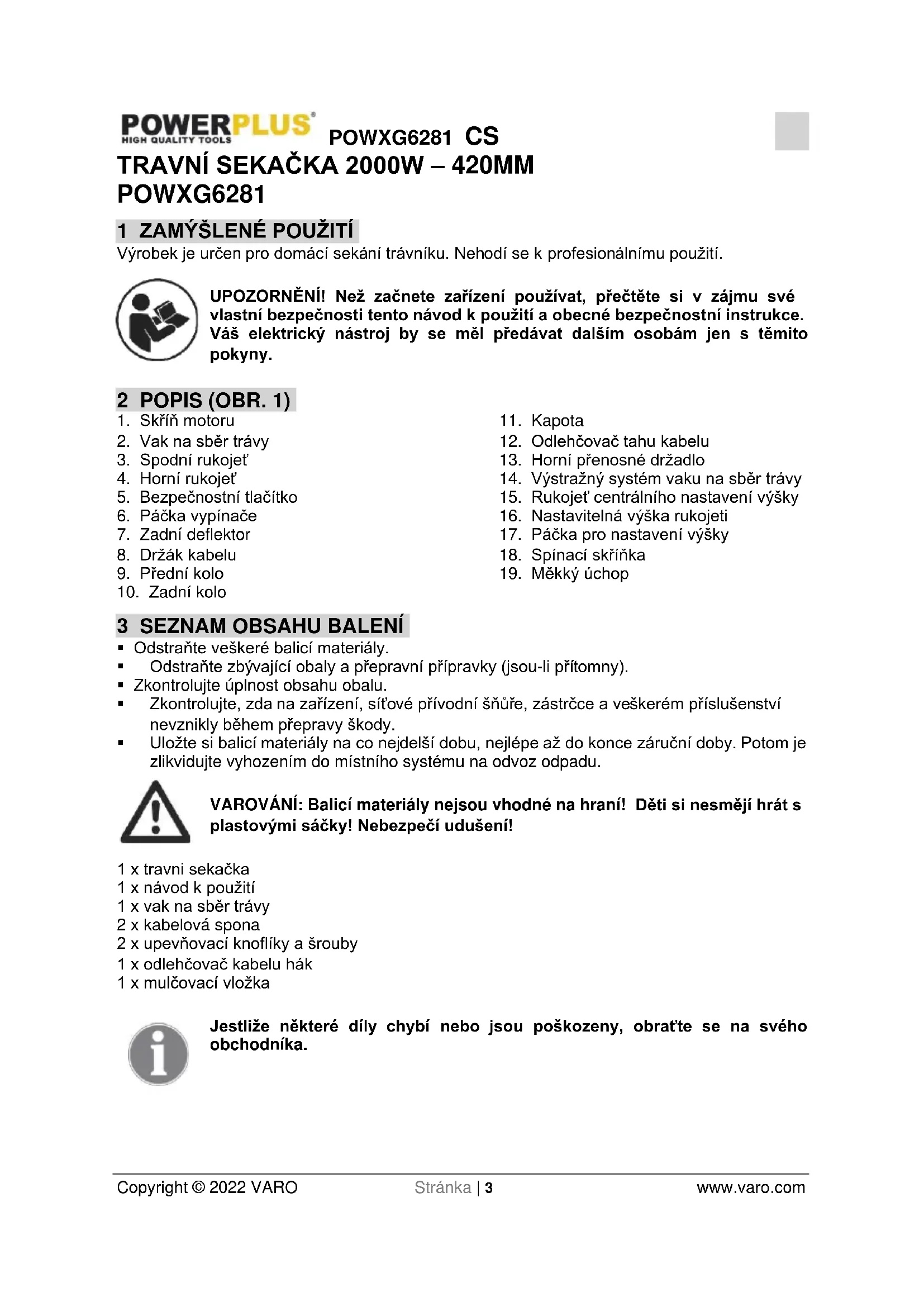 VÝSTRAHA! Nezapínejte zařízení, dokud není zcela smontováno. Před zapnutím zařízení vždy zkontrolujte připojovací kabel, zda nejeví známky poškození. Lze používat pouze nepoškozený připojovací kabel. Poznámka: Poškozené propojovací kabely jsou velmi nebezpečné! Jestliže se pokusíte spustit sekačku ve vysoké trávě, motor se může přehřát a poškodit.POWXG6281 CS Copyright © 2022 VARO Stránka | 10 www.varo.com