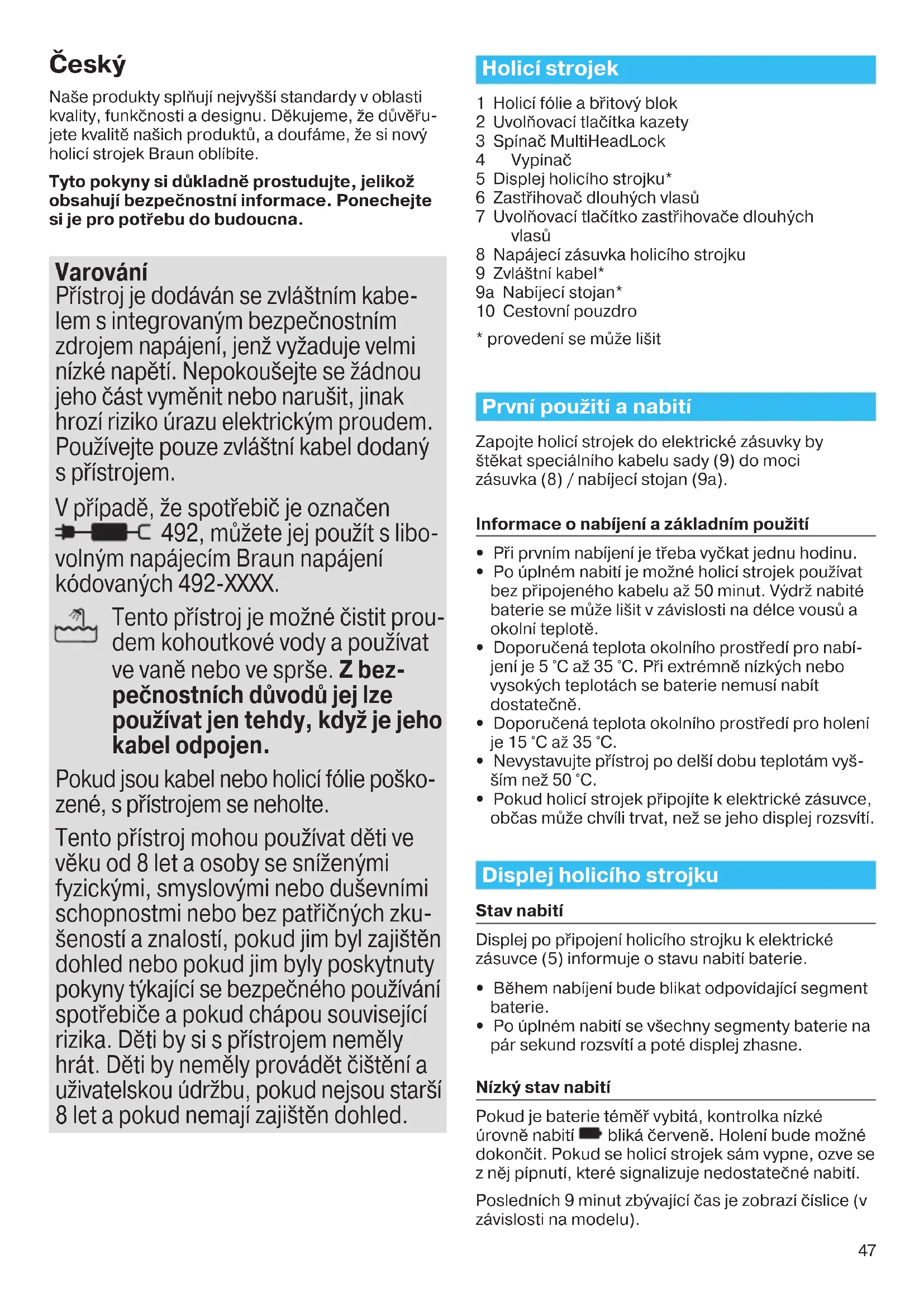 Golarka wyłącza się przy w pełni naładowanym akumulatorze. Folia i ostrza są zużyte, a to sprawia, że potrzeba więcej mocy niż silnik jest w stanie dostarczyć. Urządzenie wyłącza się. – Wymienić blok ostrzy. – Regularnie oliwić system golący, zwłaszcza po czyszczeniu samą wodą. 91154595_Series_9-2_Solo_Euro_S6-96.indd 46 28.11.16 13:0947 Česk Naše produkty splňují nejvyšší standardy v oblasti kvality, funkčnosti a designu. Děkujeme, že důvěřu- jete kvalitě našich produktů, a doufáme, že si nový holicí strojek Braun oblíbíte. Tyto pokyny si důkladně prostudujte, jelikož obsahují bezpečnostní informace. Ponechejte si je pro potřebu do budoucna. Varování Přístroj je dodáván se zvláštním kabe- lem s integrovaným bezpečnostním zdrojem napájení, jenž vyžaduje velmi nízké napětí. Nepokoušejte se žádnou jeho část vyměnit nebo narušit, jinak hrozí riziko úrazu elektrickým proudem. Používejte pouze zvláštní kabel dodaný s přístrojem. V případě, že spotřebič je označen 492, můžete jej použít s libo- volným napájecím Braun napájení kódovaných 492-XXXX. Tento přístroj je možné čistit prou- dem kohoutkové vody a používat ve vaně nebo ve sprše. Z bez- pečnostních důvodů jej lze používat jen tehdy, když je jeho kabel odpojen. Pokud jsou kabel nebo holicí fólie poško- zené, s přístrojem se neholte. Tento přístroj mohou používat děti ve věku od 8 let a osoby se sníženými fyzickými, smyslovými nebo duševními schopnostmi nebo bez patřičných zku- šeností a znalostí, pokud jim byl zajištěn dohled nebo pokud jim byly poskytnuty pokyny týkající se bezpečného používání spotřebiče a pokud chápou související rizika. Děti by si s přístrojem neměly hrát. Děti by neměly provádět čištění a uživatelskou údržbu, pokud nejsou starší 8 let a pokud nemají zajištěn dohled. Holicí strojek 1 Holicí fólie a břitový blok 2 Uvolňovací tlačítka kazety 3 Spínač MultiHeadLock 4 Vypínač 5 Displej holicího strojku* 6 Zastřihovač dlouhých vlasů 7 Uvolňovací tlačítko zastřihovače dlouhých vlasů 8 Napájecí zásuvka holicího strojku 9 Zvláštní kabel* 9a Nabíjecí stojan* 10 Cestovní pouzdro